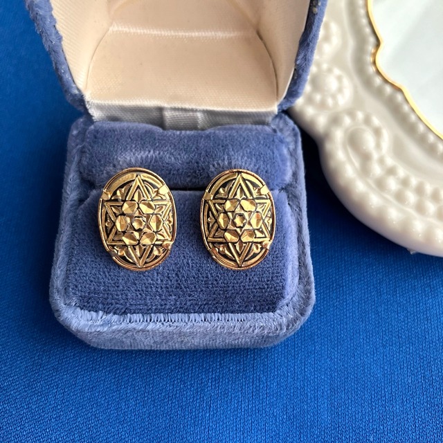 落ち着いたゴールドメタルの土台にブラック系のラインで濃淡をつけた、スペインの伝統的な細工のデザインが、とても素敵なヴィンテージイヤリングです。 【年代/国】1960-70年代/スペイン 【実寸】全長1.6cm 【重さ】3g(片方) 【金具】ゴールドメタル/クリップイヤリング 【状態】経年による裏面の金属の多少の変色、落ち着いた雰囲気はありますが、全体的には良好なコンディションです。