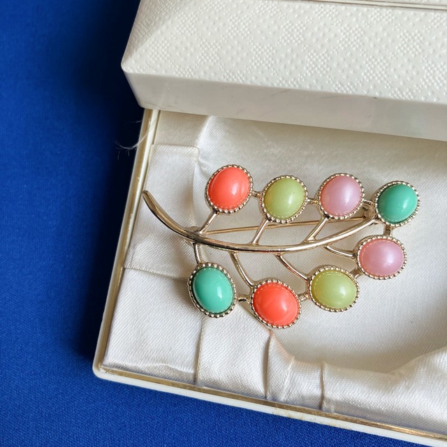 1949年に設立されたジュエリーメーカー”Sarah Coventry”(サラコベントリー)の、レトロなパステルカラーカボションとゴールドメタルの小枝と実のような愛らしくお洒落なデザインがとても素敵なヴィンテージブローチです。 1973年の"Candy Land"というシリーズです。 【年代/国】1970年代/アメリカ 【刻印】©SARAH COV 【実寸】約6cm 【重さ】18g 【金具】回転ピン/ゴールドメタル 【状態】良好なコンディションです。