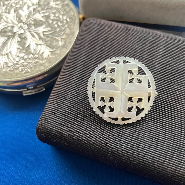 マザーオブパール(白蝶貝)に手作業で細やかに彫られたクロスのデザインが、とても素敵なヴィンテージブローチです。 ベツレヘムで昔から作られている貴重な伝統工芸品です。 【年代/国】1960-70年代 【実寸】2.7cm 【重さ】4g 【金具】回転ピン/シルバーメタル 【状態】裏面のブローチピンを留めている接着剤のはみ出しがありますが、それ以外は良好なコンディションです。