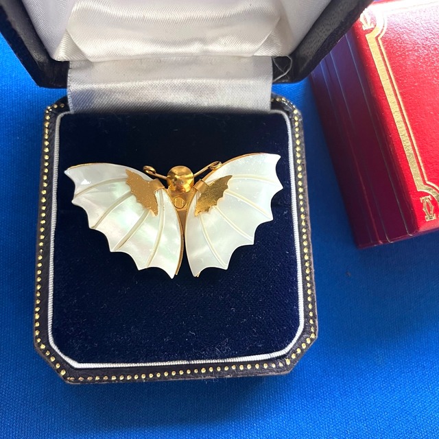ゴールドメタルに美しいマザーオブパールが使われた、とても素敵な蝶のデザインのヴィンテージブローチです。 【年代/国】1970-80年代/アメリカ 【実寸】2.5cm×4.3cm 【金具】バネピン/ゴールドメタル 【重さ】4g 【状態】ブローチ針に曲がりがありますが、使用に問題はありません。 金属に目立たない程度の小傷があります。 シェルパーツに元々の色むらや小傷があります。