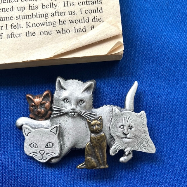 マットなシルバー、コパー、ゴールドメタルの色合いの違いがユニークな、猫たちのデザインが、とてもスペシャルで素敵なヴィンテージブローチです。 裏面は黒色の加工になっています。 【年代/国】1980-90年代/アメリカ 【実寸】6cm×3.8cm 【重さ】25g 【金具】回転ピン 【状態】表面や裏面の細かな小傷などはありますが、気になるものではありません。 ヴィンテージの雰囲気が好きな方におすすめです。