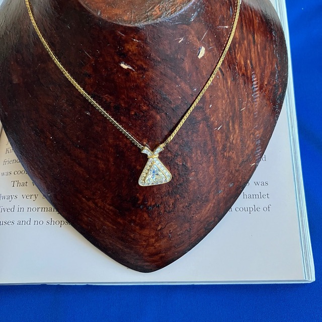 1956年にイギリスで設立されたジュエリーメーカー"Atwood and Sawyer"の、大粒の三角のクリアラインストーンがアクセントになったとても素敵なヴィンテージネックレスです。 フラットなチェーンや、装飾的な留め具もさりげなくお洒落です。 【年代/国】1970-80年代/イギリス 【刻印】A&S 【実寸】全長40cm・トップ2.8cm×1.8cm 【重さ】11g 【金具】引き輪/ゴールドメタル 【状態】経年による金属やラインストーンの多少の落ち着いた風合いは見られますが、全体的には良好なコンディションです。