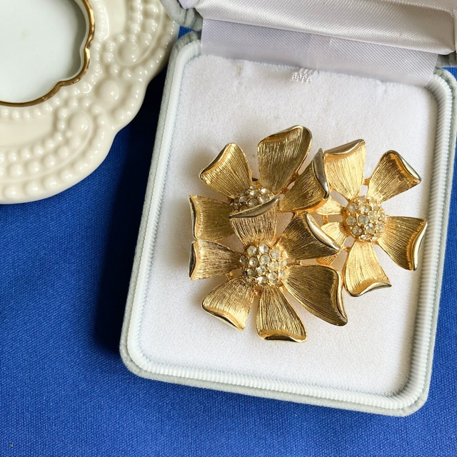 加工されたゴールドメタルに小粒のクリアラインストーンで飾られた、立体的な花びらのフラワーデザインが、とても素敵なブローチです。 ※お揃いのイヤリングがあります(別売り) 経年によりイヤリングとブローチの色合いがわずかに異なります。 【年代/国】1950-60年代/アメリカ 【実寸】5cm 【重さ】27g 【金具】回転ピン 【状態】裏面にわずかな変色などは見られますが、良好なコンディションです。
