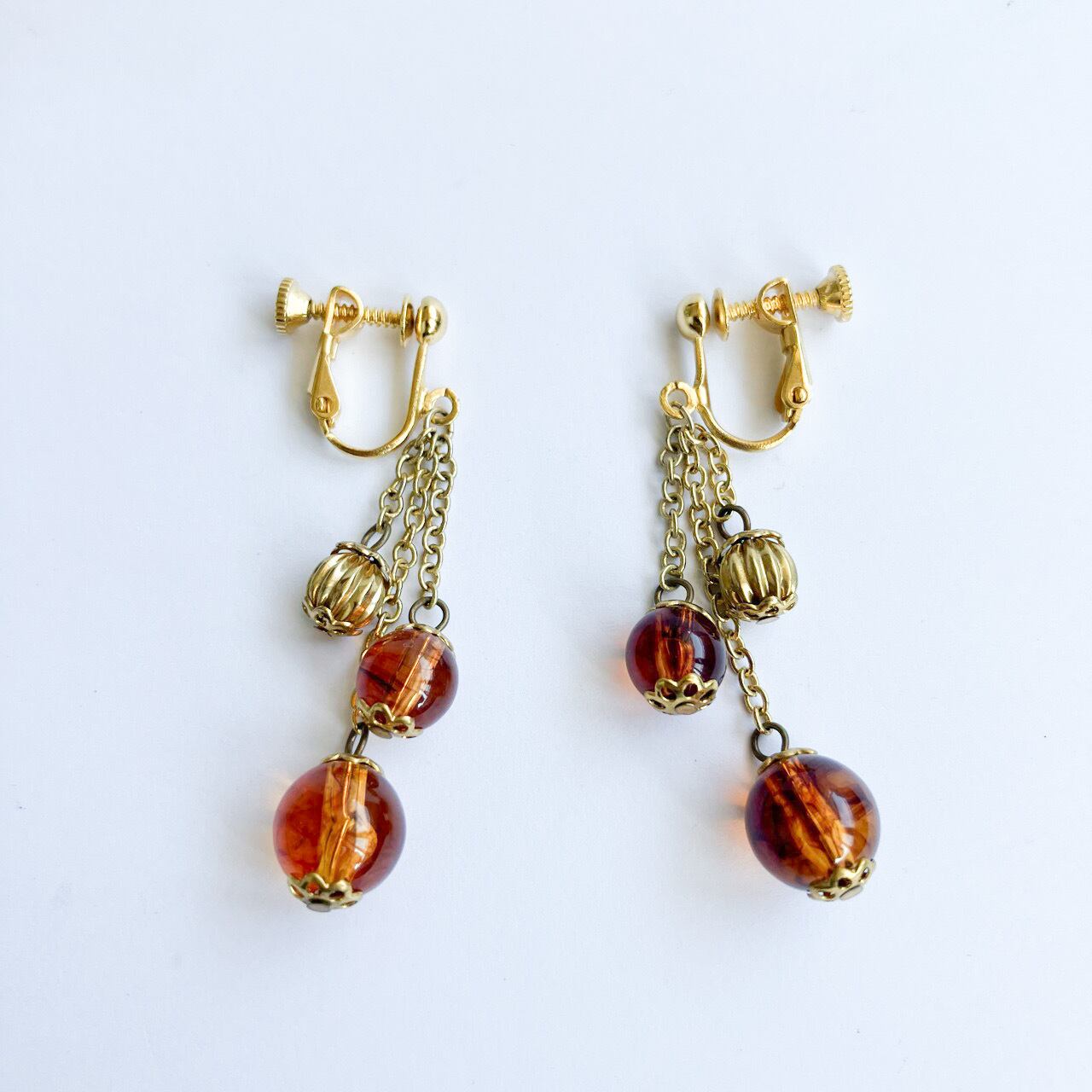 よく見ると少しマーブルになった琥珀色ビーズと、アンティークスタイルのゴールドビーズが、チェーンで揺れるデザインがとても素敵なヴィンテージイヤリングです。