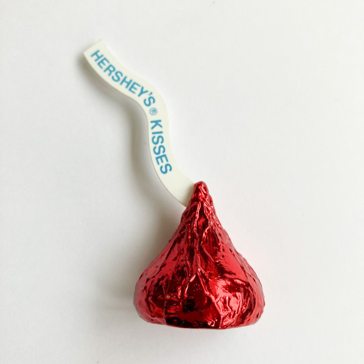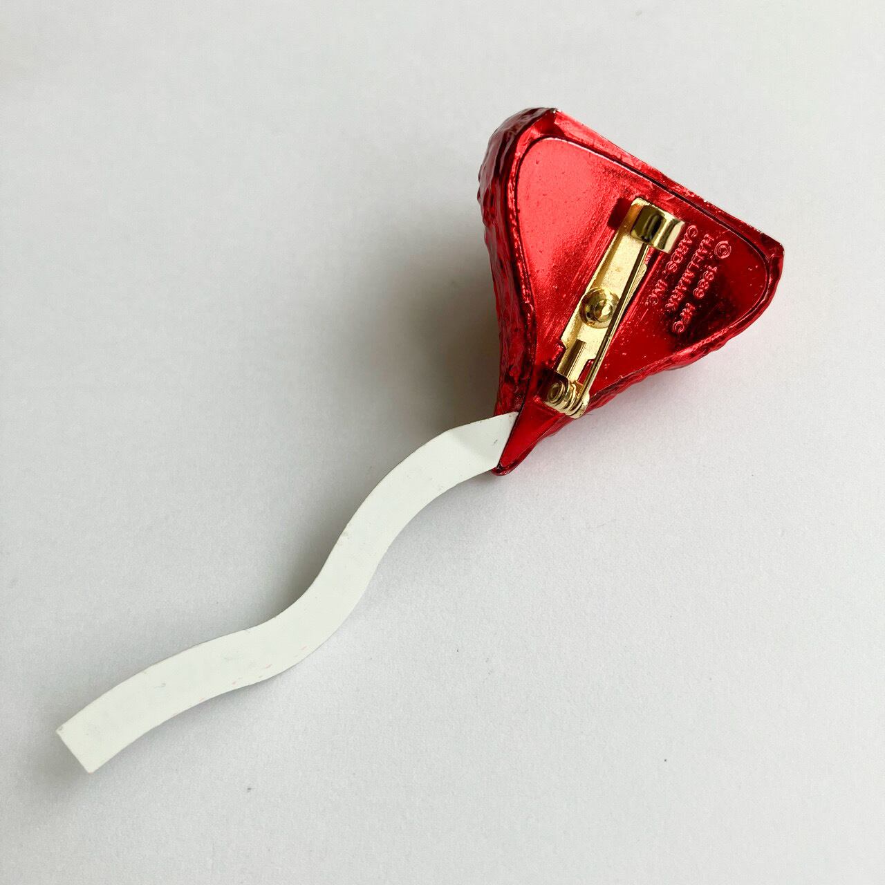 アメリカの老舗チョコレートメーカー"HERSHEY'S"(ハーシーズ)の、メタリックレッドのリアルなキスチョコのデザインが、とてもユニークで素敵なヴィンテージブローチです。