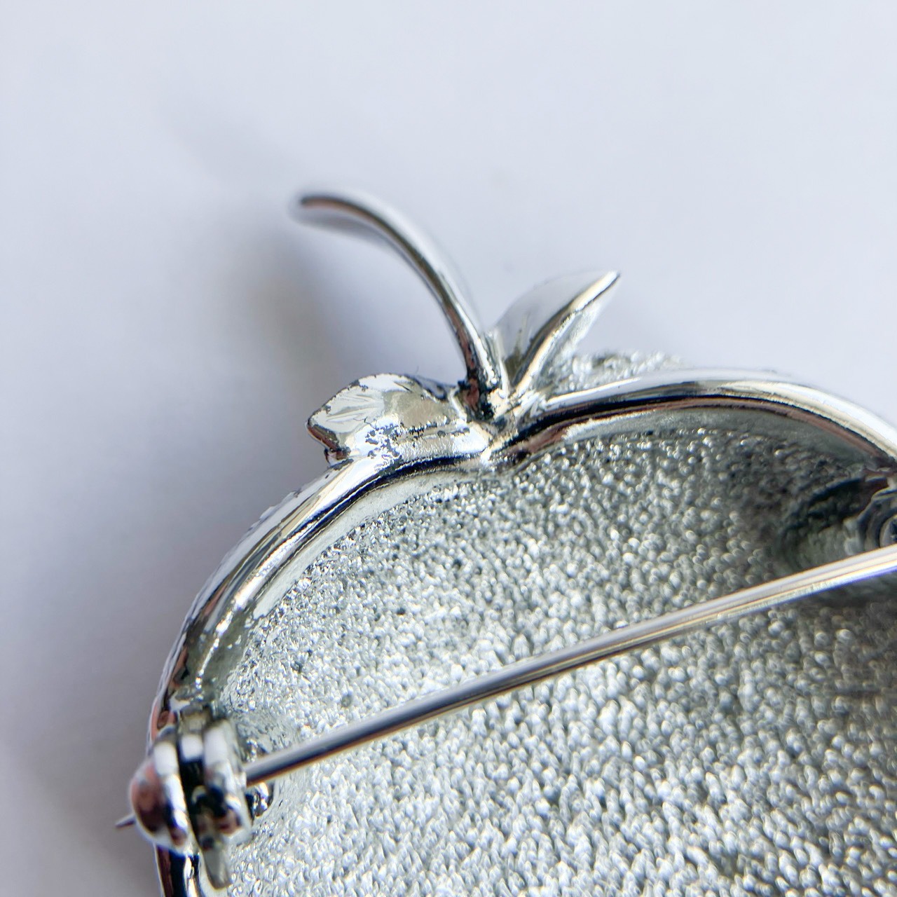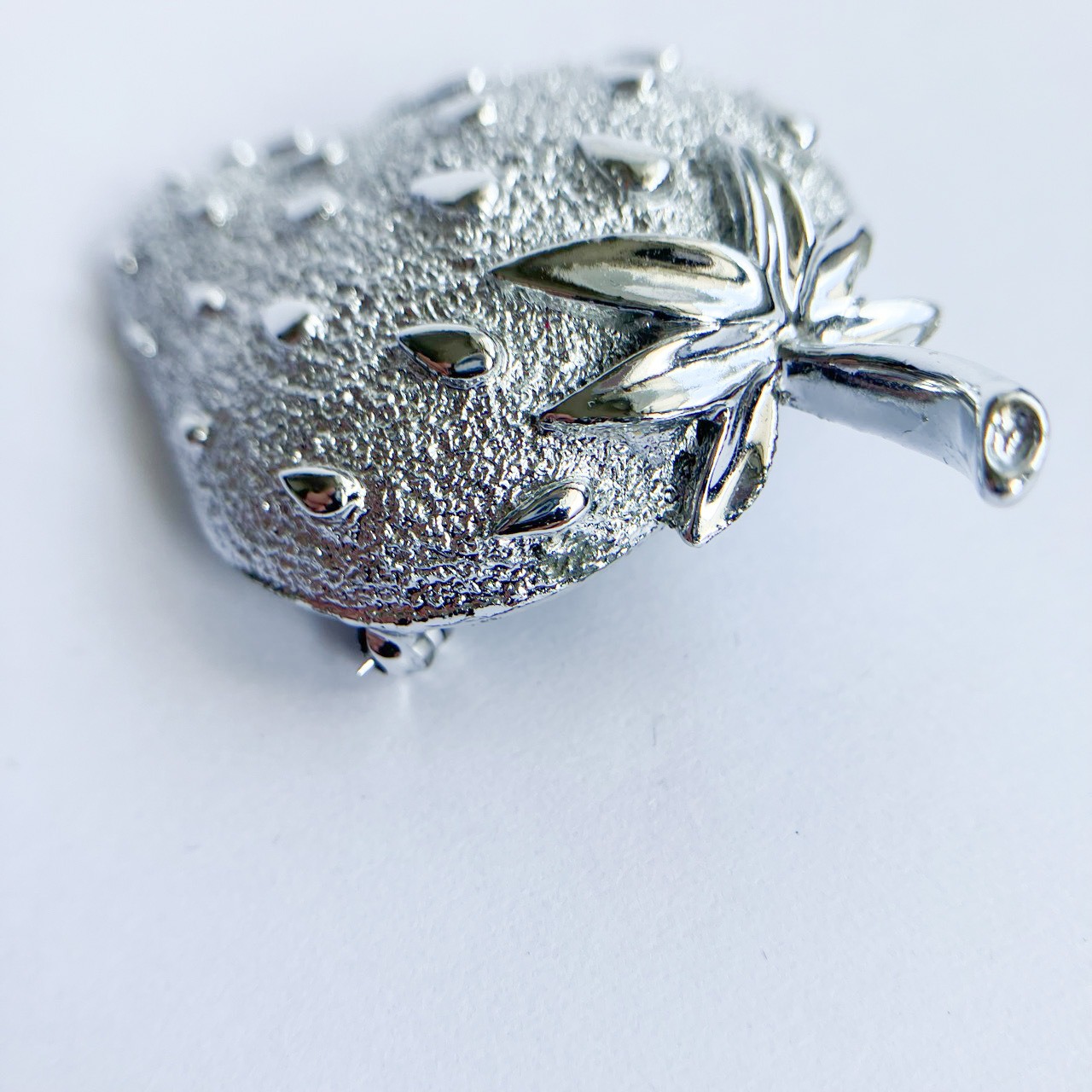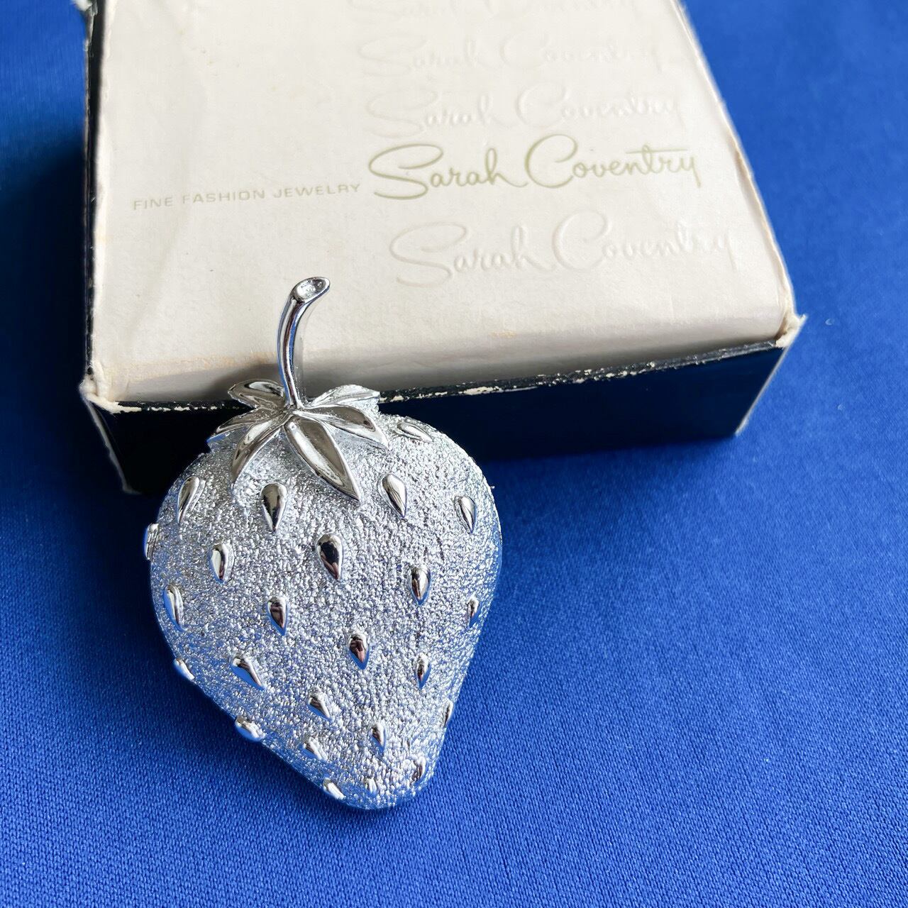 1949年に設立されたジュエリーメーカー”Sarah Coventry”(サラコベントリー )の、加工と艶のシルバーメタルの、立体的なイチゴのデザインがとても素敵なヴィンテージブローチです。