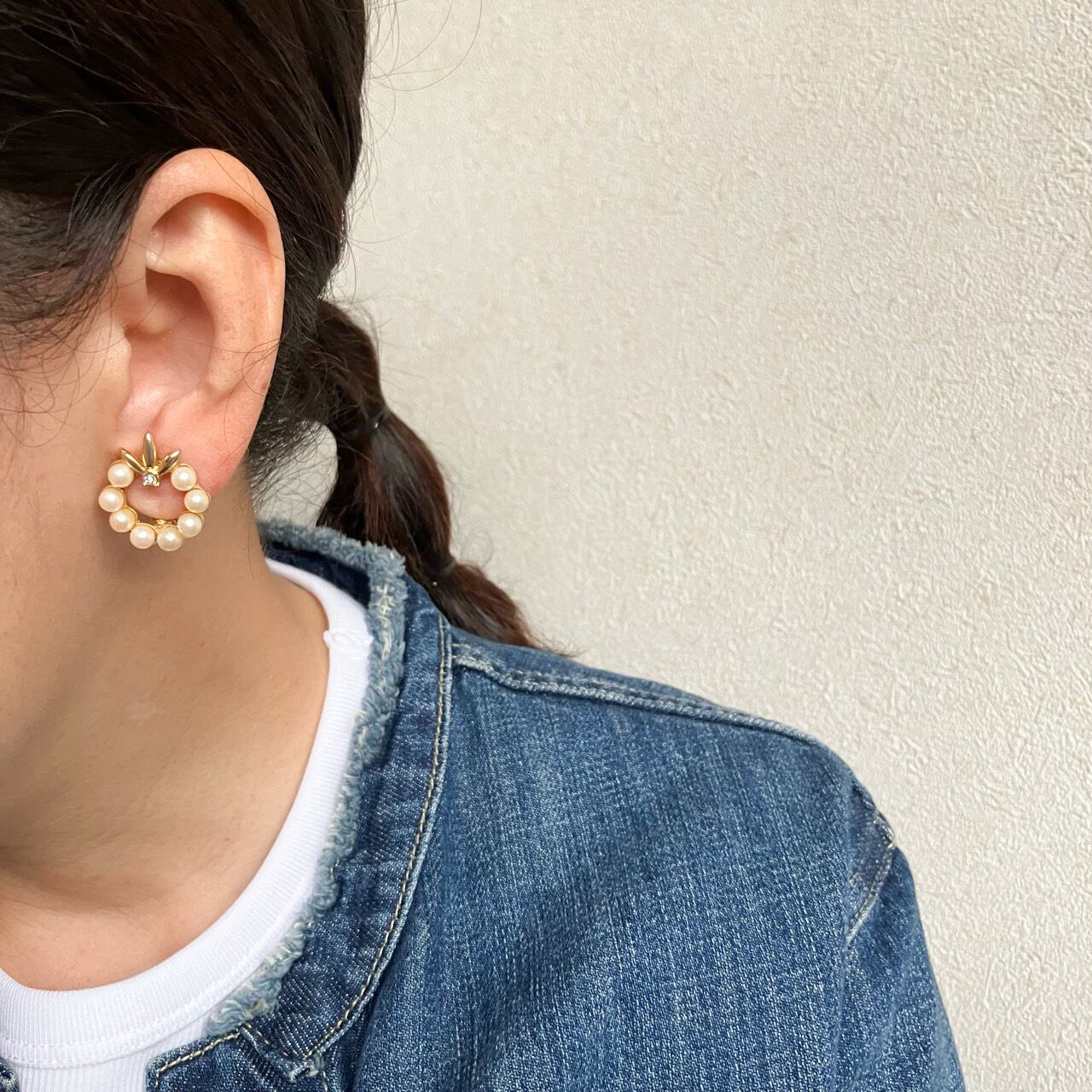 ゴールドメタルと小粒のクリアラインストーンの飾りがついた土台に、パールビーズでサークル型にデザインされた、とても素敵なヴィンテージイヤリングです。