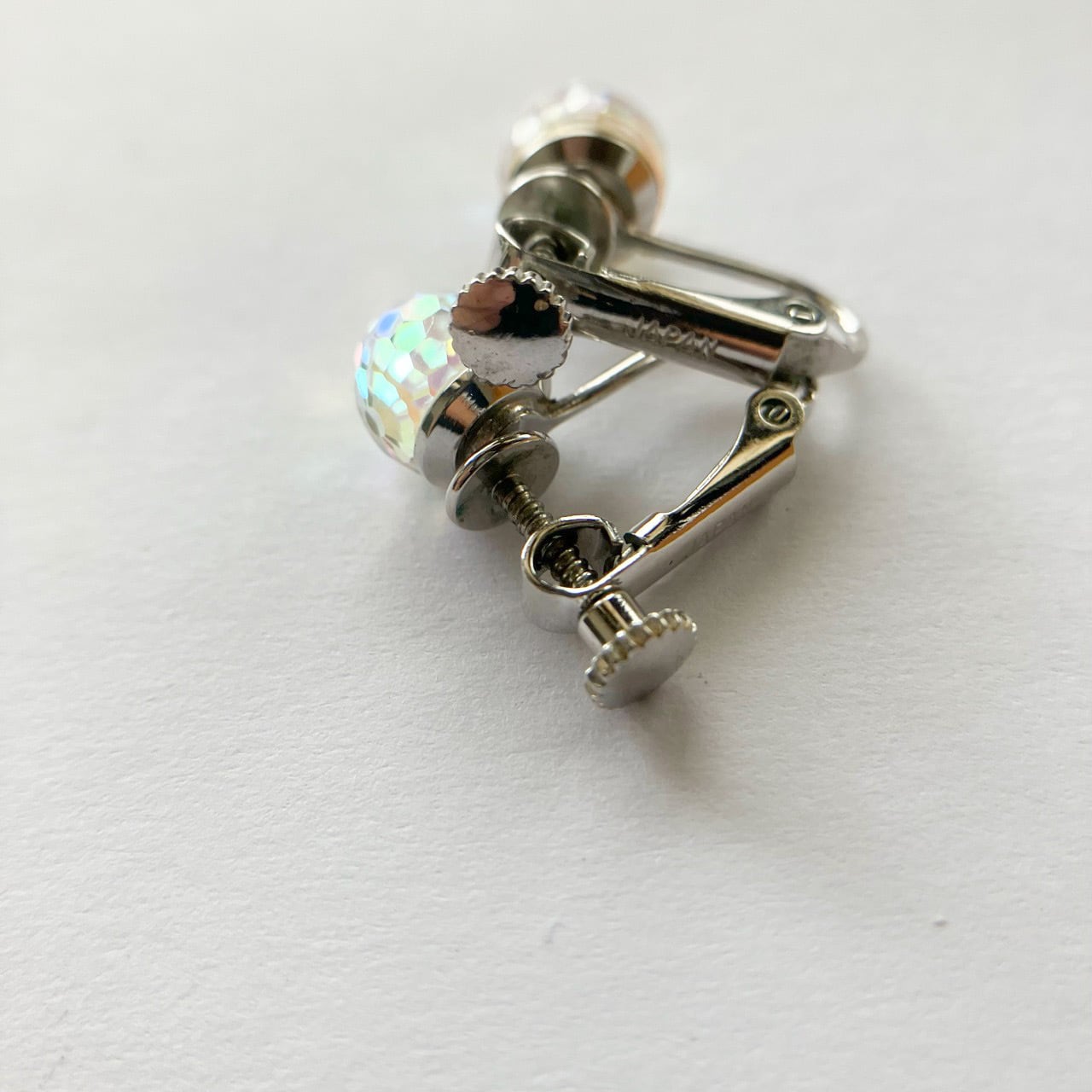 オーロラ加工に細かいカットが美しいクリアビーズで、シンプルながら存在感があるお洒落なデザインが、とても素敵なヴィンテージイヤリングです。