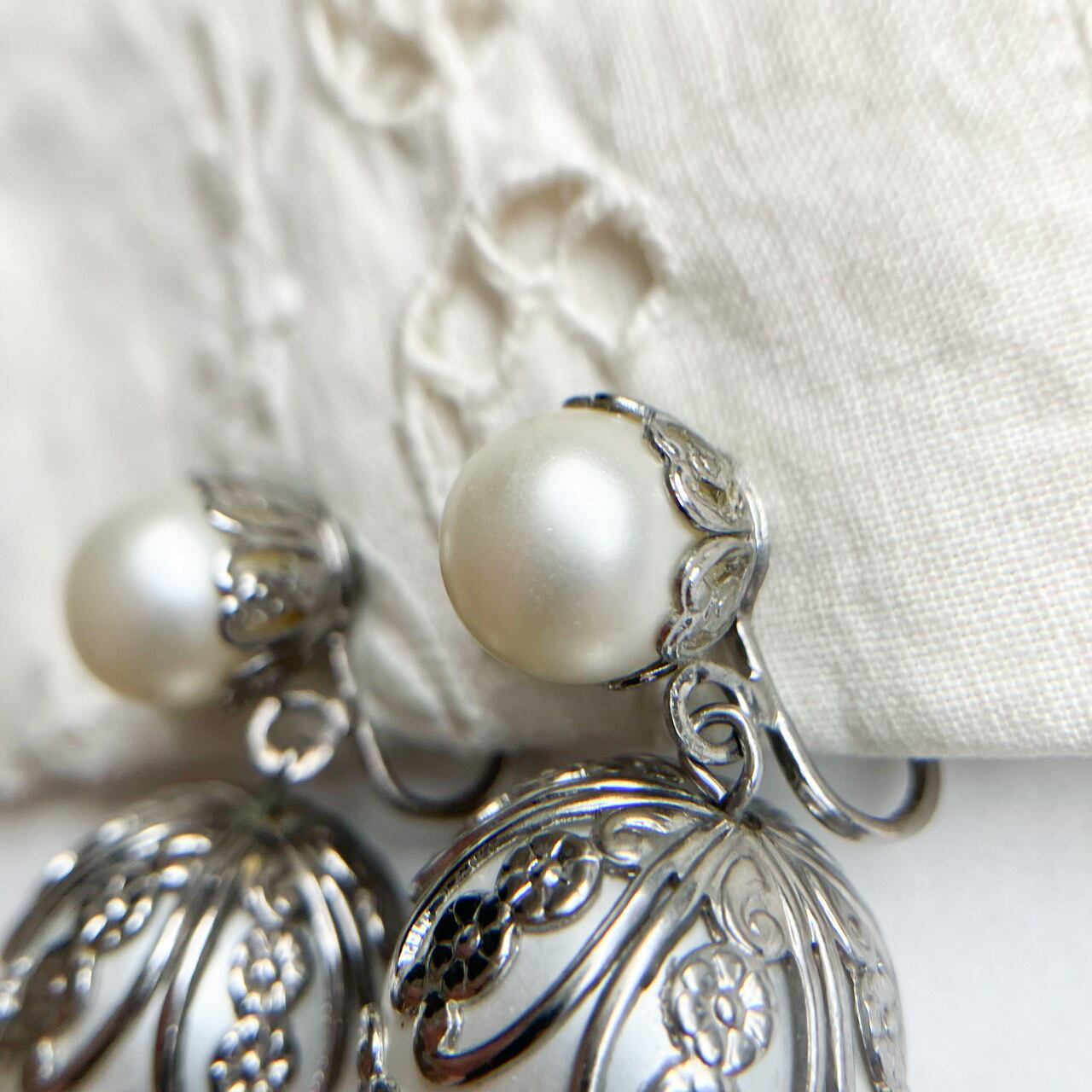 1949年に設立されたジュエリーメーカー"Sarah Coventry"(サラコベントリー)の、マット感のある大粒のパールビーズにシルバーメタルの装飾的な菊座パーツがアクセントになったスペシャルなデザインが、とても素敵なヴィンテージイヤリングです。