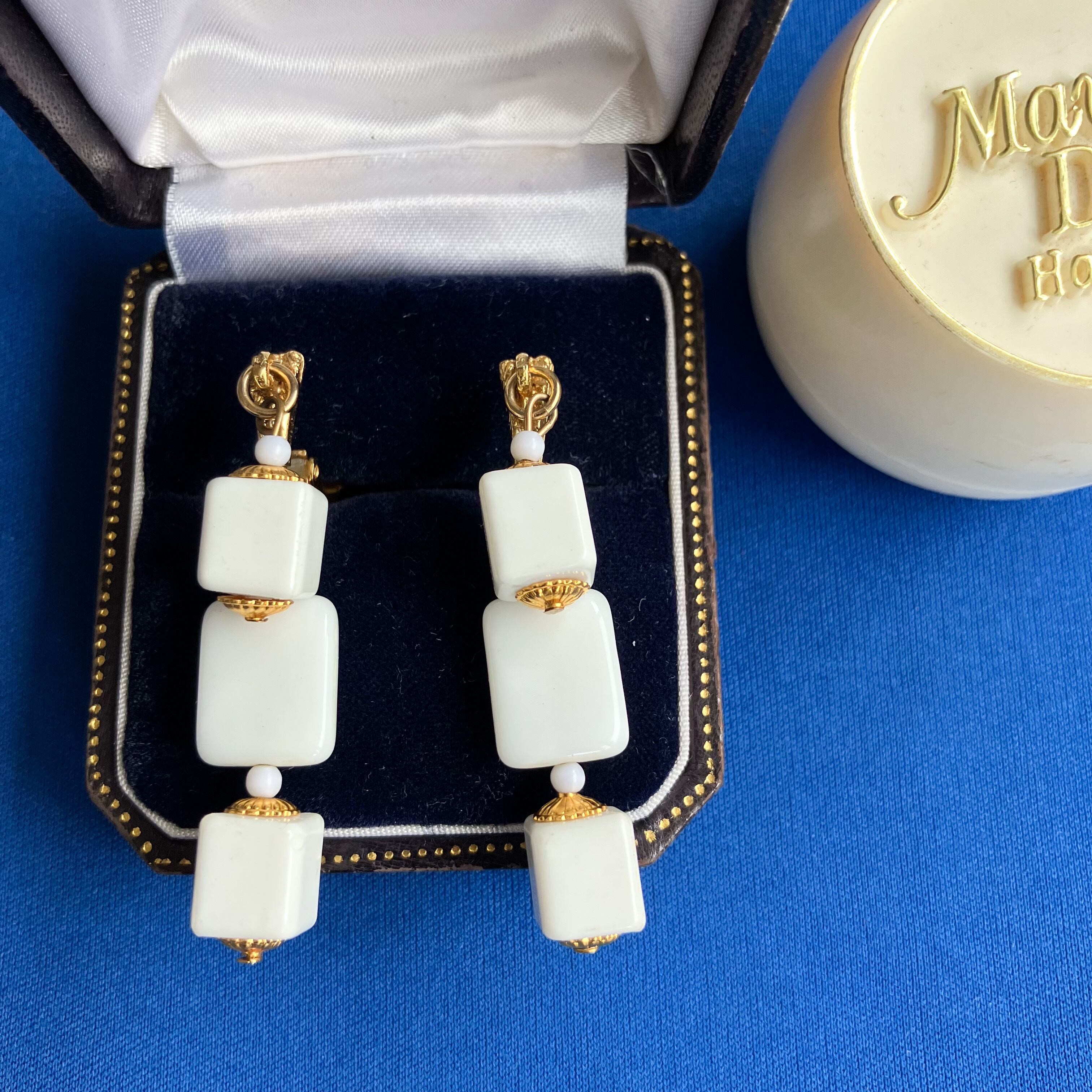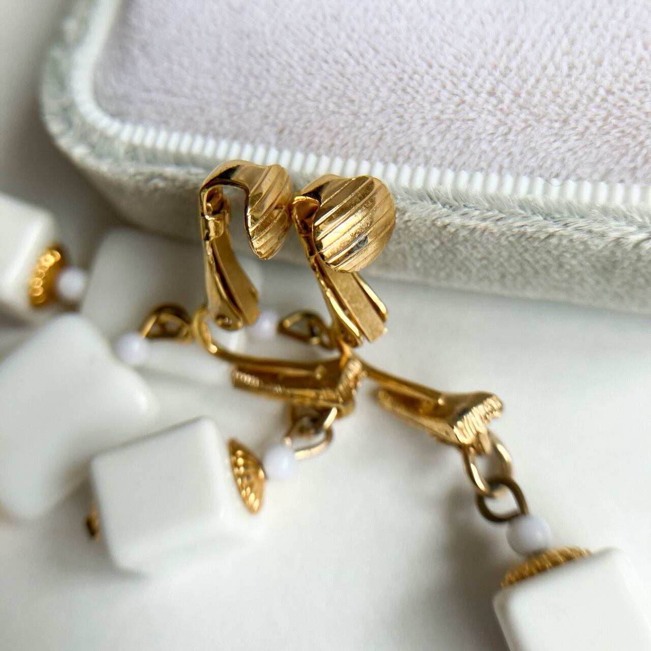 ゴールドメタルとホワイトキューブビーズの華やかな組み合わせの揺れるデザインが、とても素敵なヴィンテージイヤリングです。