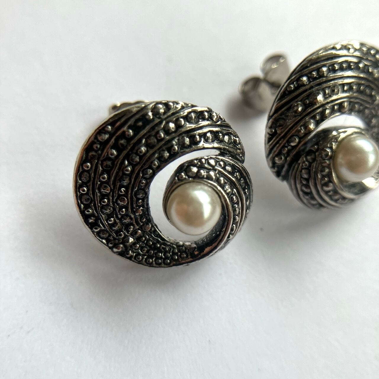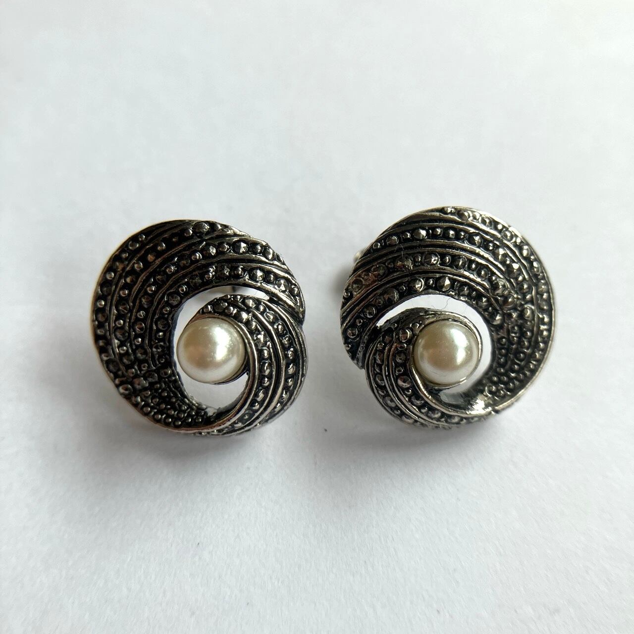 アンティーク調の落ち着いたシルバーメタルにマーカサイト風&パールビーズで、クラシカルな美しいサークルデザインが、とても素敵な”AVON”(エイボン)のヴィンテージピアスです。