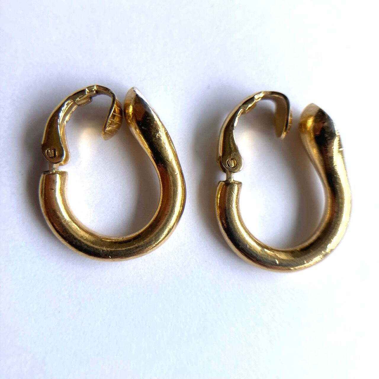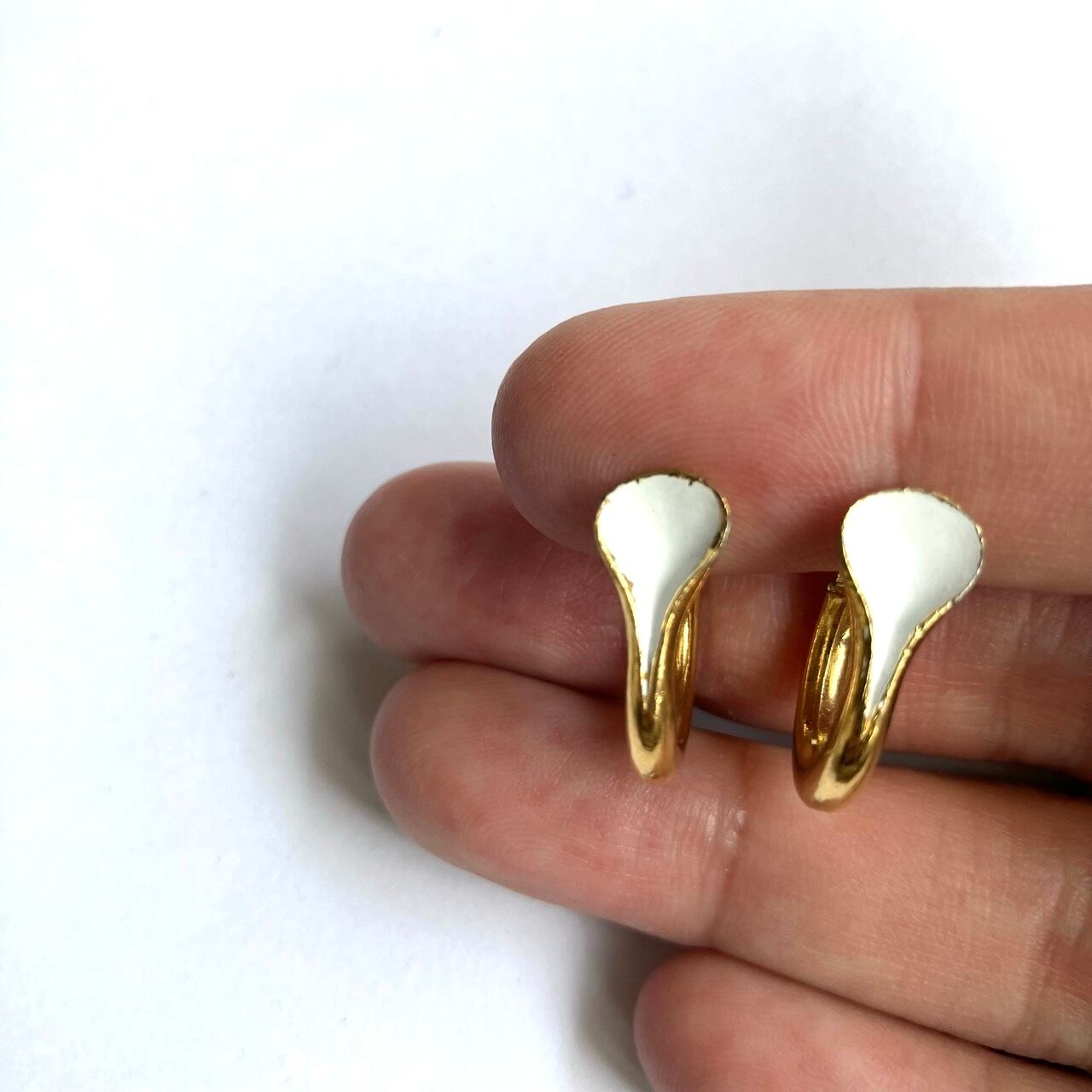 1910年に設立され、ハリウッドやブロードウェイのジュエリーも制作していたジュエリーメーカー"Trifari"(トリファリ)の、ホワイトエナメルとゴールドメタルのさりげない曲線が効いたお洒落なフープデザインが、とても素敵なヴィンテージイヤリングです。