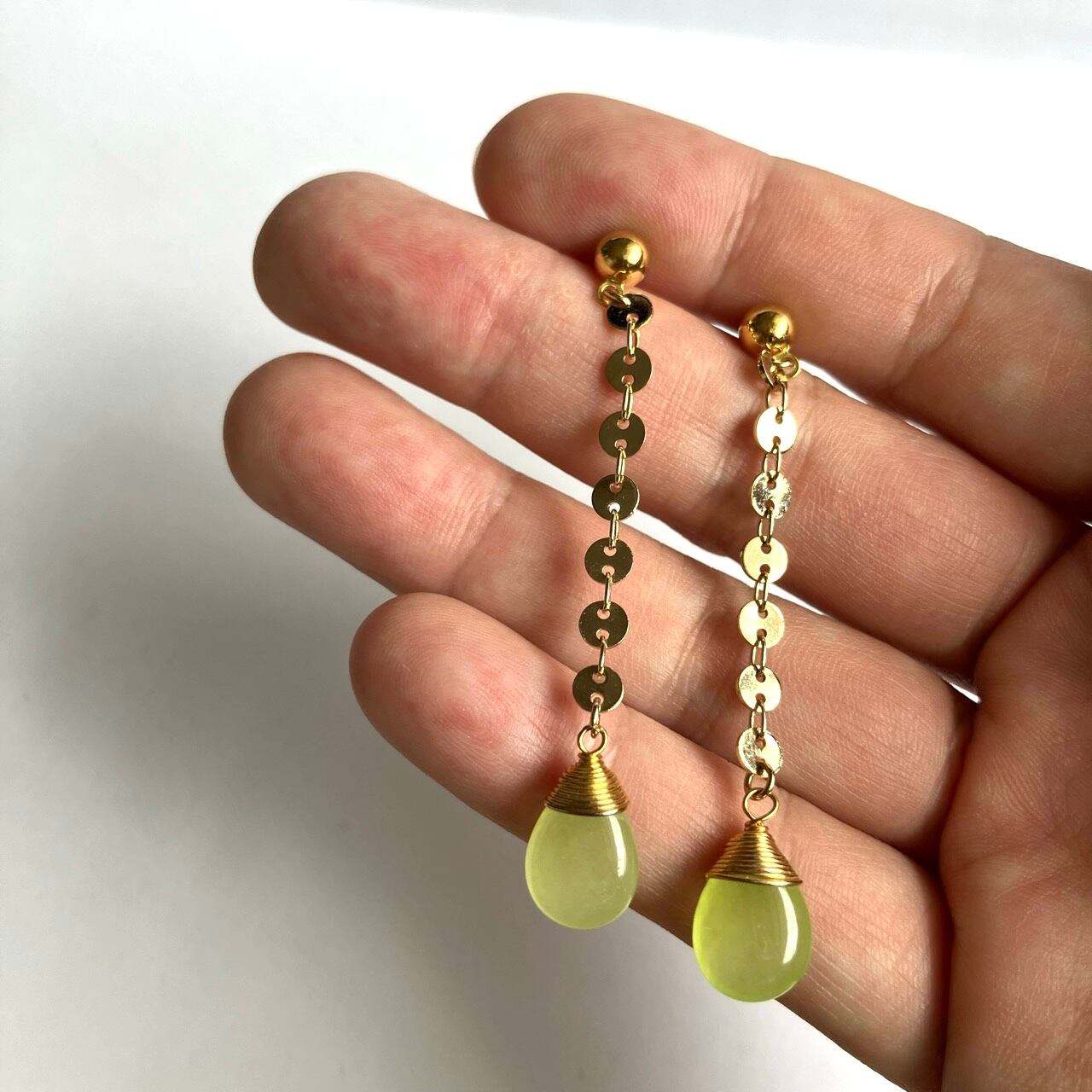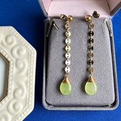 優しい半透明の黄緑色のドロップパーツがお洒落なゴールドメタルチェーンで揺れるデザインの、とても素敵なヴィンテージピアスです。