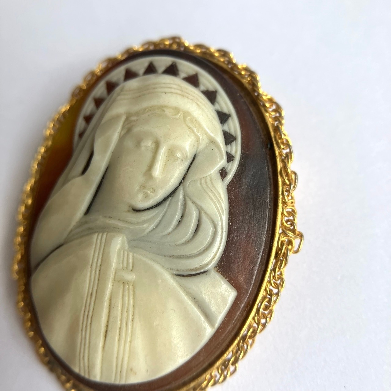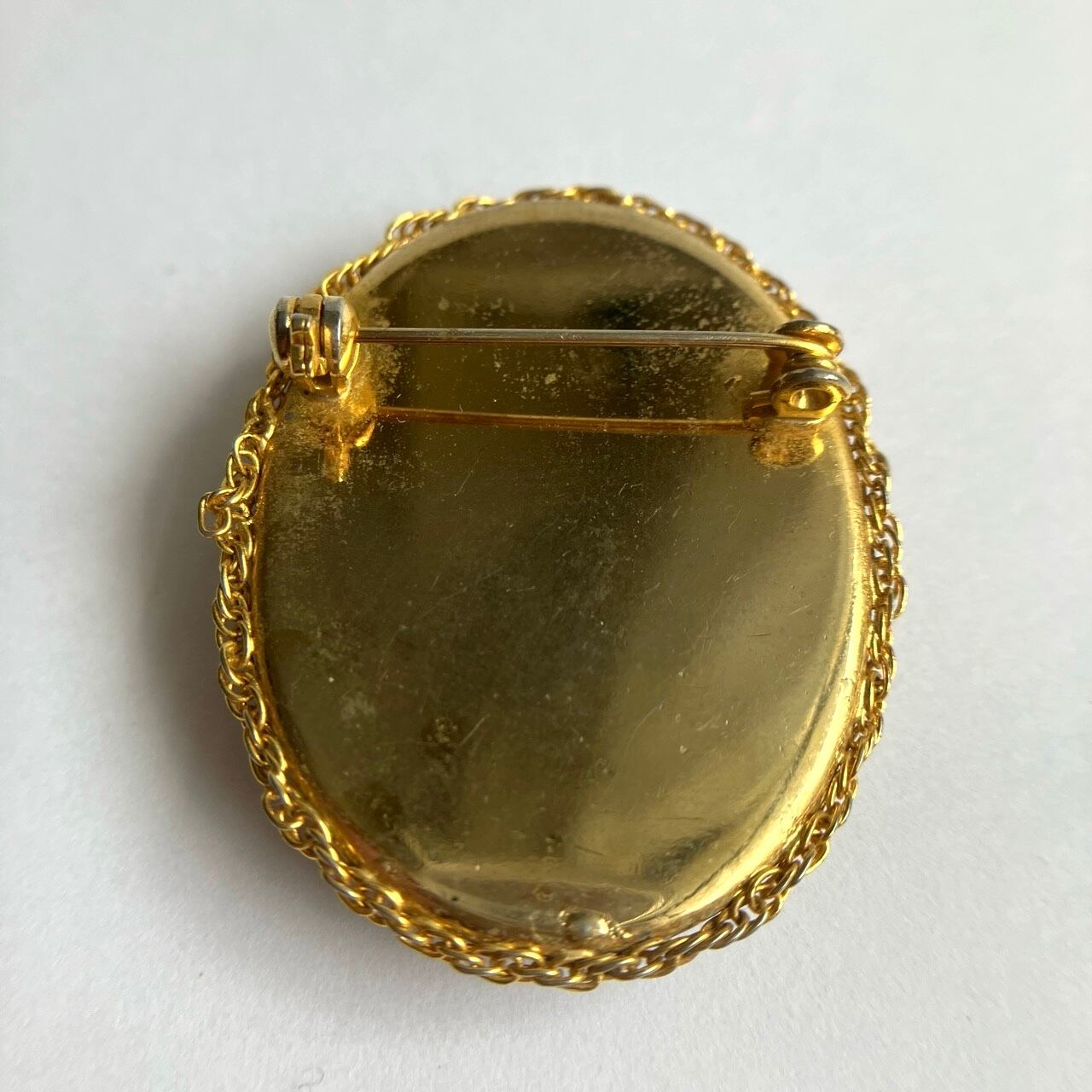 落ち着いたゴールドチェーンで周りを飾られた土台に、べっ甲風ブラウン&オフホワイトの聖母マリアのカメオデザインが、とても素敵なヴィンテージブローチです。