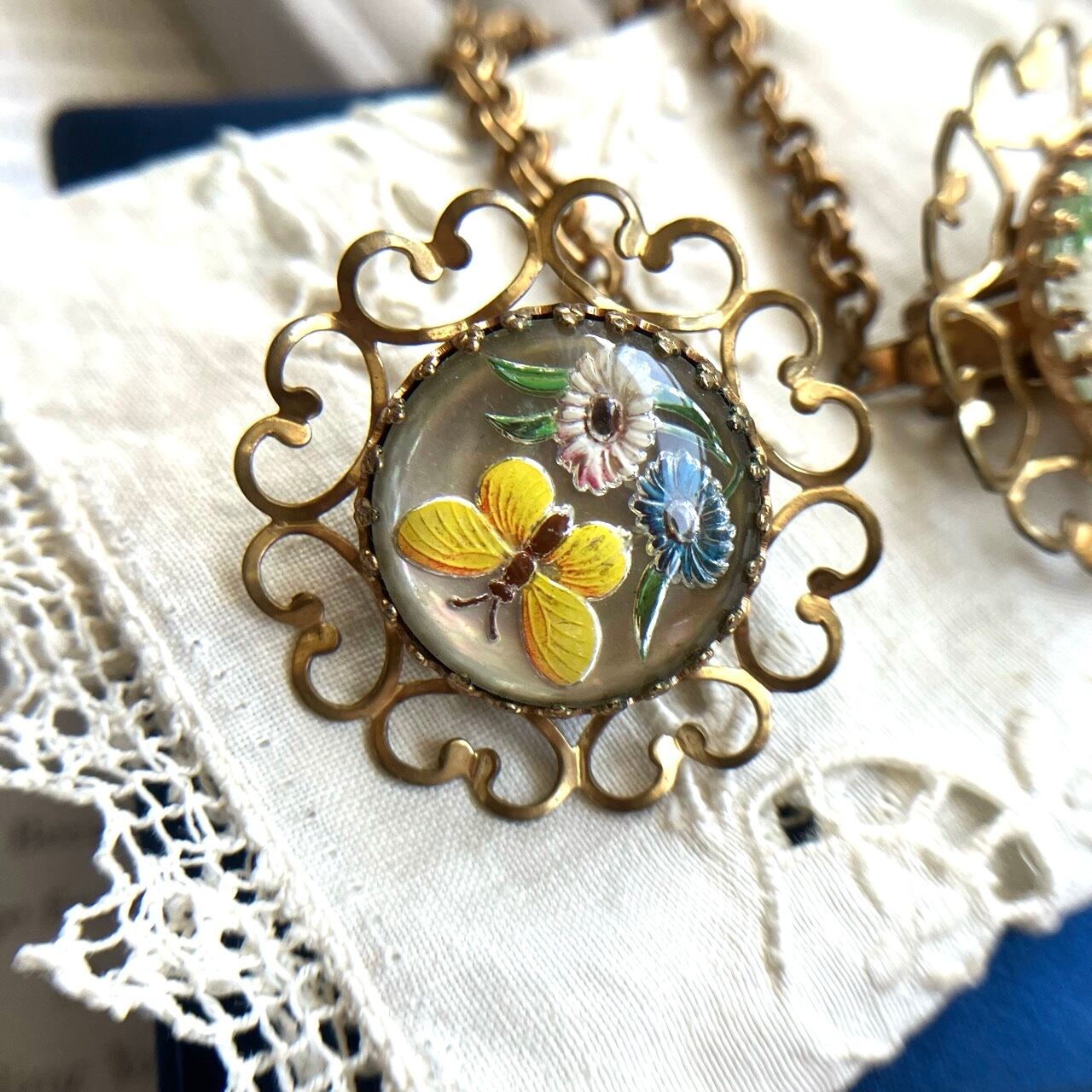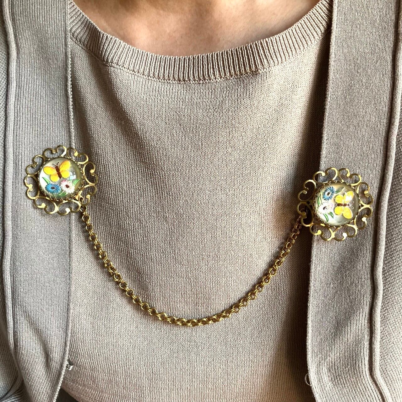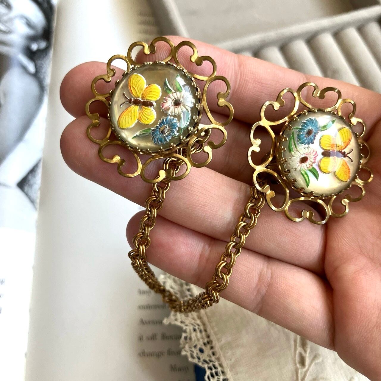 落ち着いた味のあるゴールドメタルの装飾的な土台に、裏から柄が彫られて彩色されたインタリオの蝶々とお花の柄がとても可愛いカボションがセットされた、ヴィンテージならではのとても素敵なヴィンテージセータークリップです。