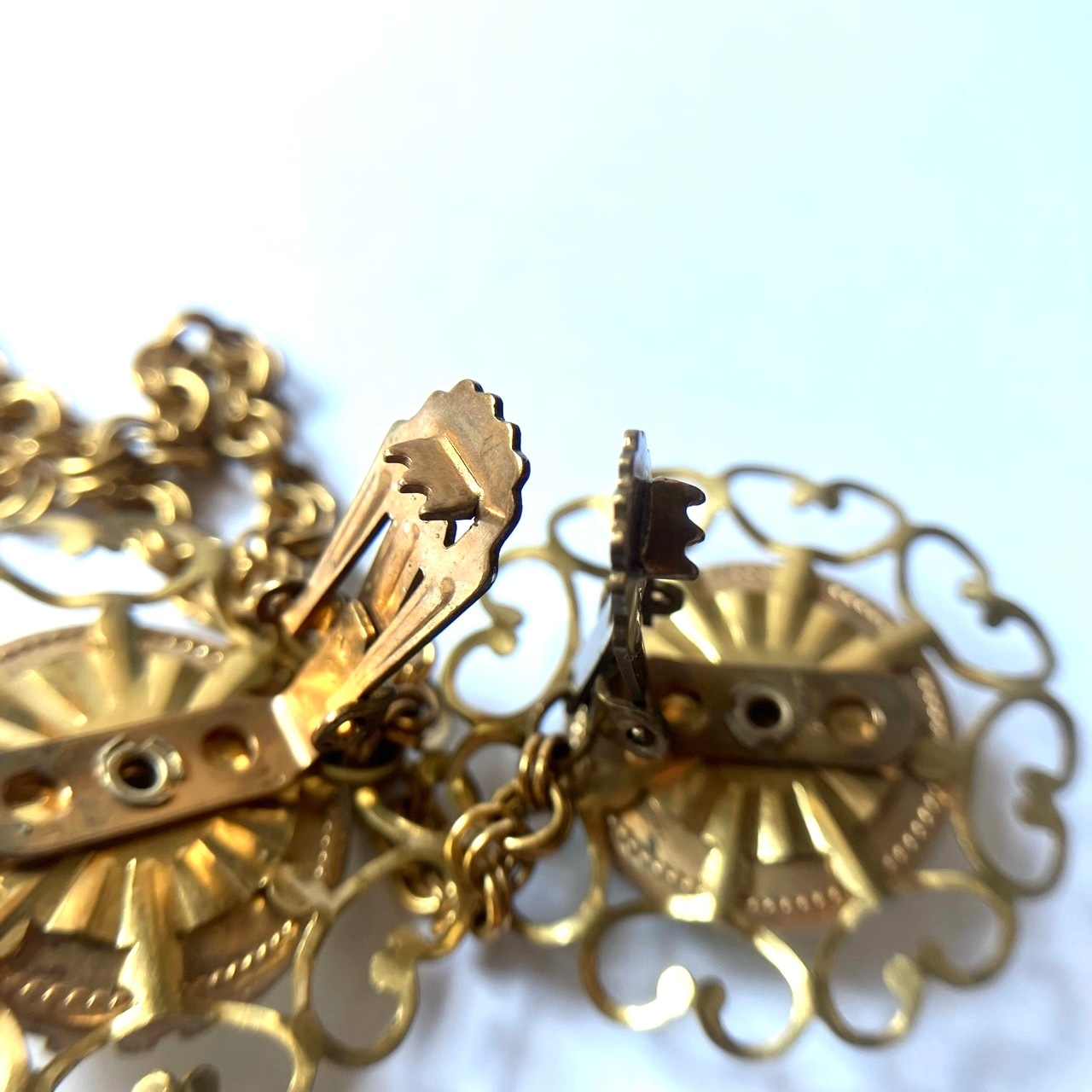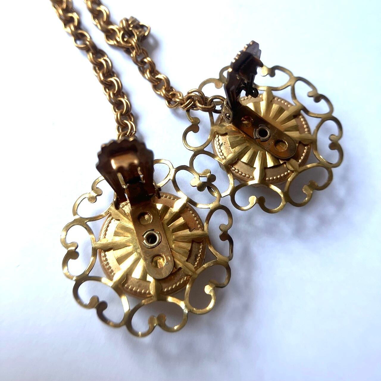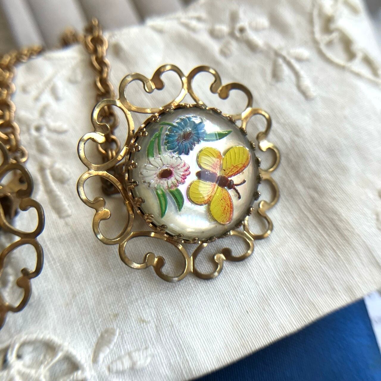 落ち着いた味のあるゴールドメタルの装飾的な土台に、裏から柄が彫られて彩色されたインタリオの蝶々とお花の柄がとても可愛いカボションがセットされた、ヴィンテージならではのとても素敵なヴィンテージセータークリップです。