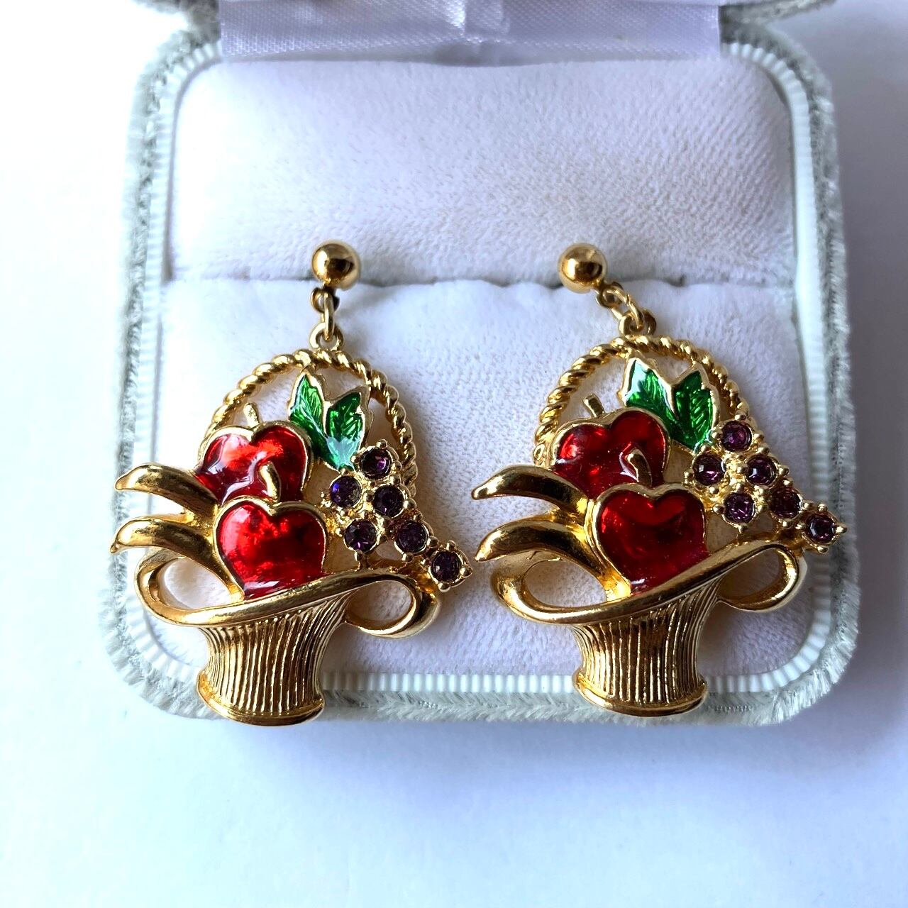 ゴールドメタルにレッド&グリーンエナメルとパープルラインストーンで、フルーツバスケットがデザインされて揺れる、とても素敵な”AVON”(エイボン)のヴィンテージピアスです。