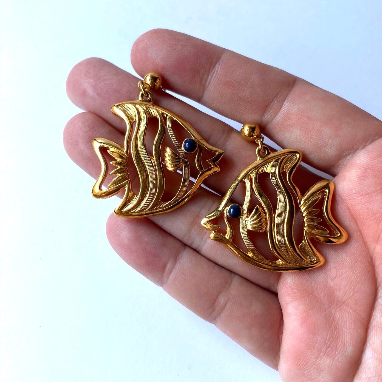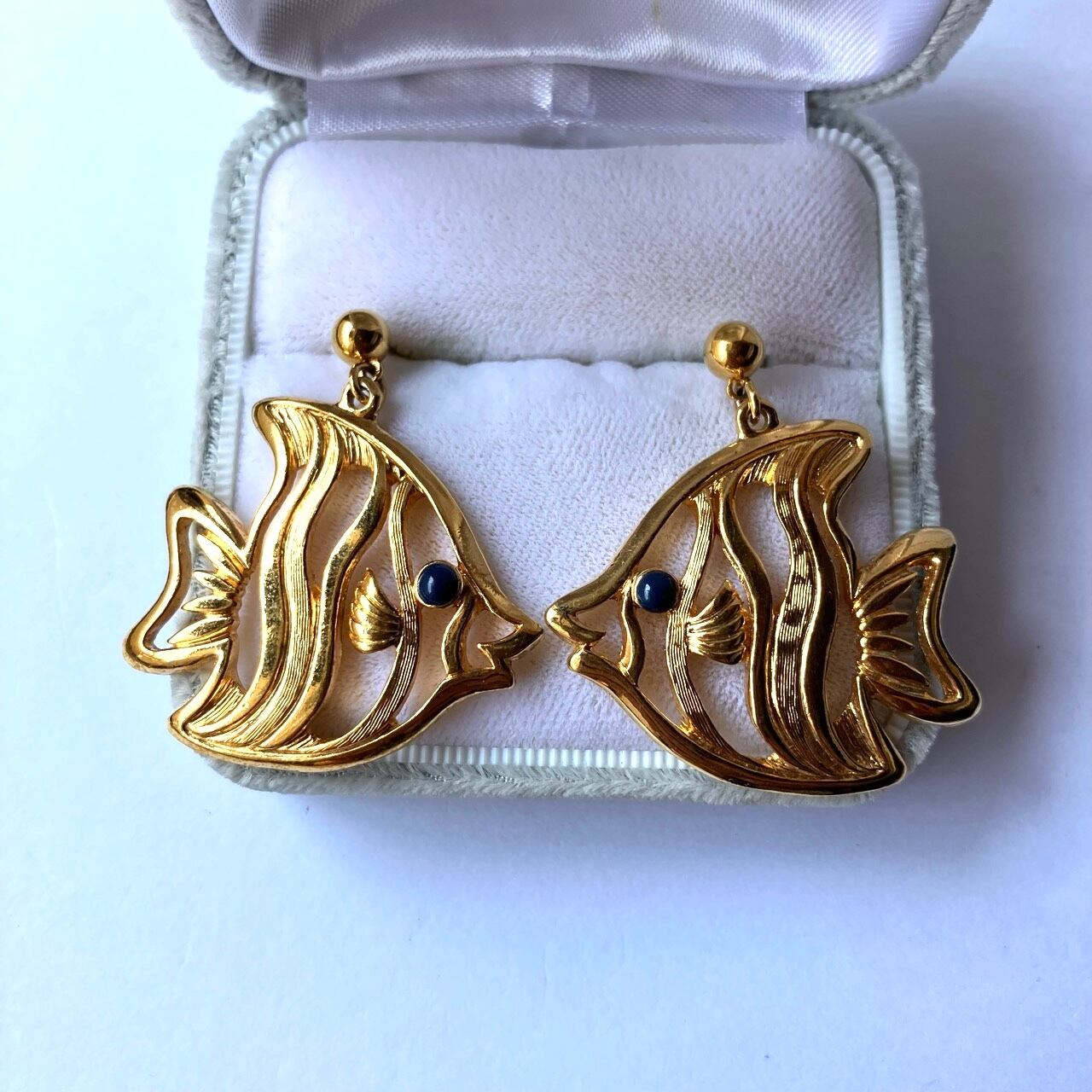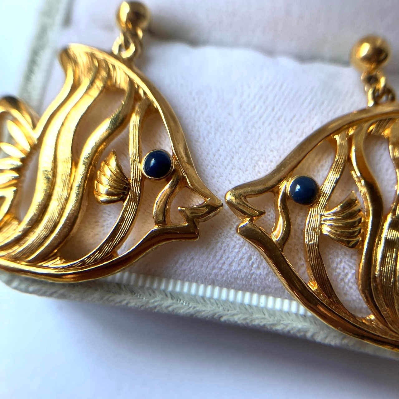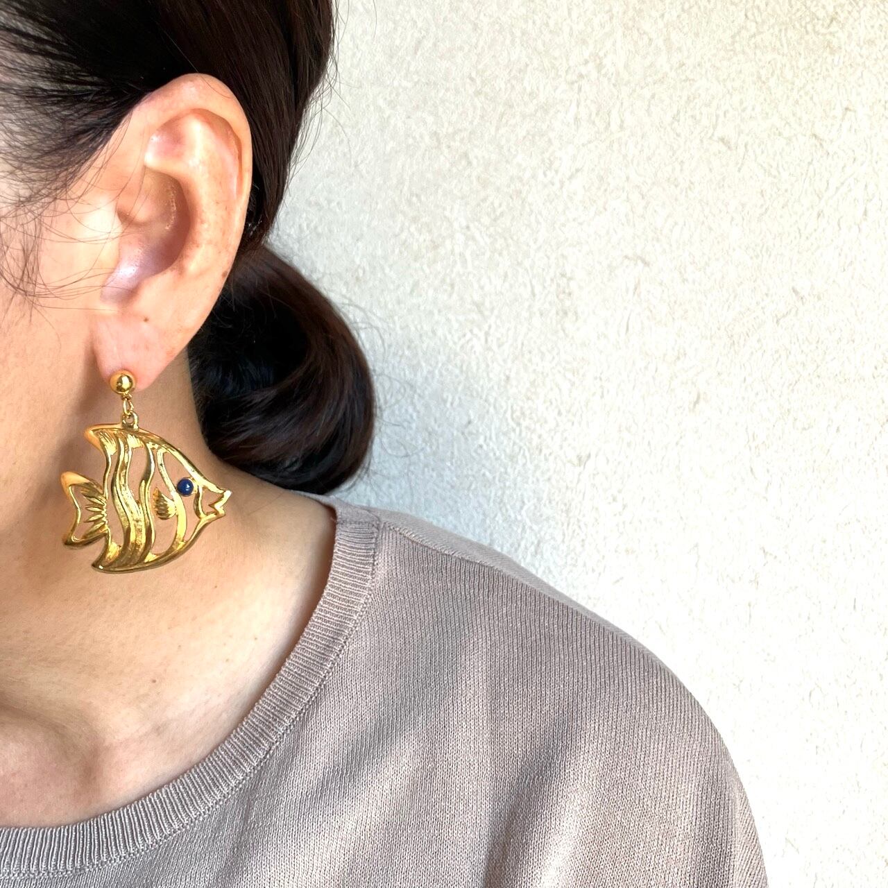 ゴールドメタルにブルーの瞳が可愛い魚がデザインされて揺れる、とても素敵な”AVON”(エイボン)のヴィンテージピアスです。