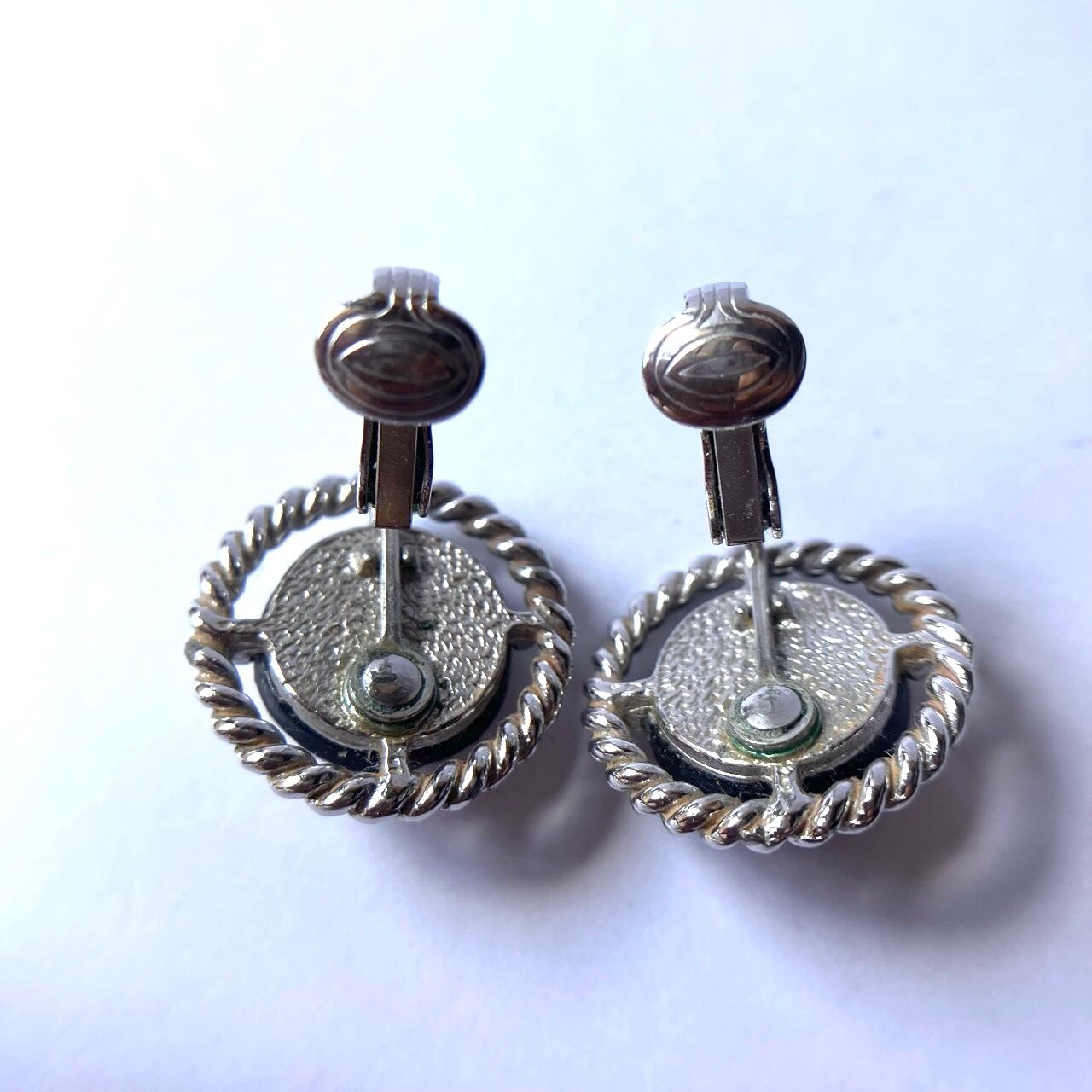 1949年に設立されたジュエリーメーカー"Sarah Coventry"(サラコベントリー)の、シルバーメタルのデザインされたサークル型フレームに、立体的なお花の彫り模様が入ったメタリックオーロラ色に輝くカボションがセットされたスペシャルなデザインが、とても素敵なヴィンテージイヤリングです。