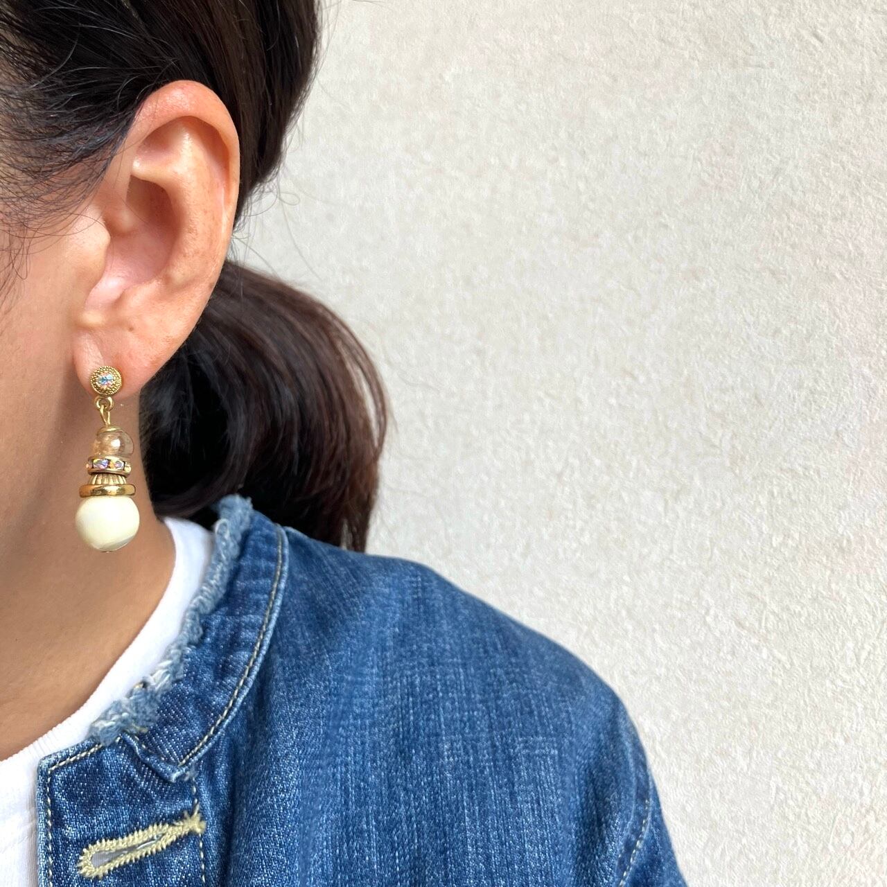 1968年に設立され、ヴィクトリアン調のデザインが特徴的なジュエリーメーカー"1928"の、落ち着いたゴールドメタルにオーロララインストーン、加工されたクリアビーズと、シェルのようなマーブル模様が素敵なクリームビーズが揺れる装飾的なデザインが、とても素敵なヴィンテージピアスです。
