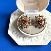透かし柄が美しいアンティーク調ゴールドメタルのデザインに、アクセントのレッドラインストーンがセットされた、とても素敵なヴィンテージイヤリングです。