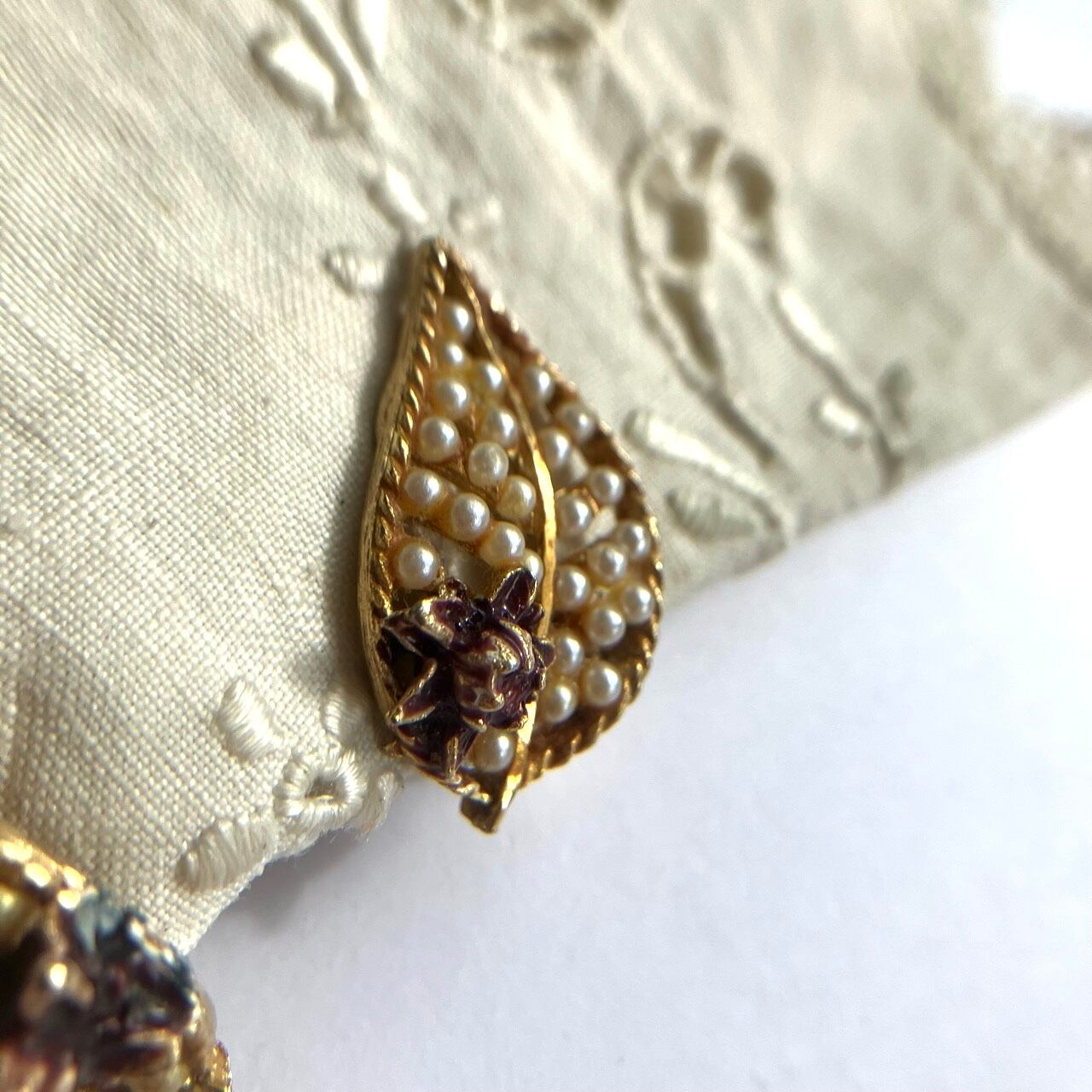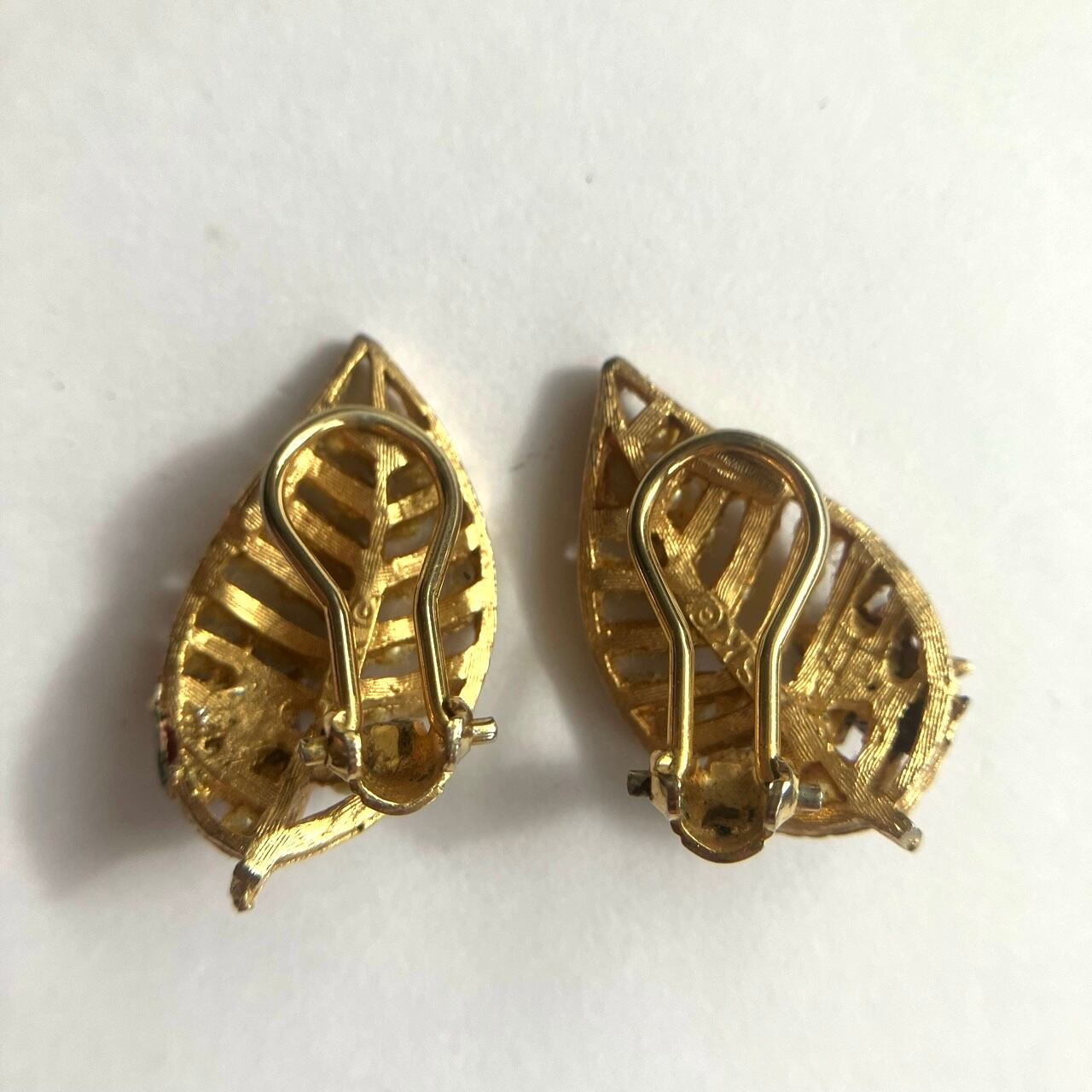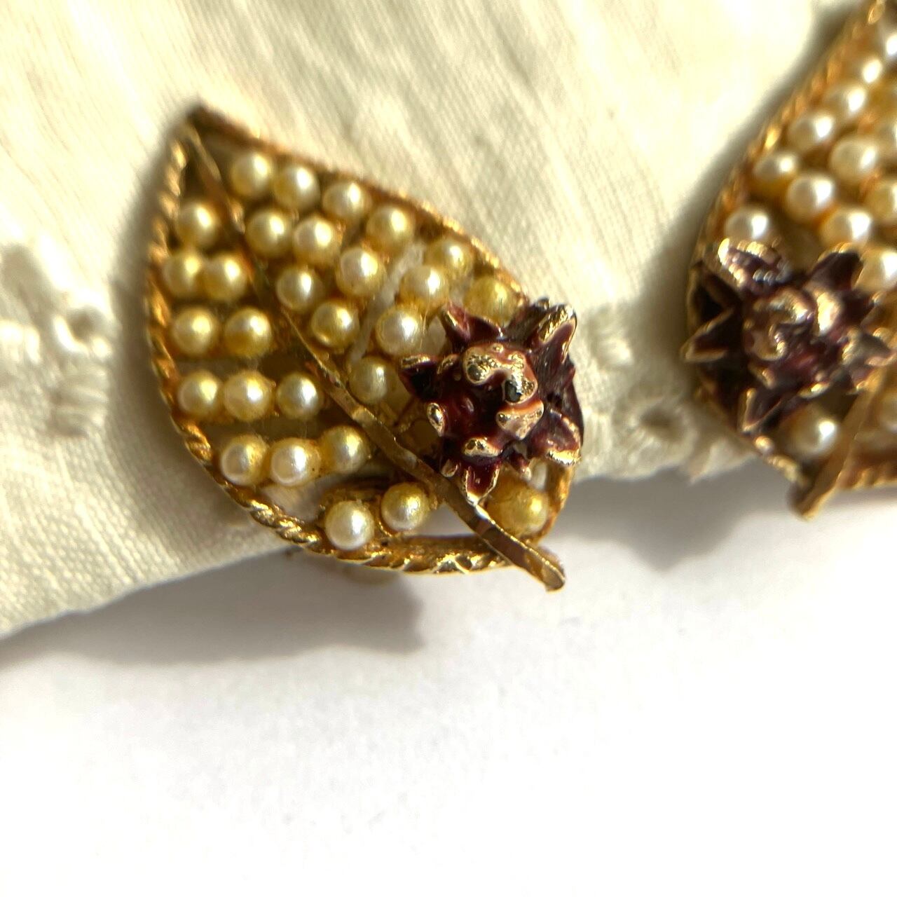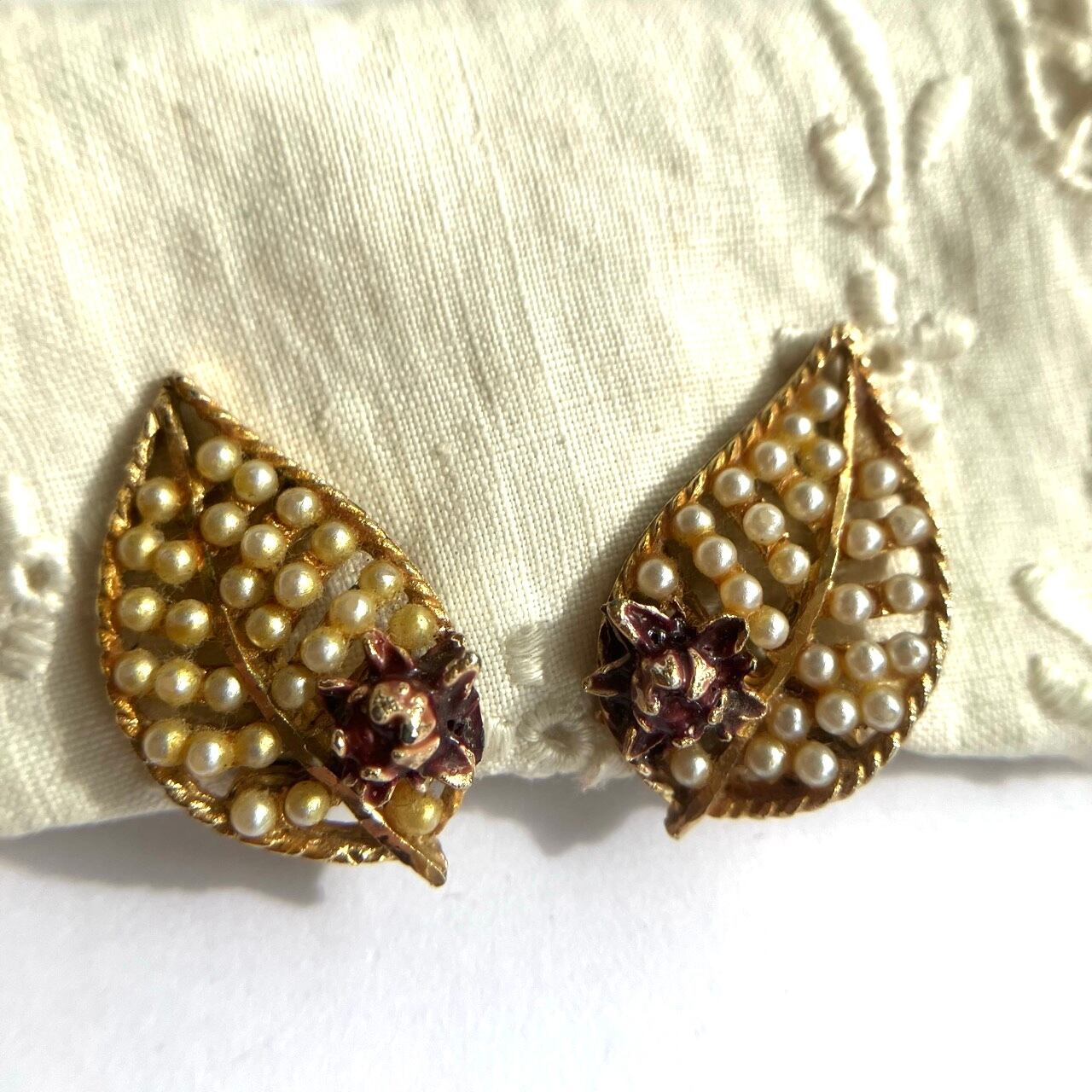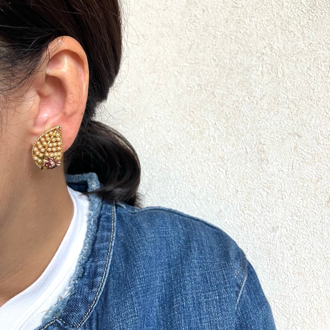 1948年にNYで設立されたジュエリーメーカー"BSK"の、ゴールドメタルのリーフ型の土台に、小粒のパールビーズと小さなお花がアクセントになったデザインが、とても素敵なヴィンテージイヤリングです。