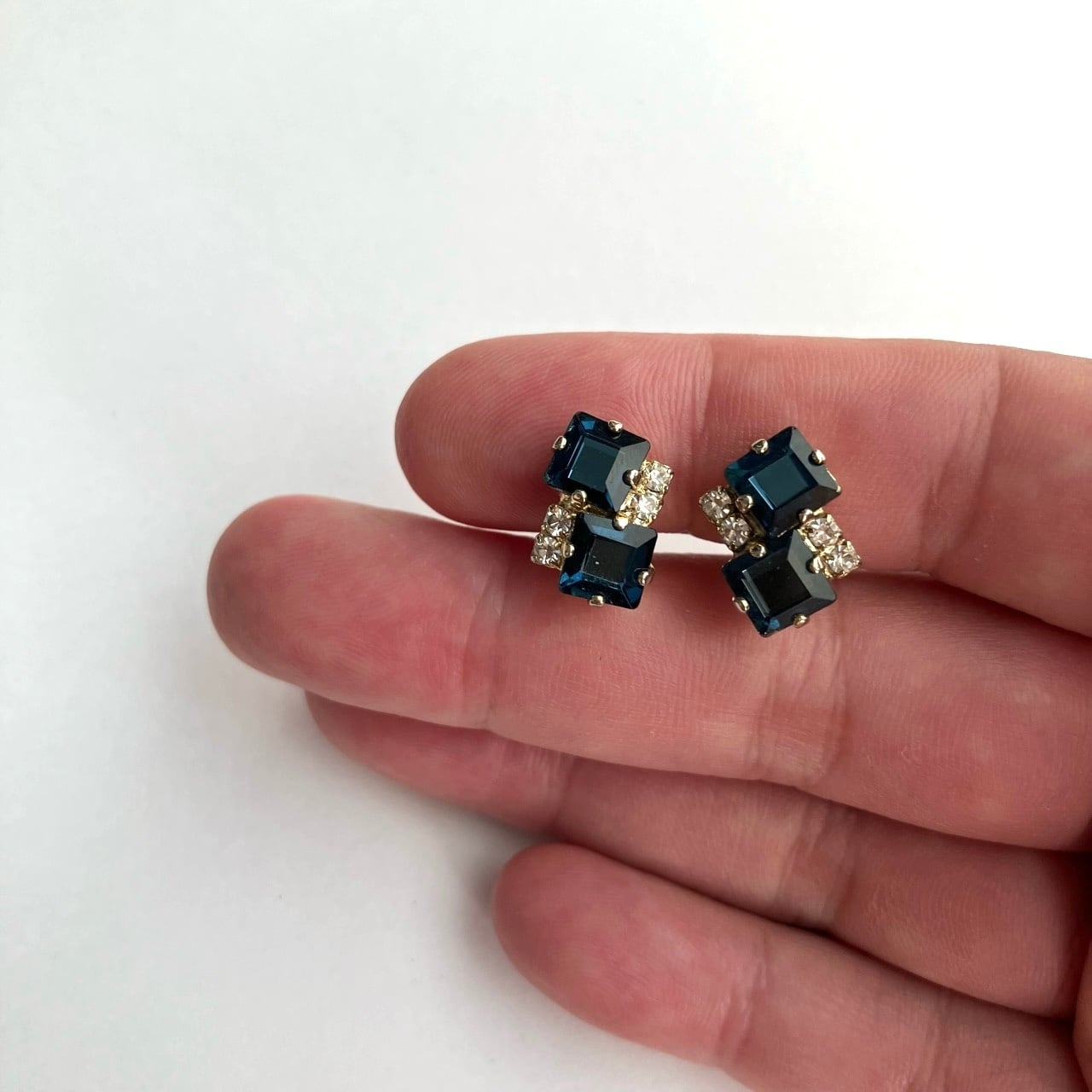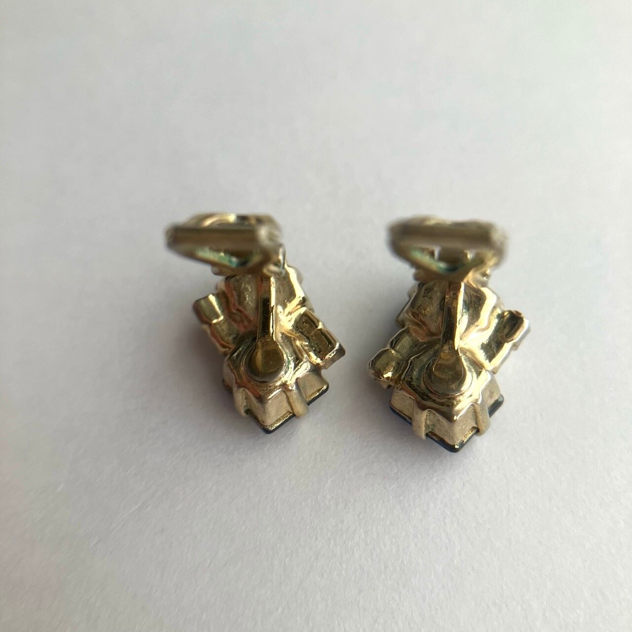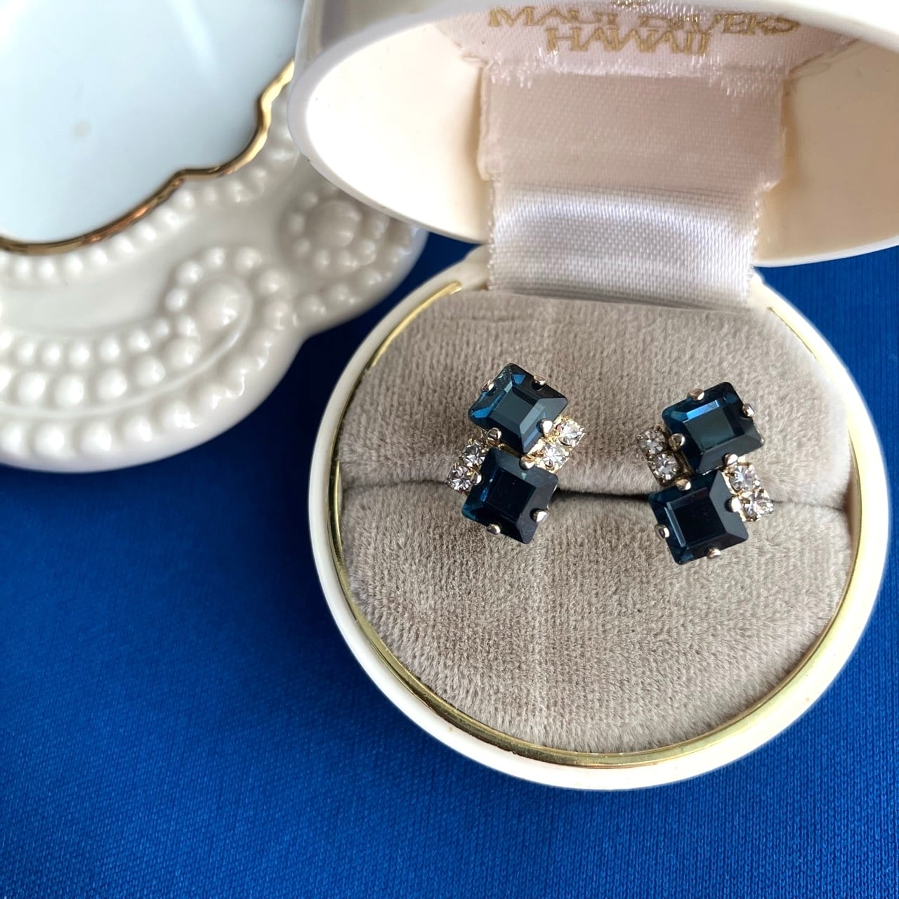 ゴールドメタルの土台に、落ち着いたトーンのスクエアブルーラインストーンと、小粒のクリアラインストーンでデザインされた、とても素敵なヴィンテージイヤリングです。