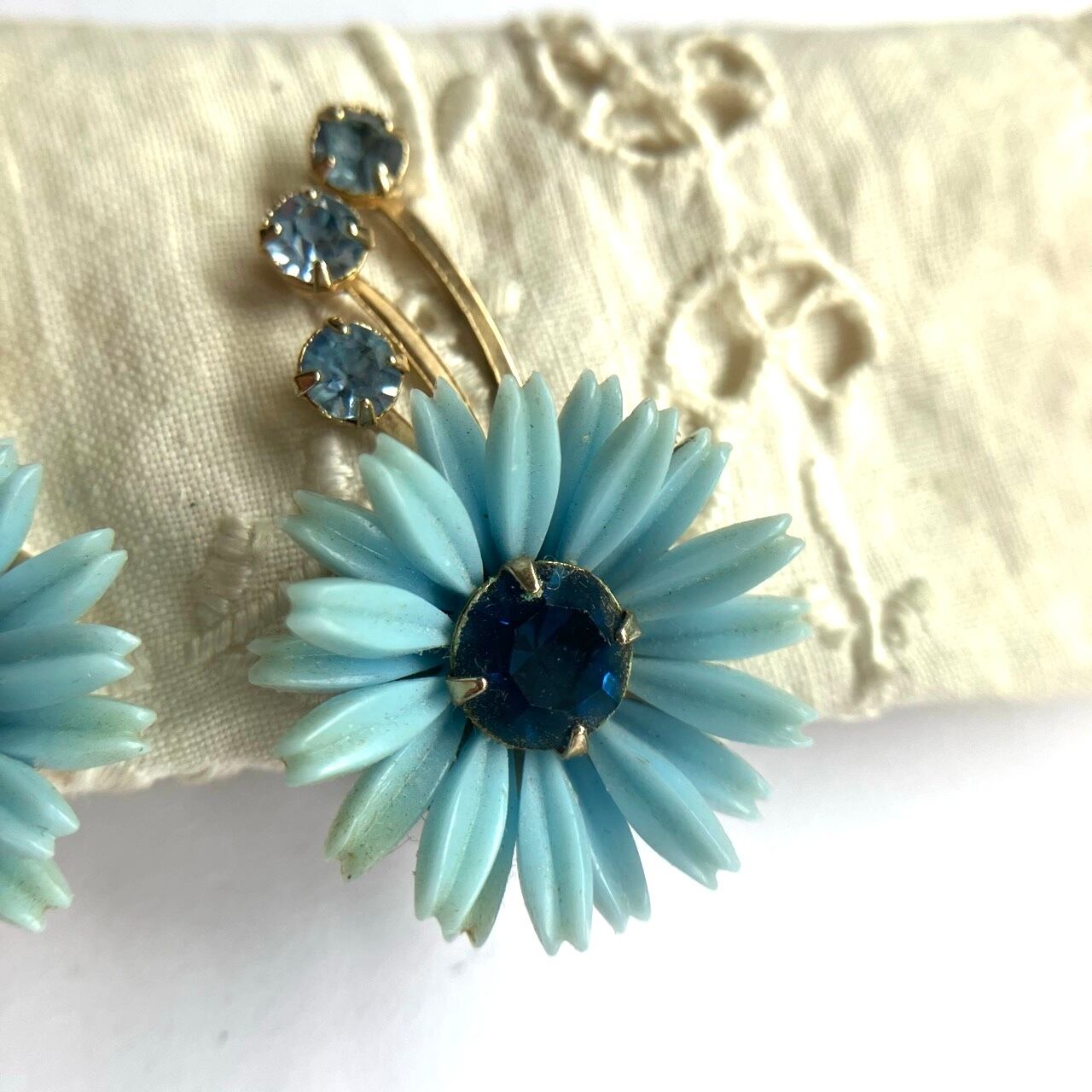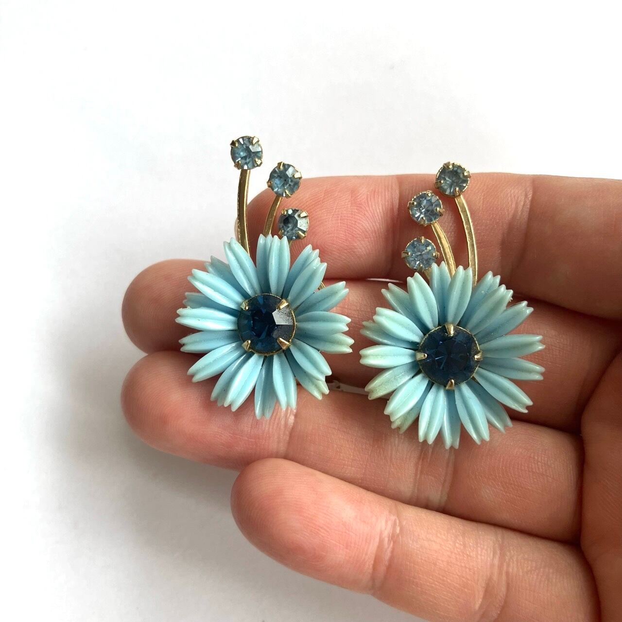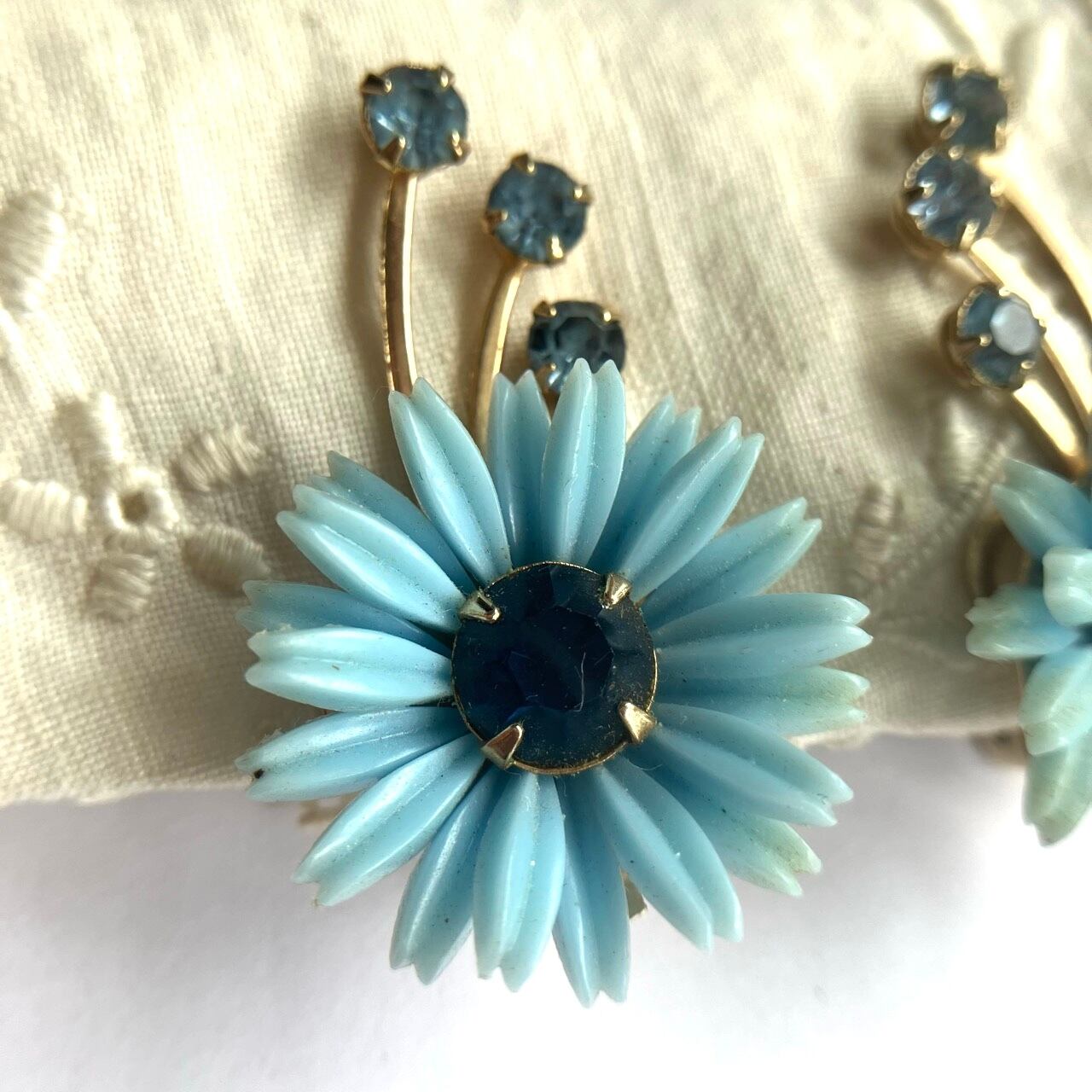 センターと上の小粒のブルーラインストーンがアクセントになった、落ち着いたライトブルーのソフトプラスティックのお花のデザインが、とても素敵な西ドイツ製のヴィンテージイヤリングです。
