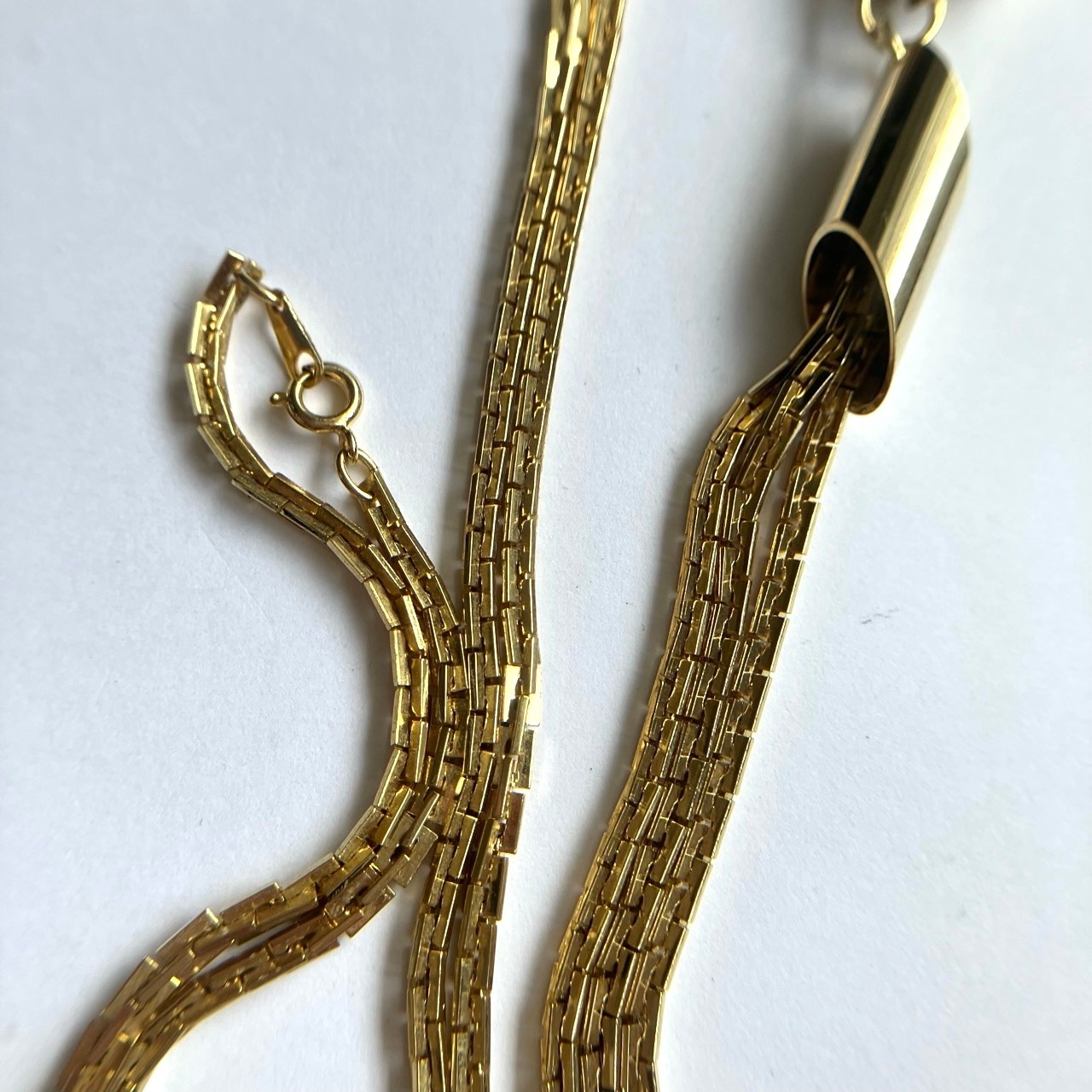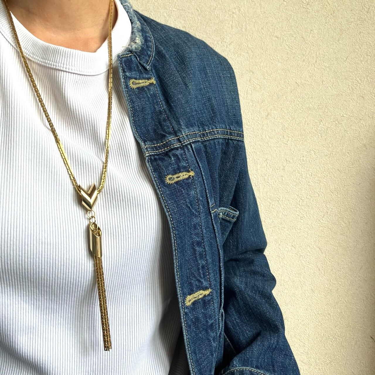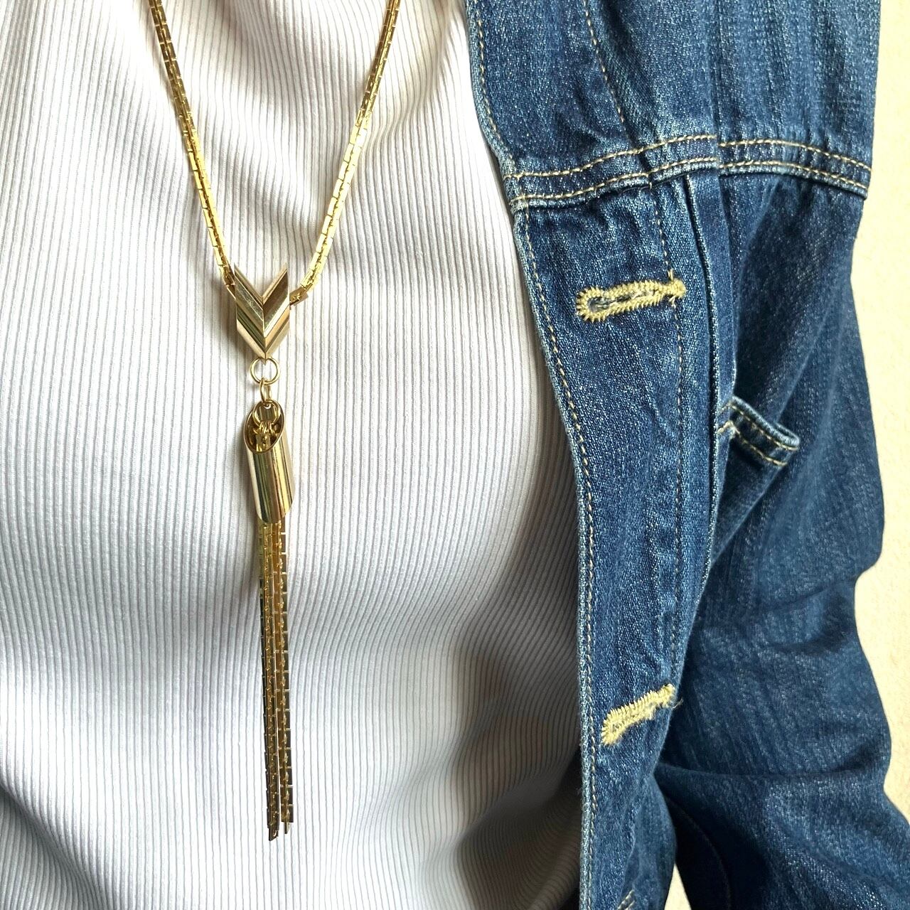ゴールドメタルのデザインされたスクエアチェーンに、美しくチェーンが揺れるタッセルがアクセントになった洗練されたモダンなデザインが、とても素敵なヴィンテージネックレスです。