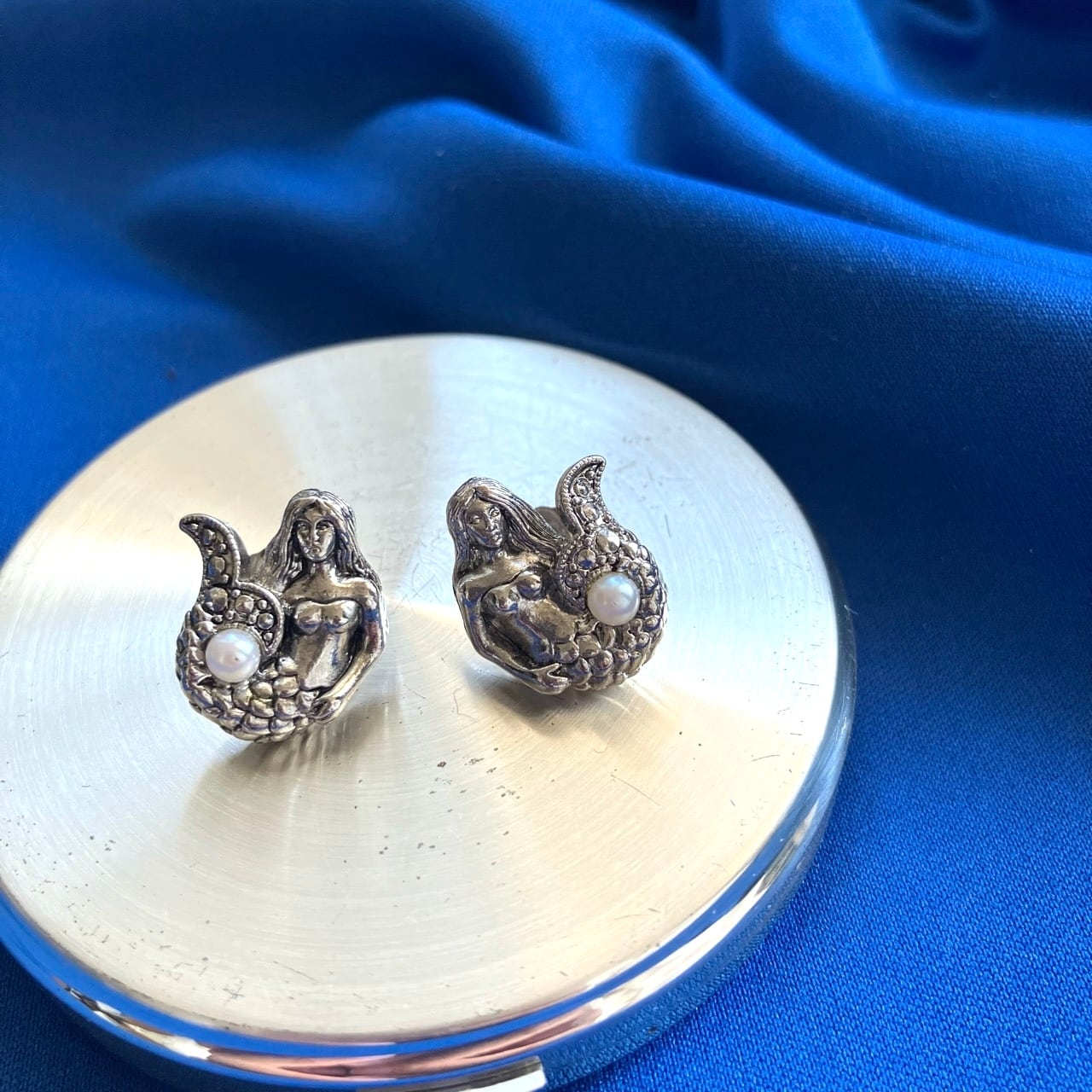 アンティーク調シルバーメタルの可愛い人魚とパールのデザインが、とても素敵な”AVON”(エイボン)のヴィンテージピアスです。