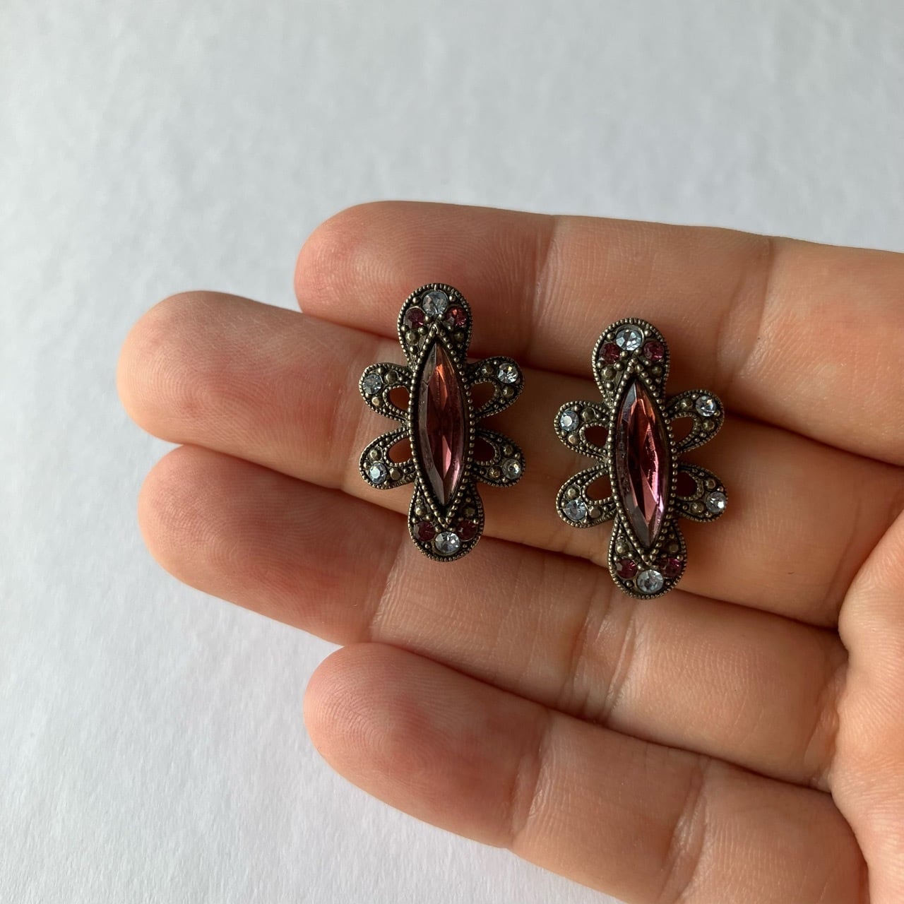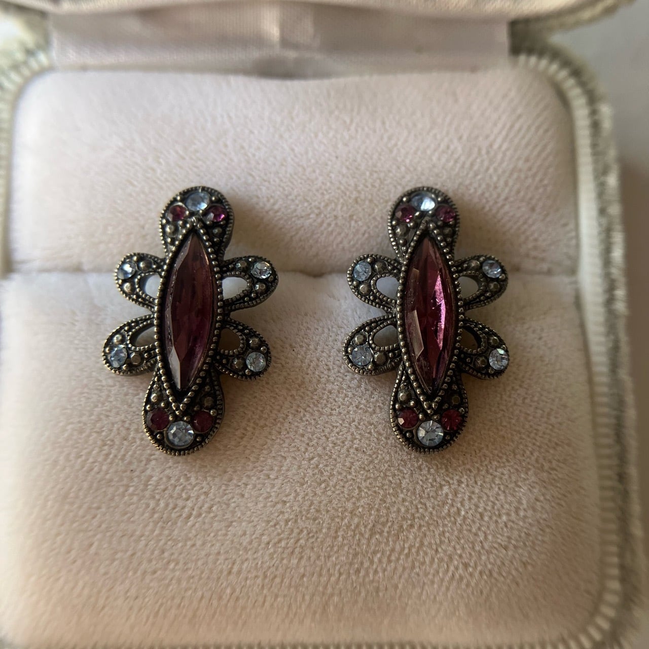 1968年に設立され、ヴィクトリアン調のデザインが特徴的なジュエリーメーカー"1928"の、アンティーク調シルバーメタルのデザインされた土台に、パープル&ライトブルーのラインストーンがセットされた装飾的な雰囲気がとても素敵なヴィンテージピアスです。