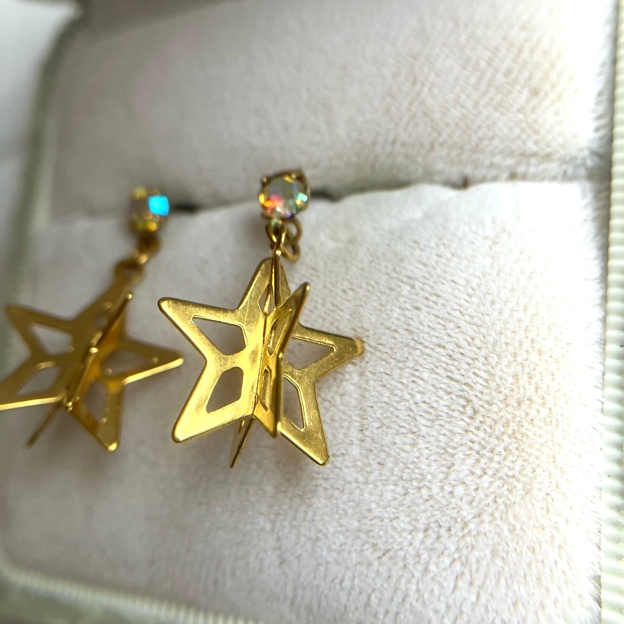 オーロララインストーンのトップに、ゴールドメタルの立体的なスターモチーフが揺れるデザインが、とても素敵な”AVON”(エイボン)のヴィンテージピアスです。
