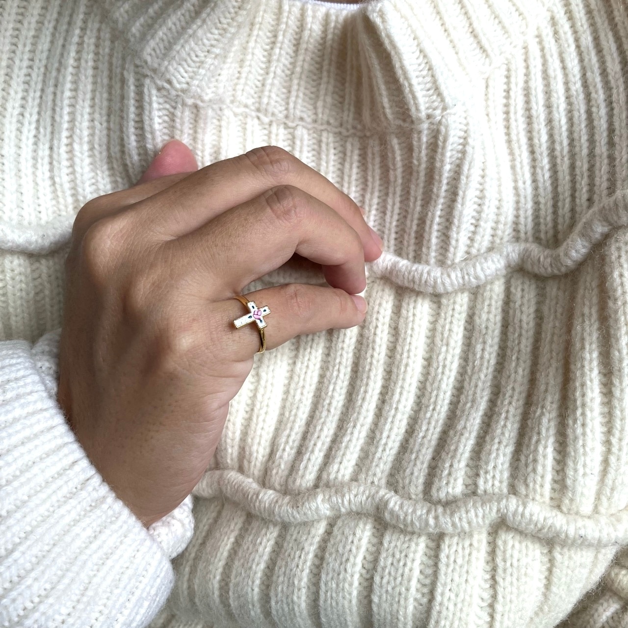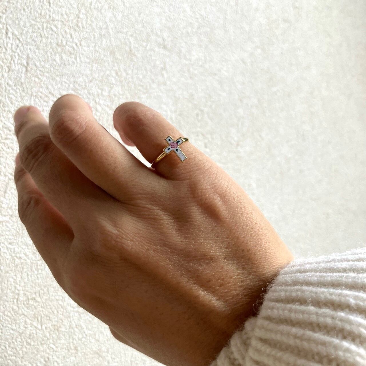 ゴールドメタルの土台に、ホワイトエナメル、ペイントのピンクローズとグリーンリーフのデザインが、とても素敵なヴィンテージリングです。