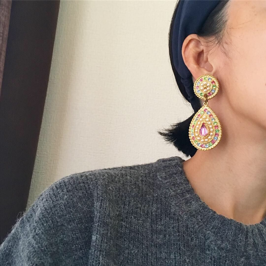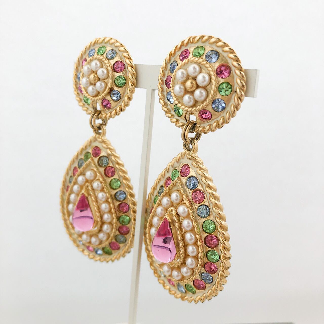 ゴールドメタルの土台にパステルカラーのラインストーンやパールビーズでデザインされた、とても素敵な大ぶりのスペシャルなヴィンテージイヤリングです。