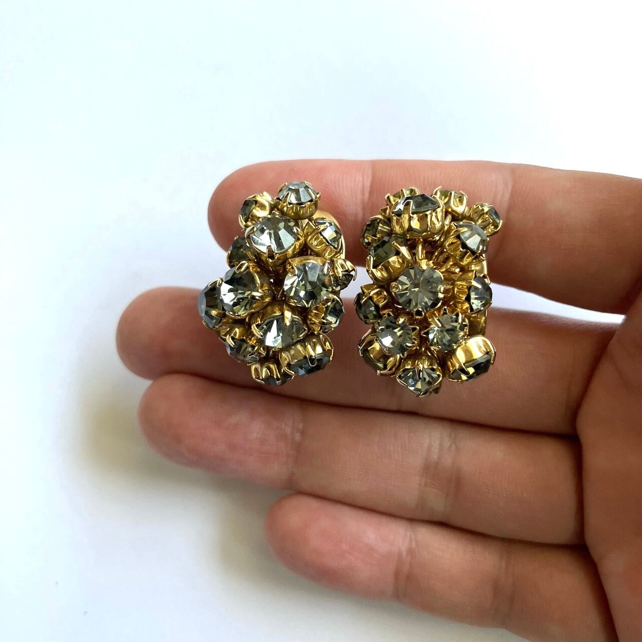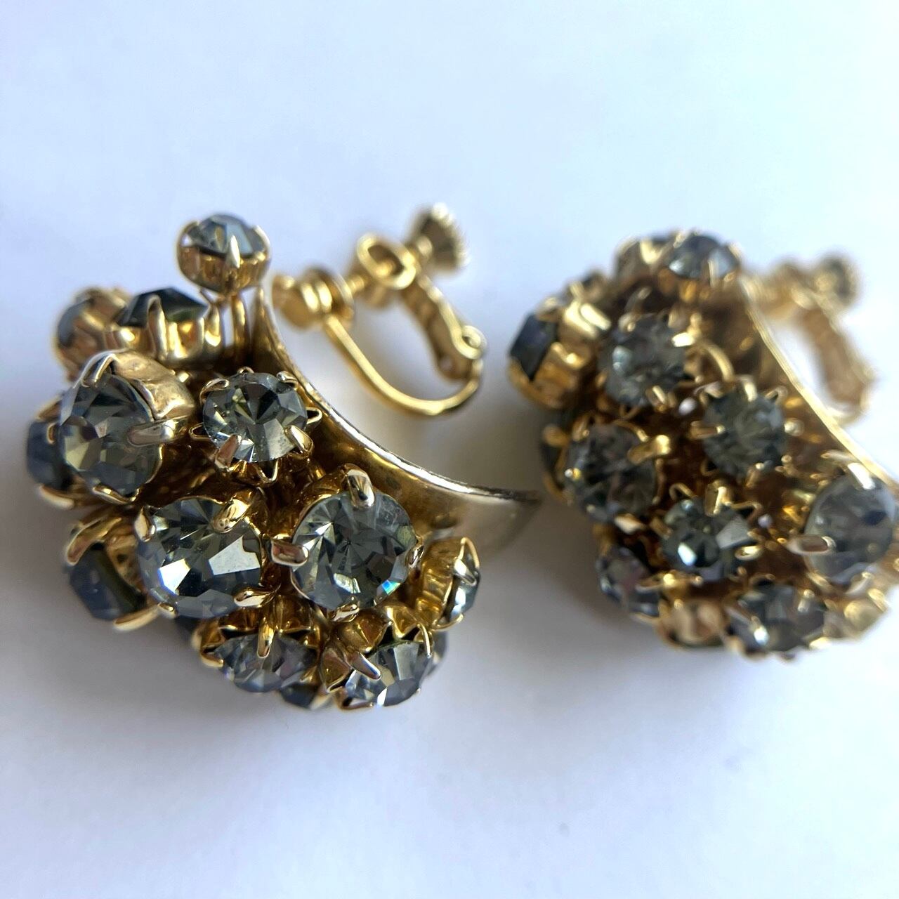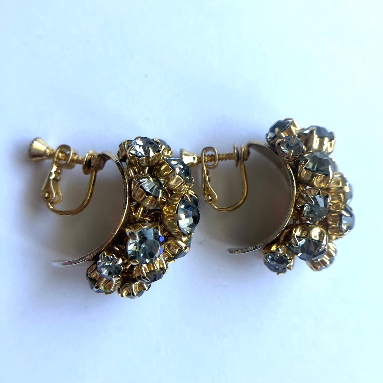 ゴールドメタルのカーブしたハーフフープのような土台に、落ち着いたグレーの大小のラインストーンがぎっしりと付けられた存在感のあるデザインが、とても素敵なヴィンテージイヤリングです。