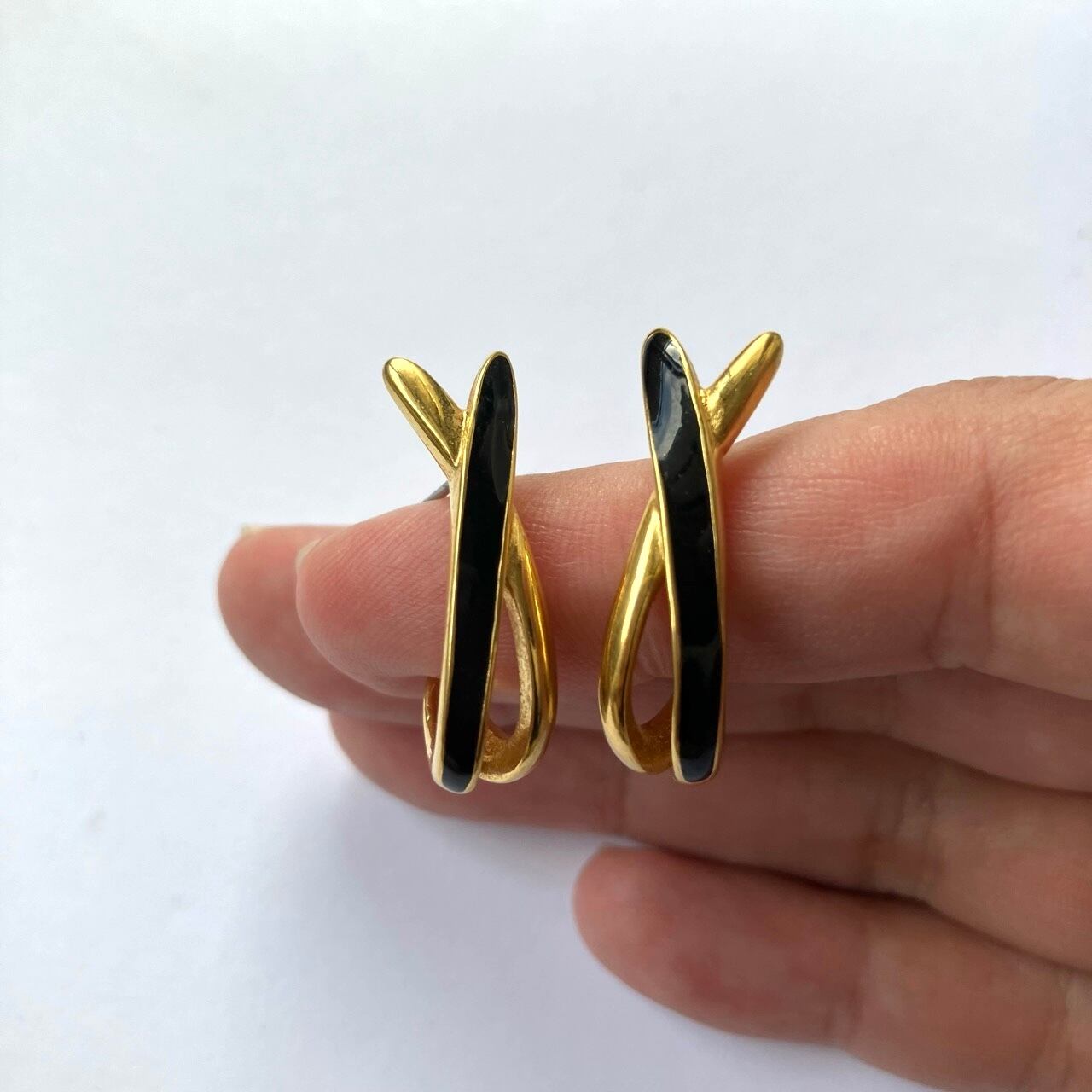 1910年に設立され、ハリウッドやブロードウェイのジュエリーも制作していたジュエリーメーカー"Trifari"(トリファリ)の、ゴールドメタルにブラックエナメルのクロスしたハーフフープのような洗練されたシャープでお洒落なデザインが、とても素敵なヴィンテージピアスです。