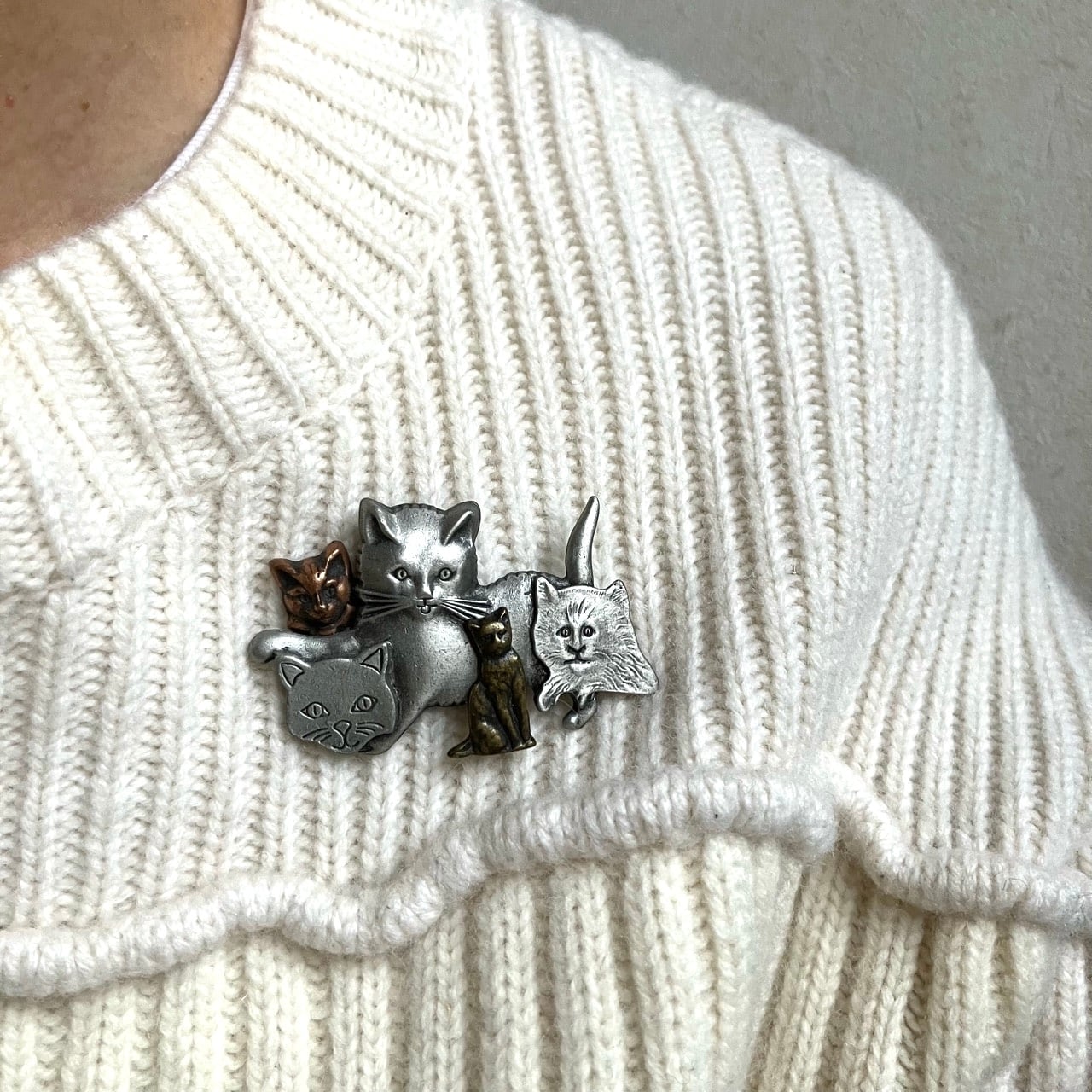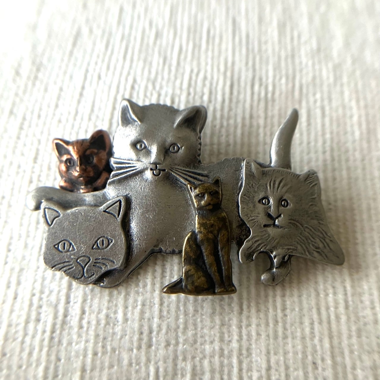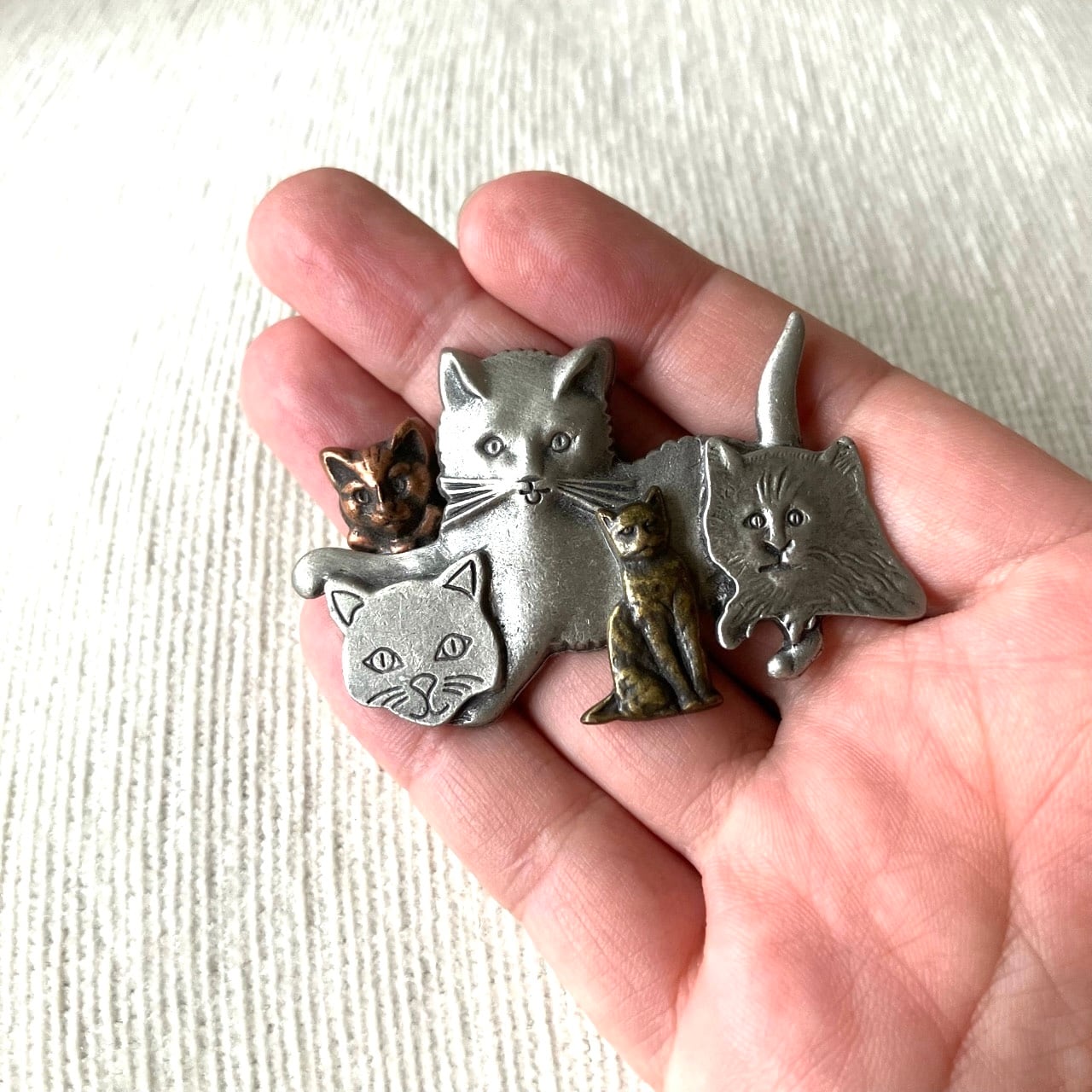 マットなシルバー、コパー、ゴールドメタルの色合いの違いがユニークな、猫たちのデザインが、とてもスペシャルで素敵なヴィンテージブローチです。