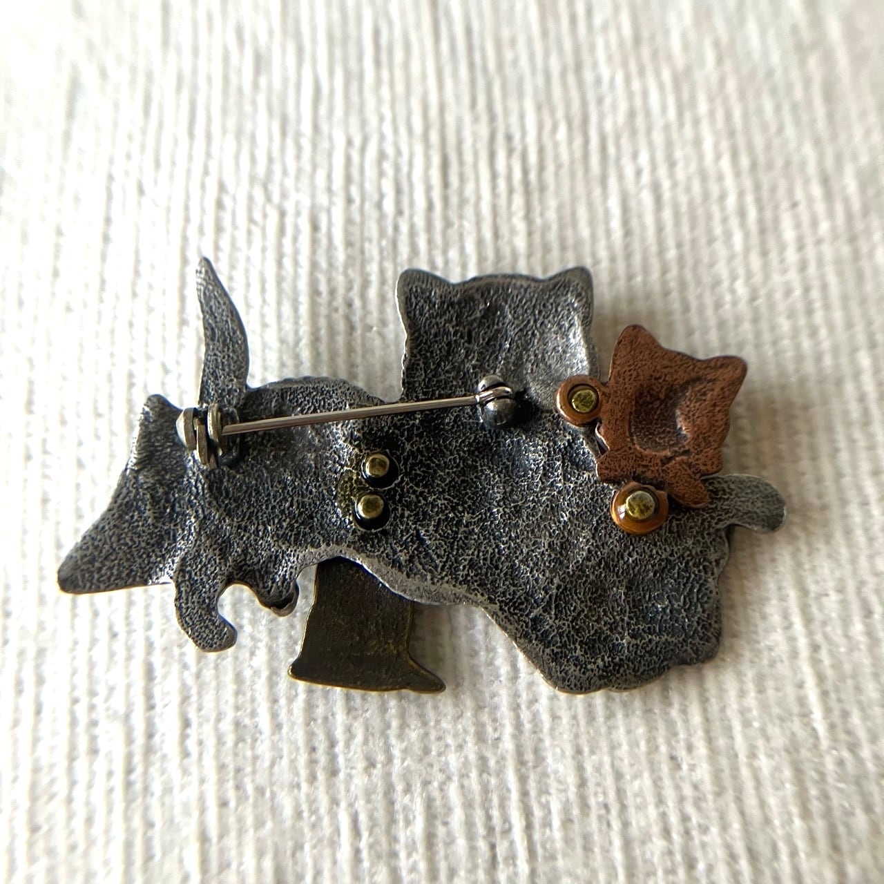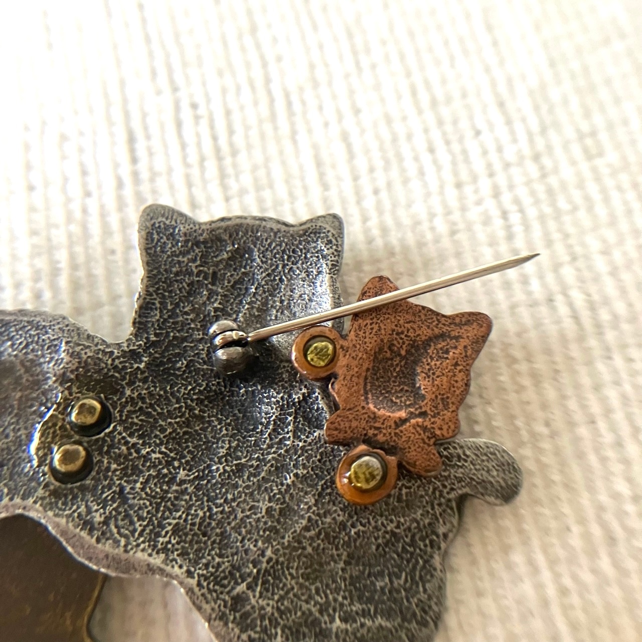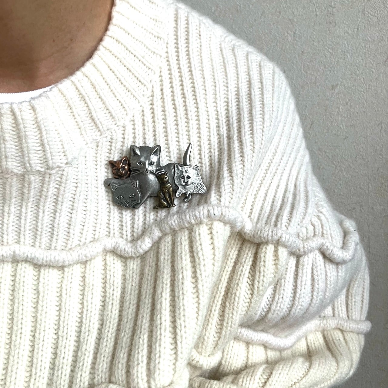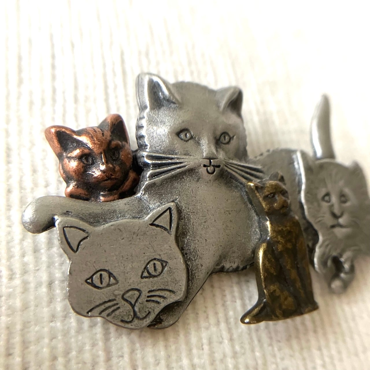 マットなシルバー、コパー、ゴールドメタルの色合いの違いがユニークな、猫たちのデザインが、とてもスペシャルで素敵なヴィンテージブローチです。