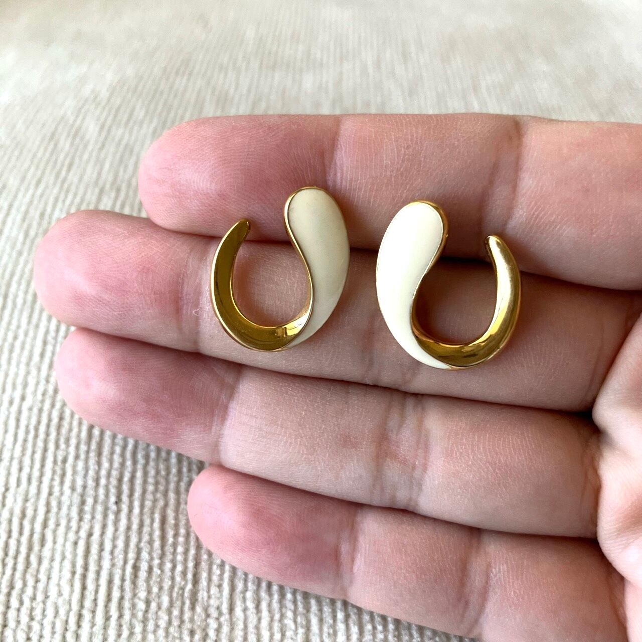 1937年にアメリカで設立された、メタルを使った高品質でモダンなデザインで人気のジュエリーメーカー"Monet"(モネ)の、ゴールドメタルとクリームエナメルのシンプルで洗練されたカーブデザインが、とてもお洒落で素敵なヴィンテージピアスです。