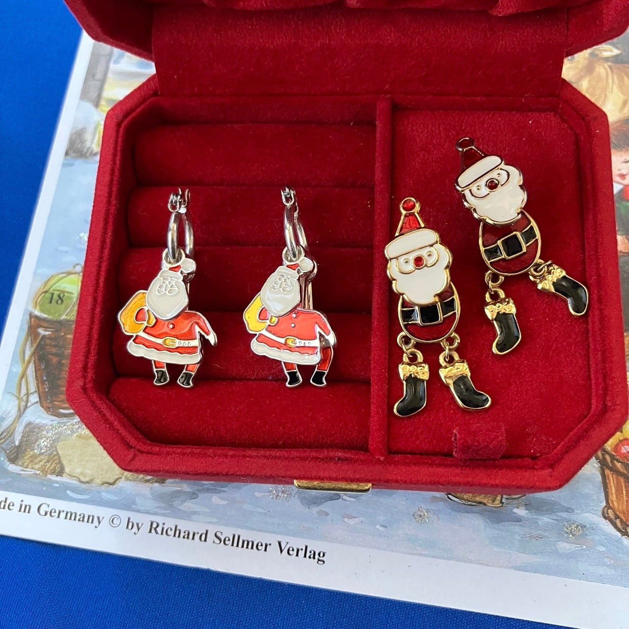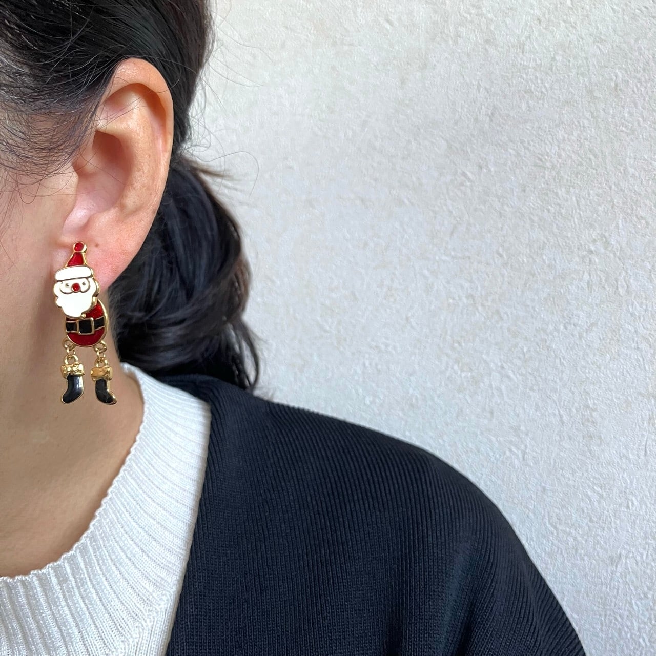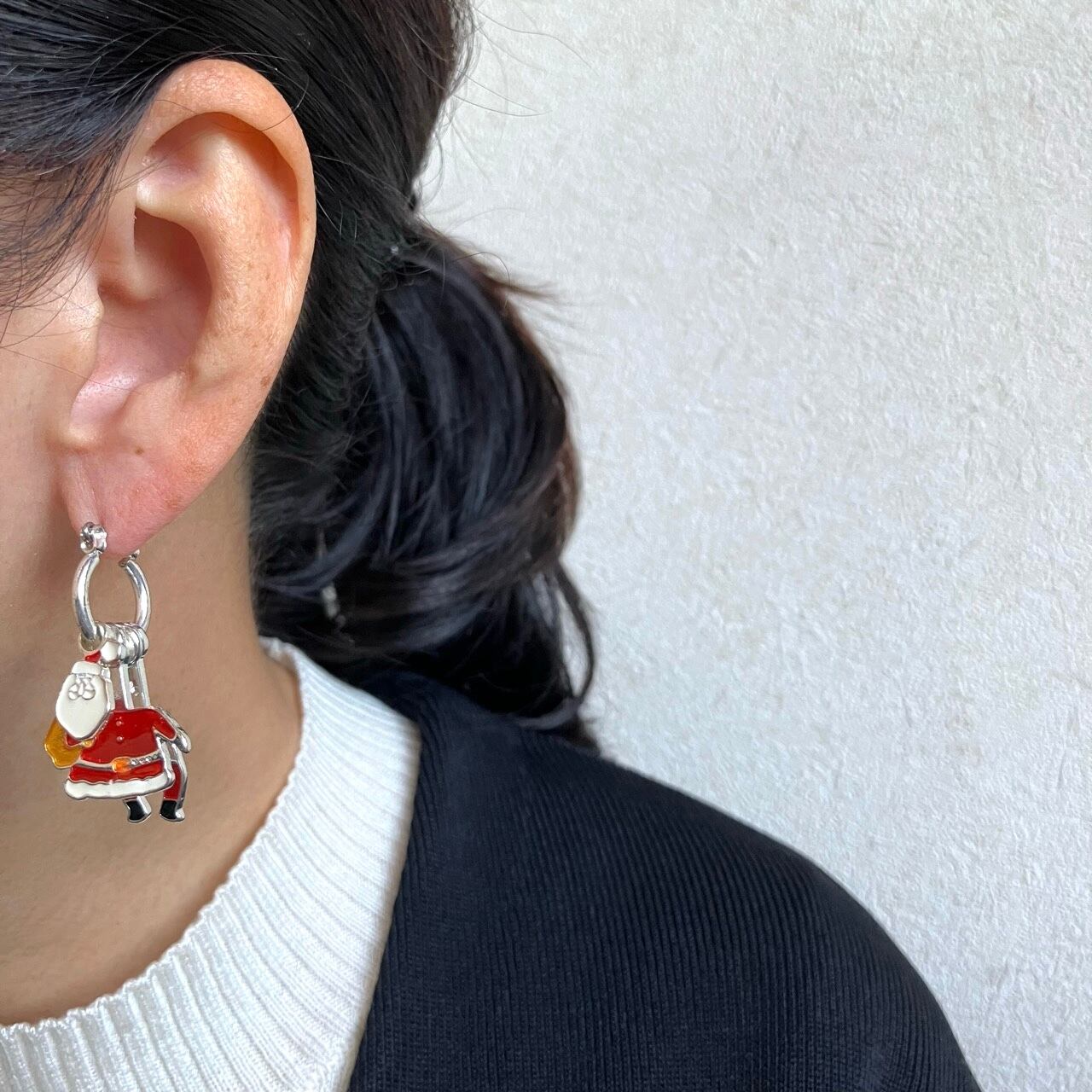 Aはシルバーメタルのフープに、カラーエナメルのサンタの3つの身体のパーツが重ねられて揺れるデザインです。