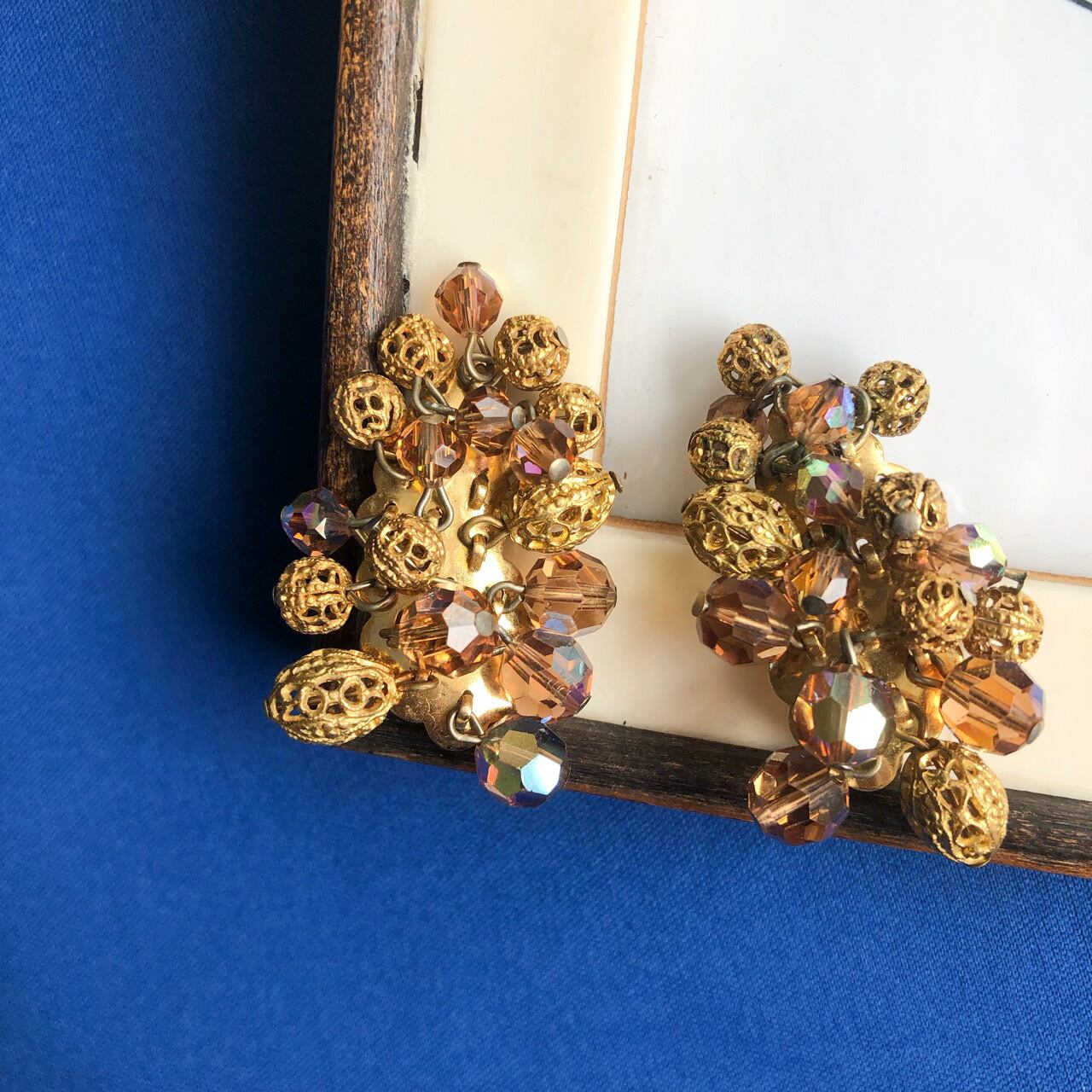 ゴールドメタルの透かし柄ビーズとクリアブラウンビーズがたっぷりと揺れるデザインが、とても素敵なヴィンテージイヤリングです。