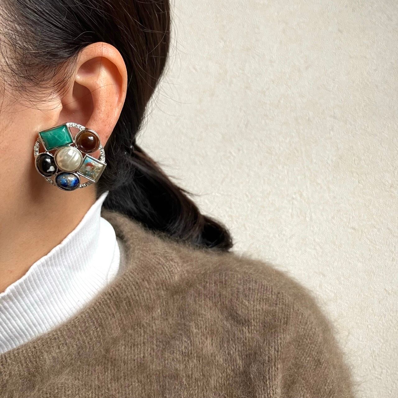 1949年に設立されたジュエリーメーカー"Sarah Coventry"(サラコベントリー)の、加工されたシルバーメタルの土台に、様々な色合いや形のストーン風のカボション、センターのパールがアクセントになった、存在感のある上品な装飾的デザインが、とても素敵なヴィンテージイヤリングです。