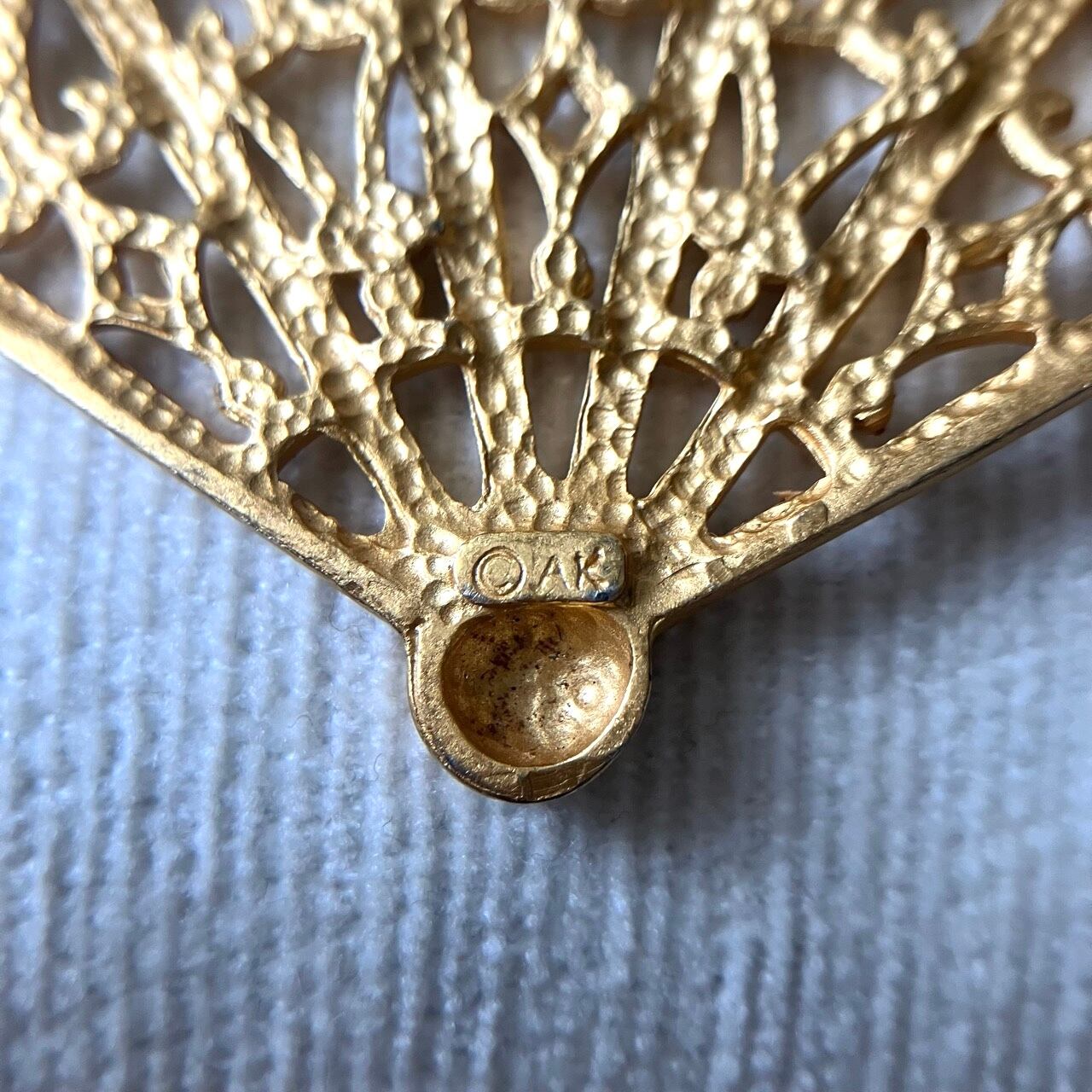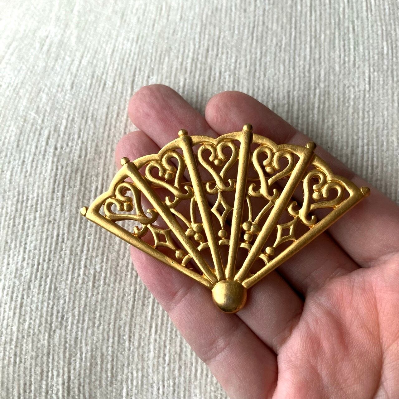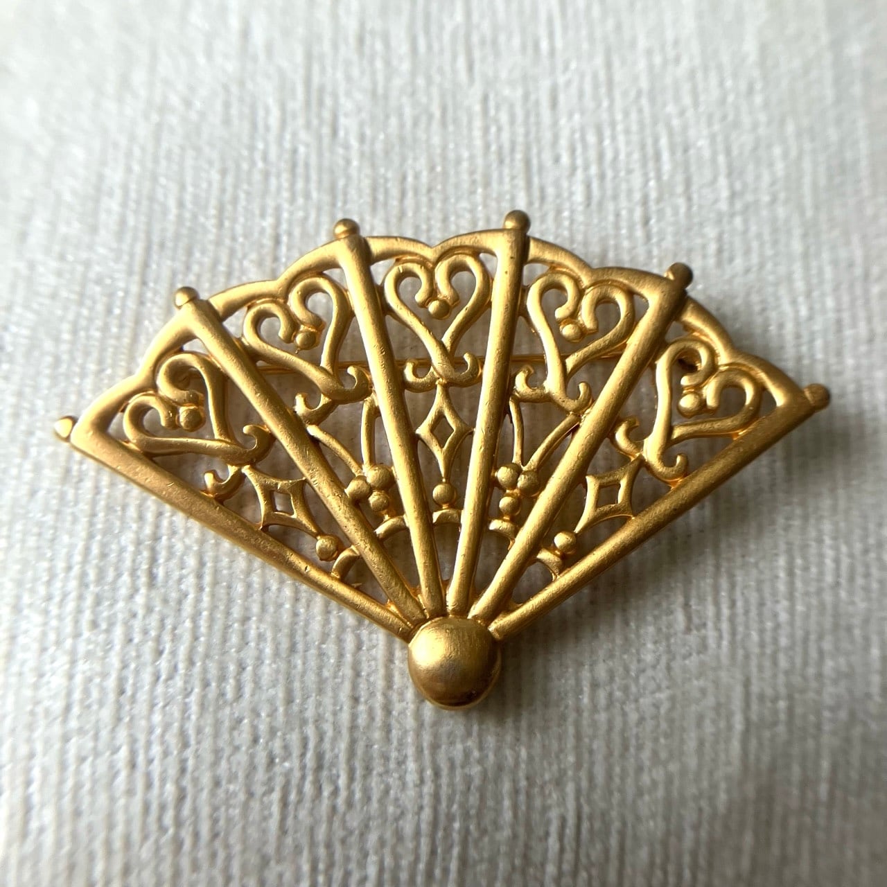 上品な雰囲気のマットなゴールドメタルの、華やかな透かし柄の扇子のデザインが、とても素敵なヴィンテージブローチです。