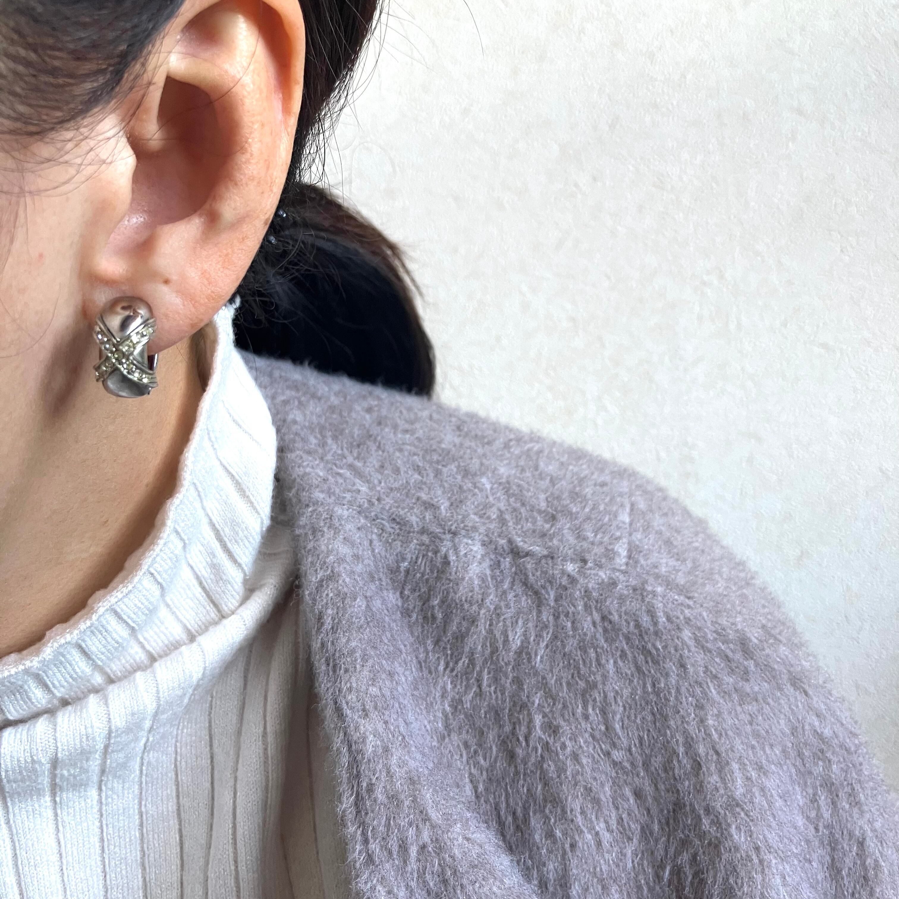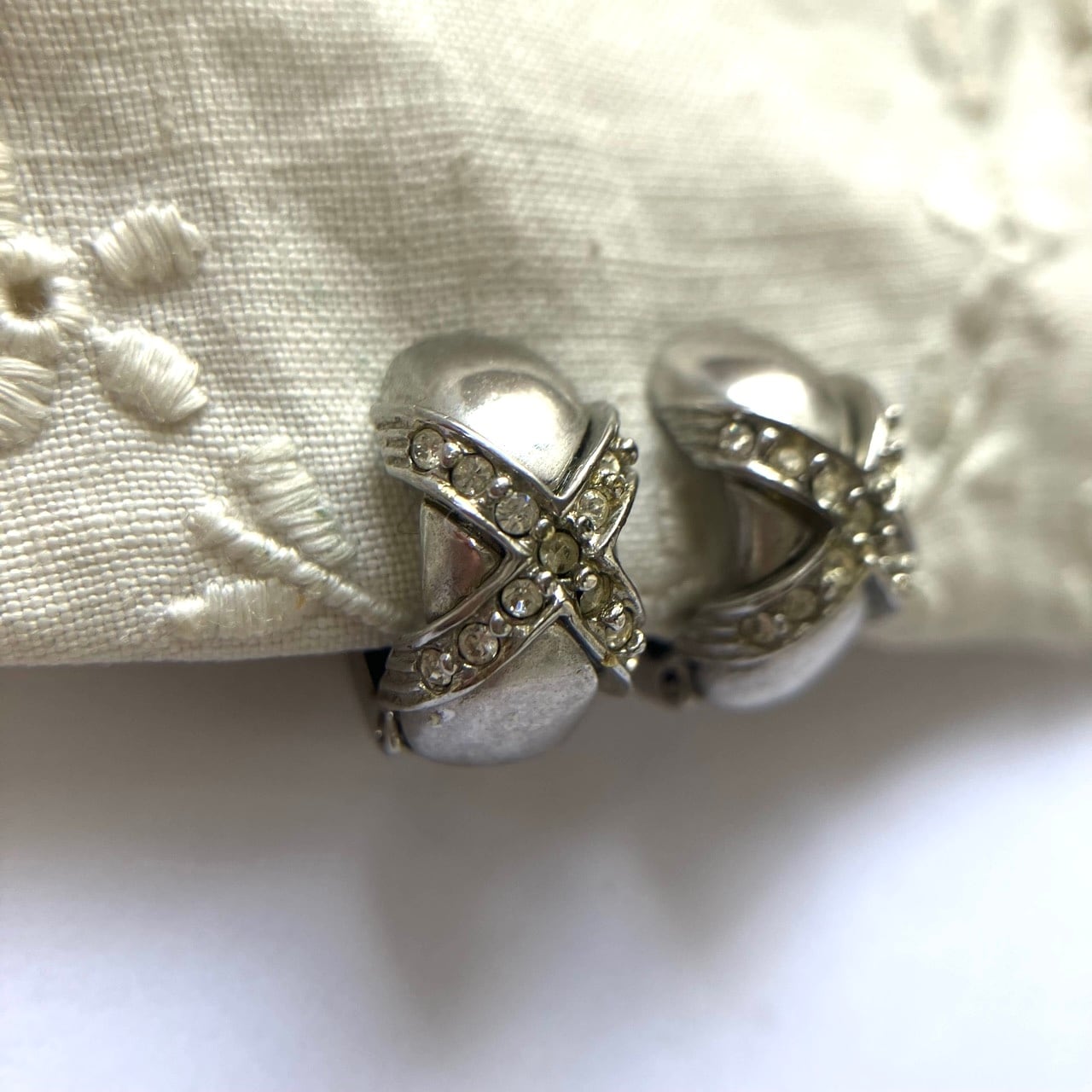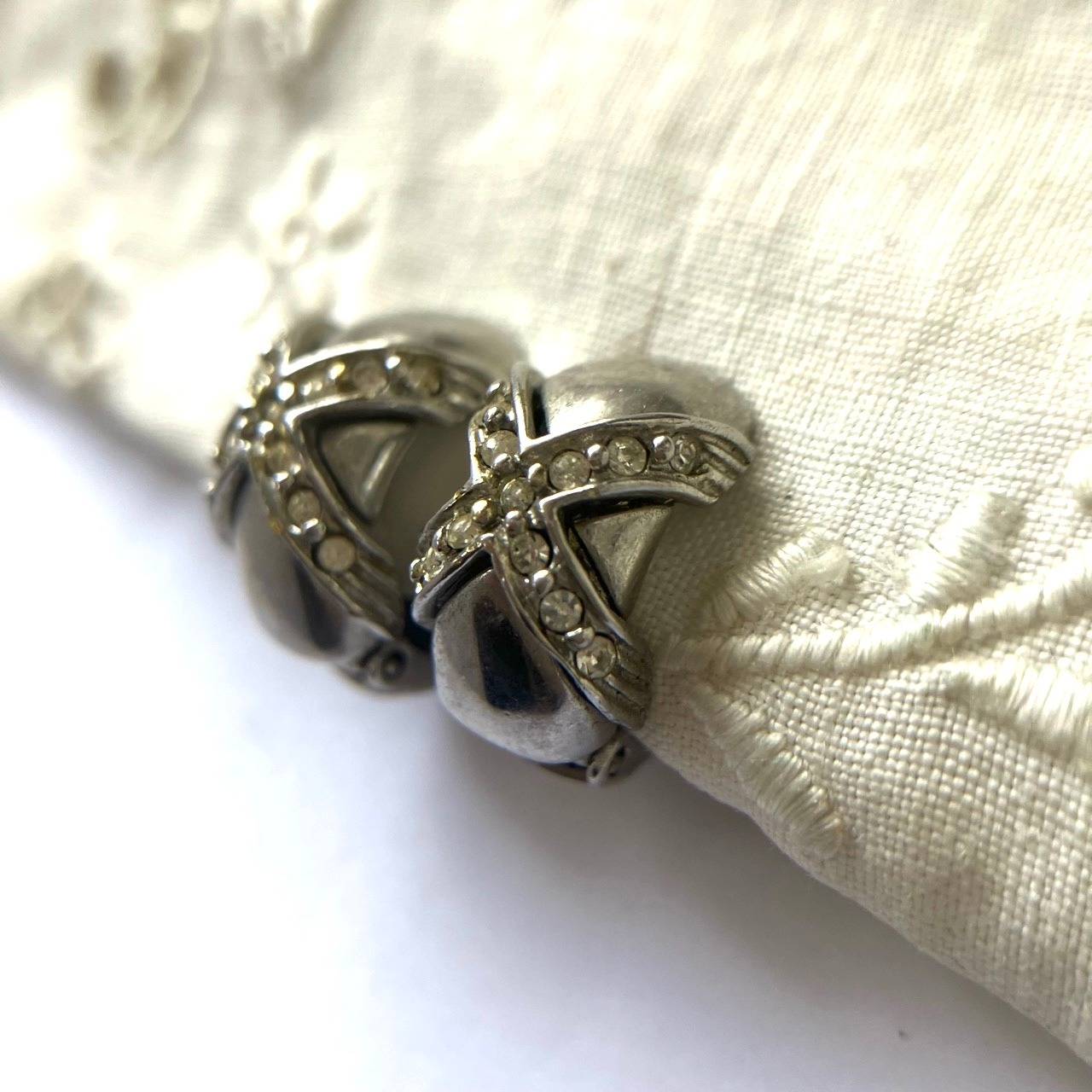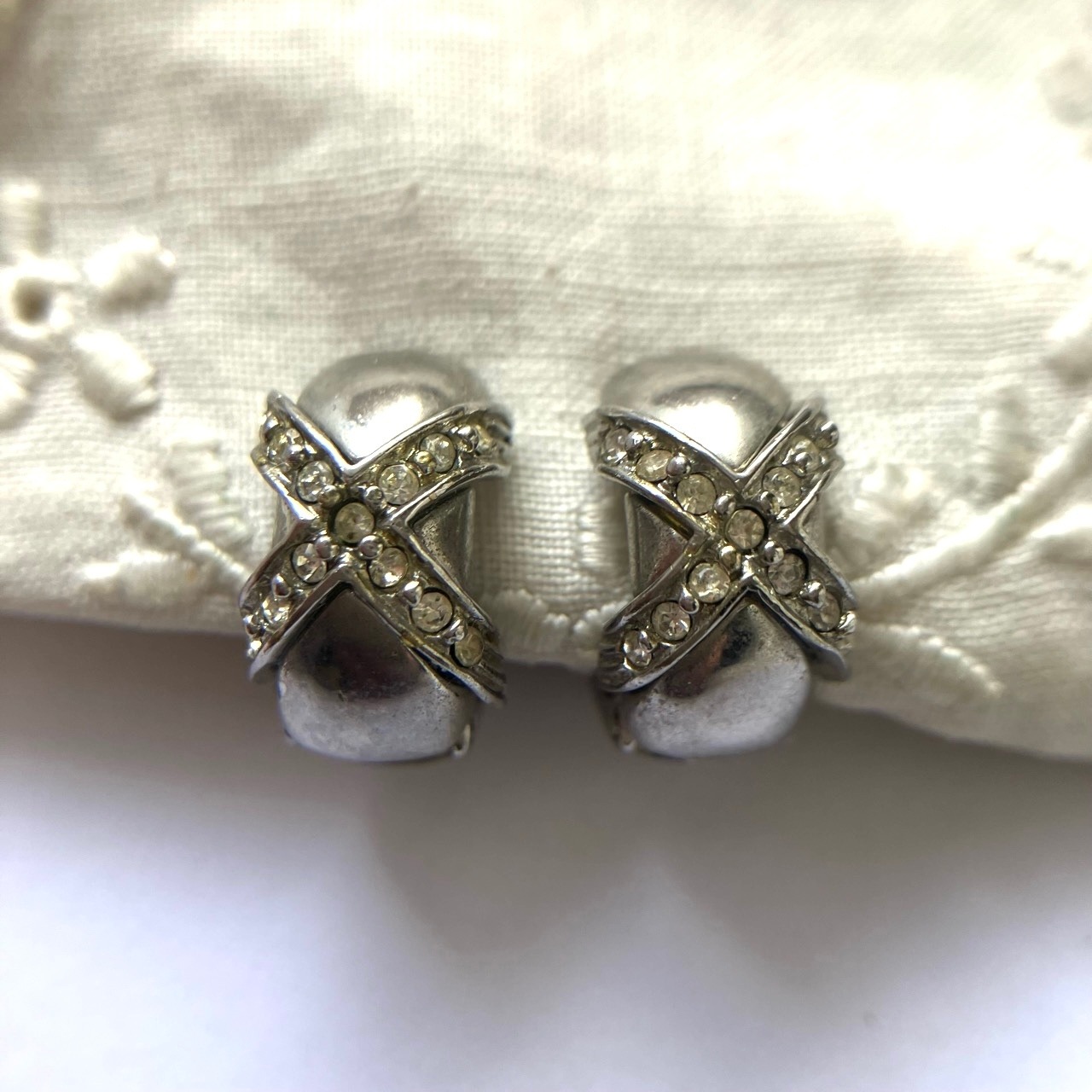 シルバーメタルのフープ型にクリアラインストーンがクロスされているデザインの、お洒落な雰囲気がとても素敵なヴィンテージイヤリングです。