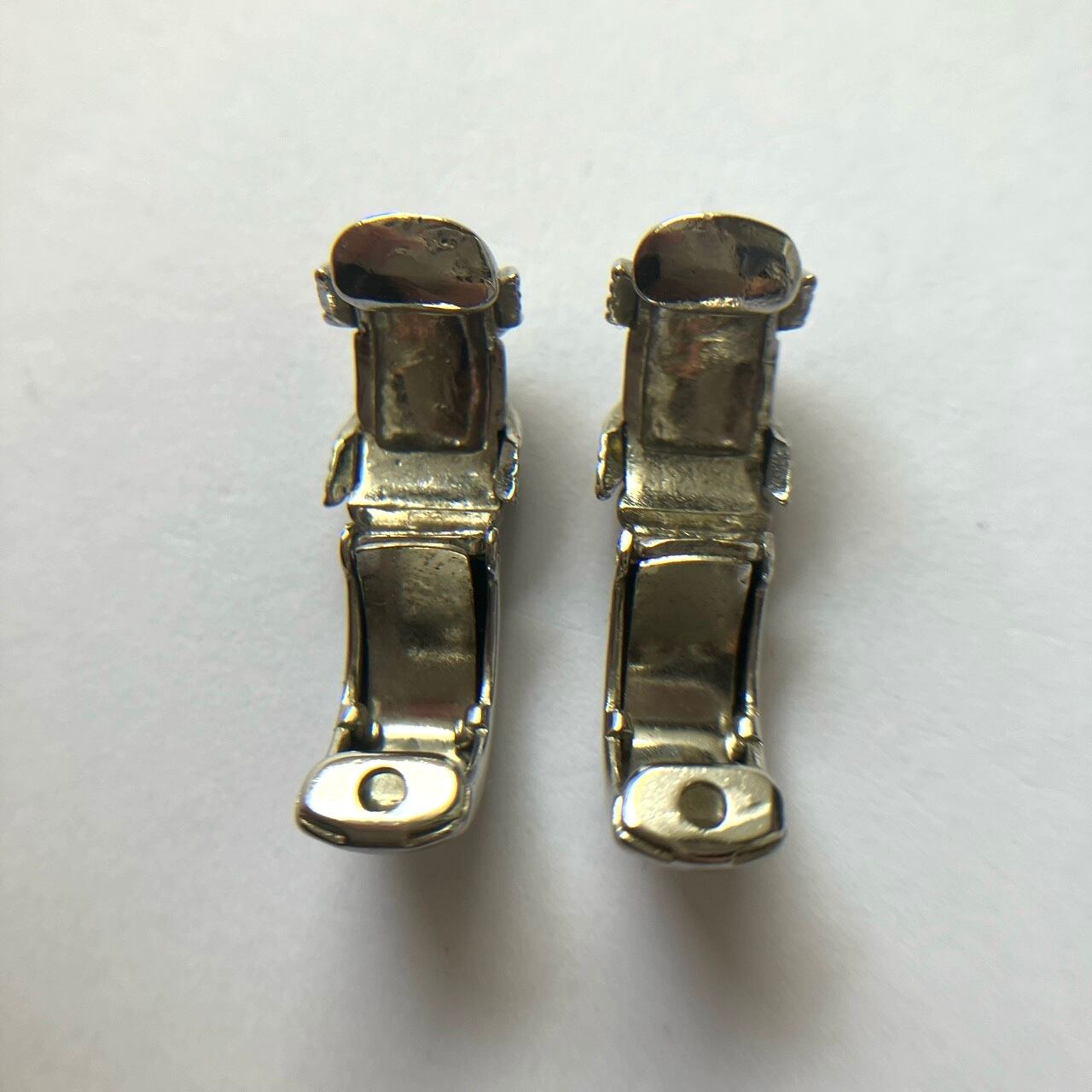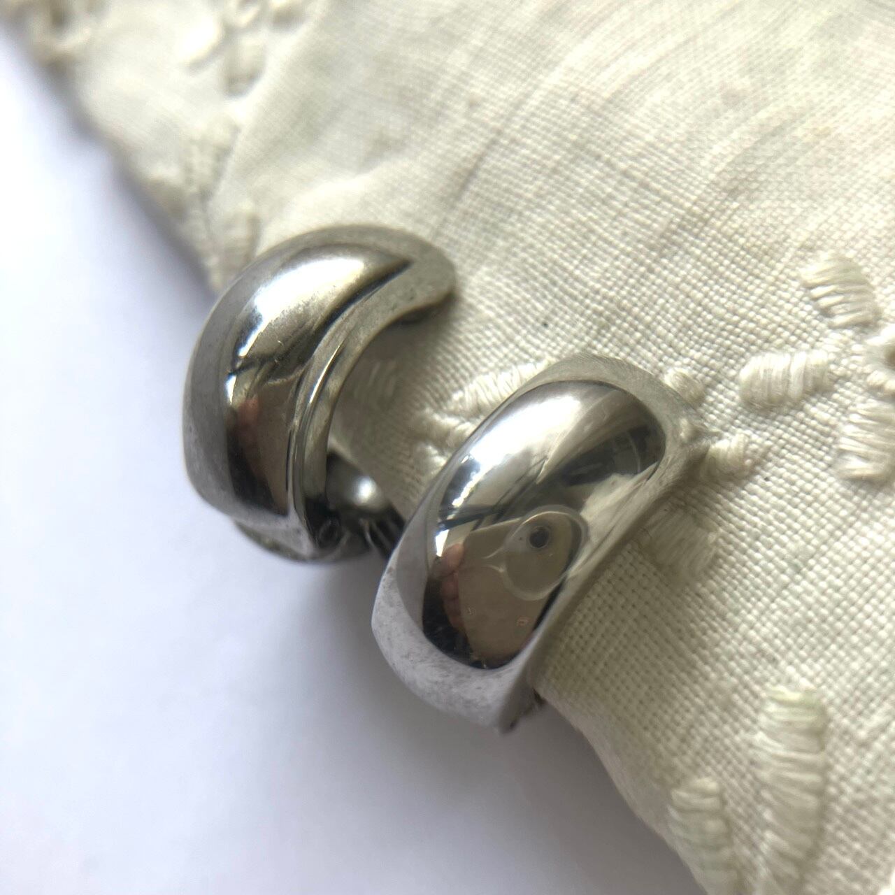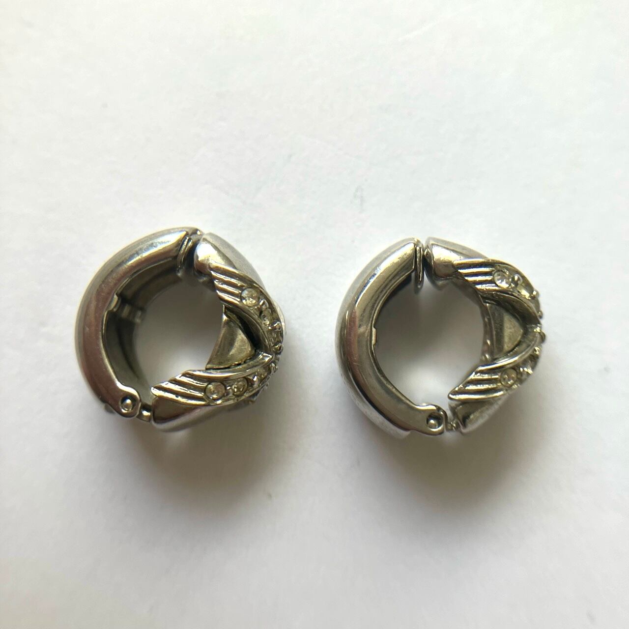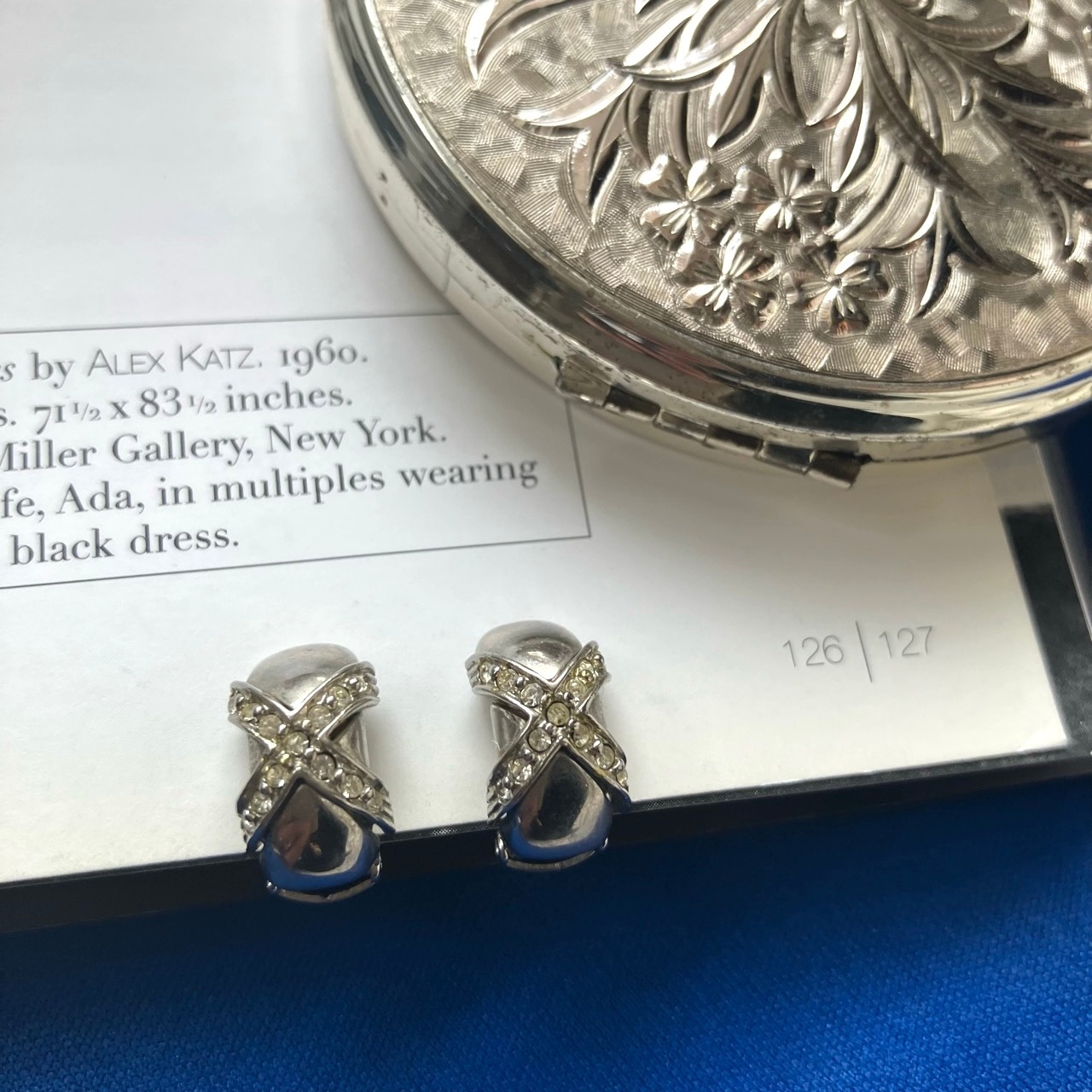 シルバーメタルのフープ型にクリアラインストーンがクロスされているデザインの、お洒落な雰囲気がとても素敵なヴィンテージイヤリングです。