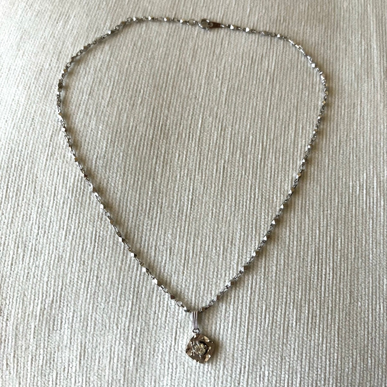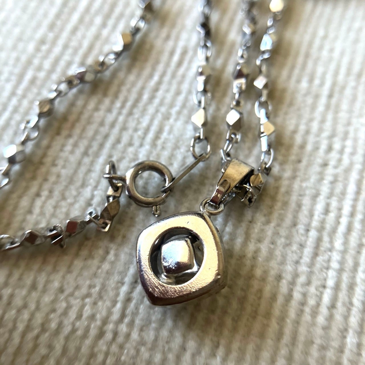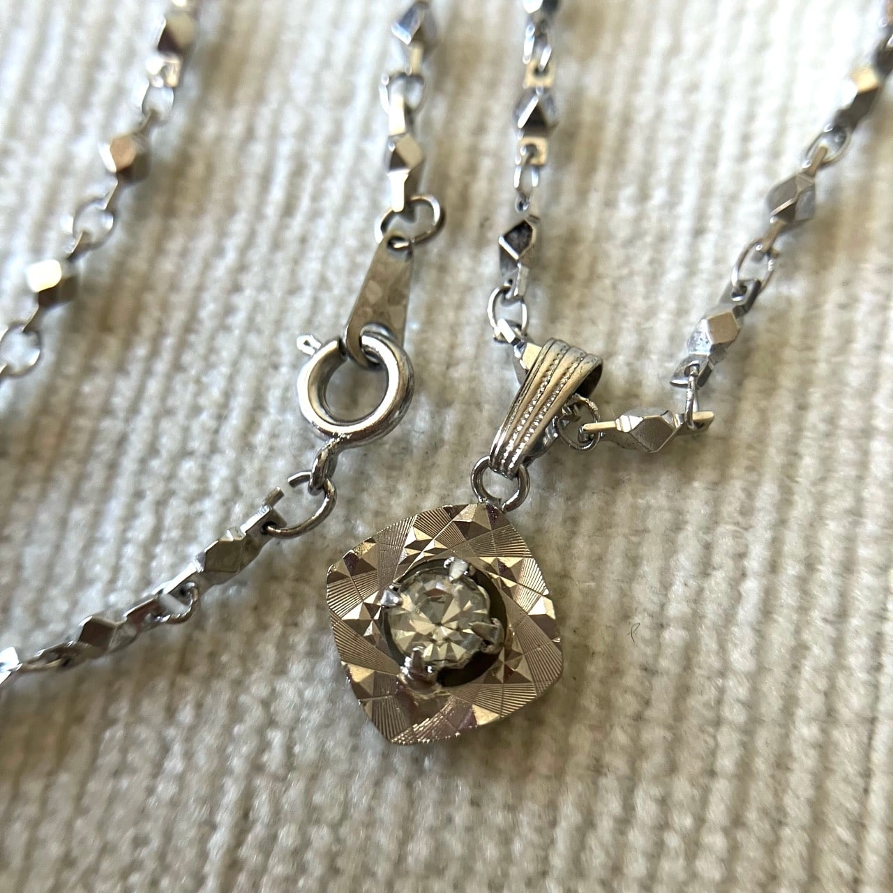反射の輝きが美しいシルバーメタルに一粒のラインストーンがセットされた、とても素敵なヴィンテージネックレスです。