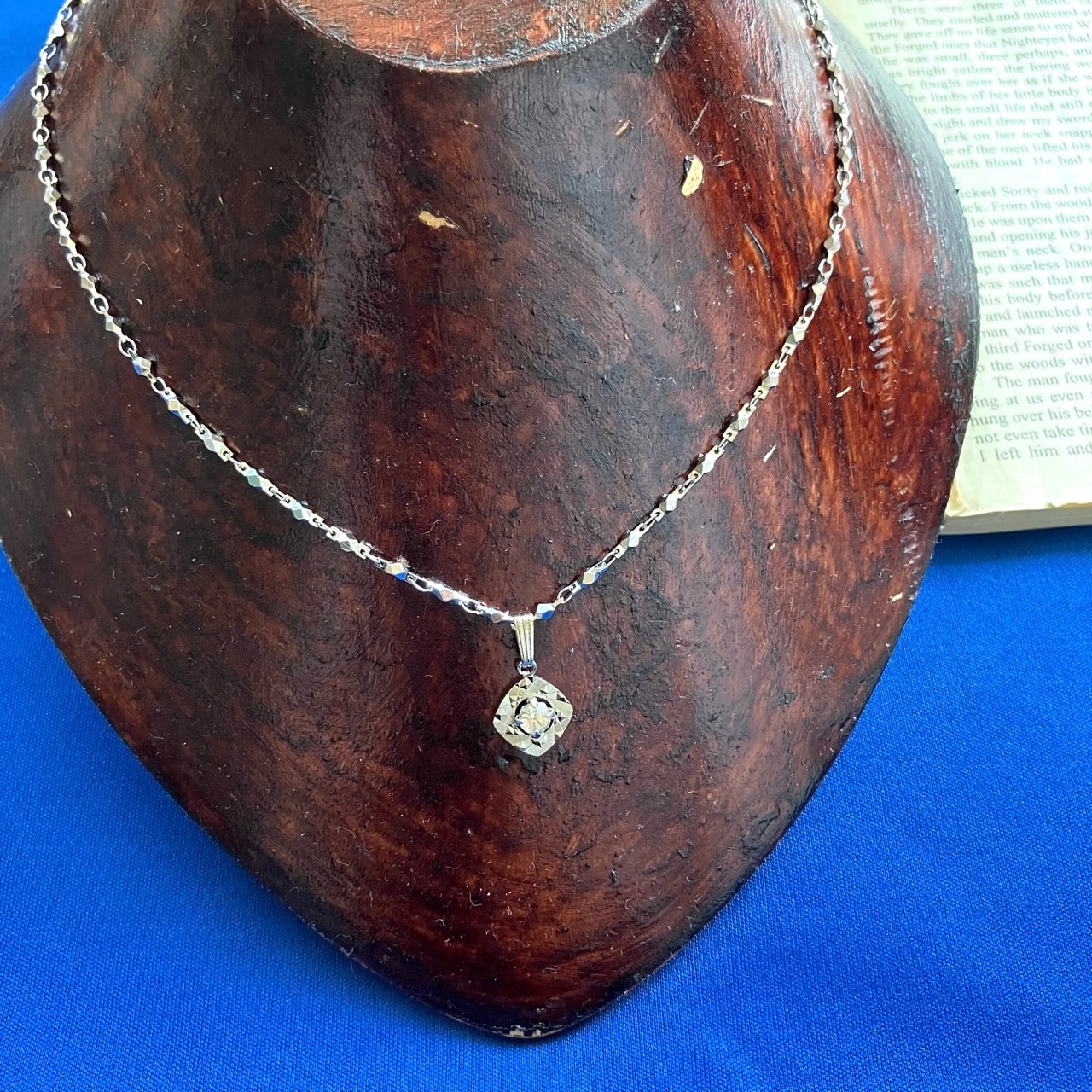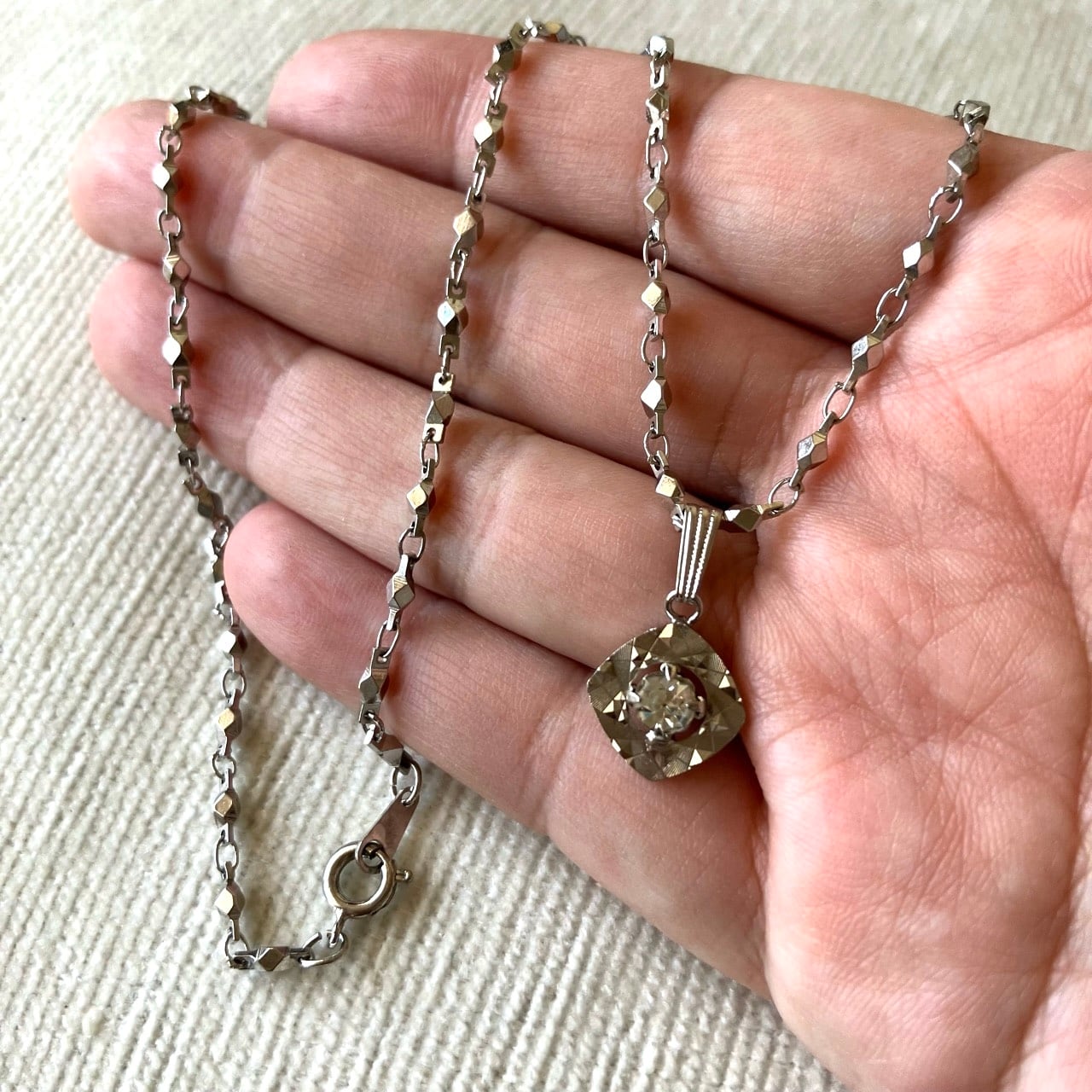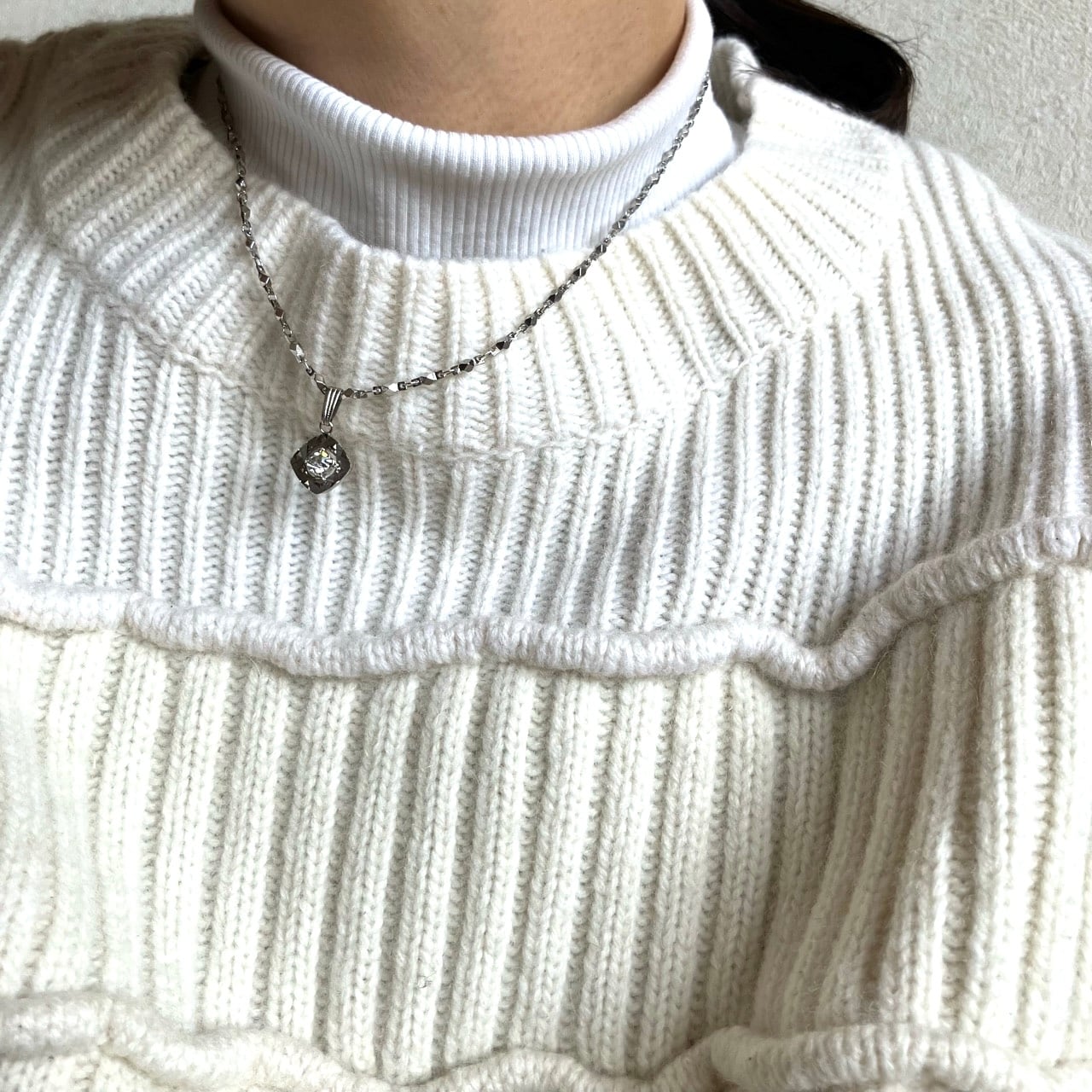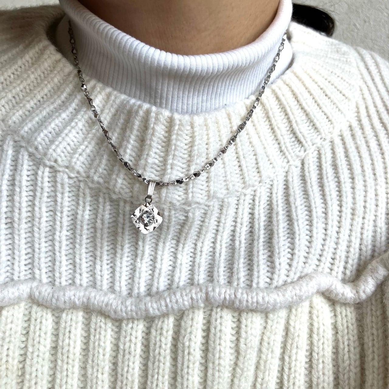 反射の輝きが美しいシルバーメタルに一粒のラインストーンがセットされた、とても素敵なヴィンテージネックレスです。