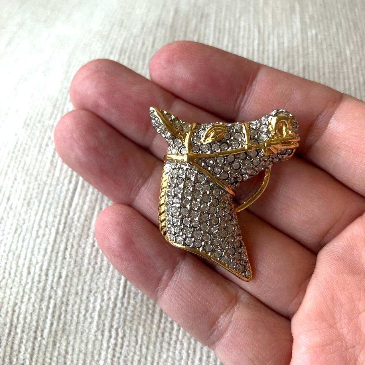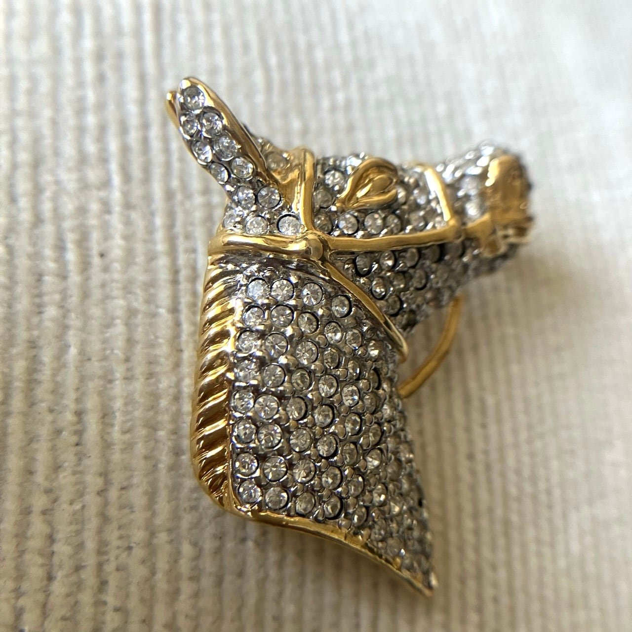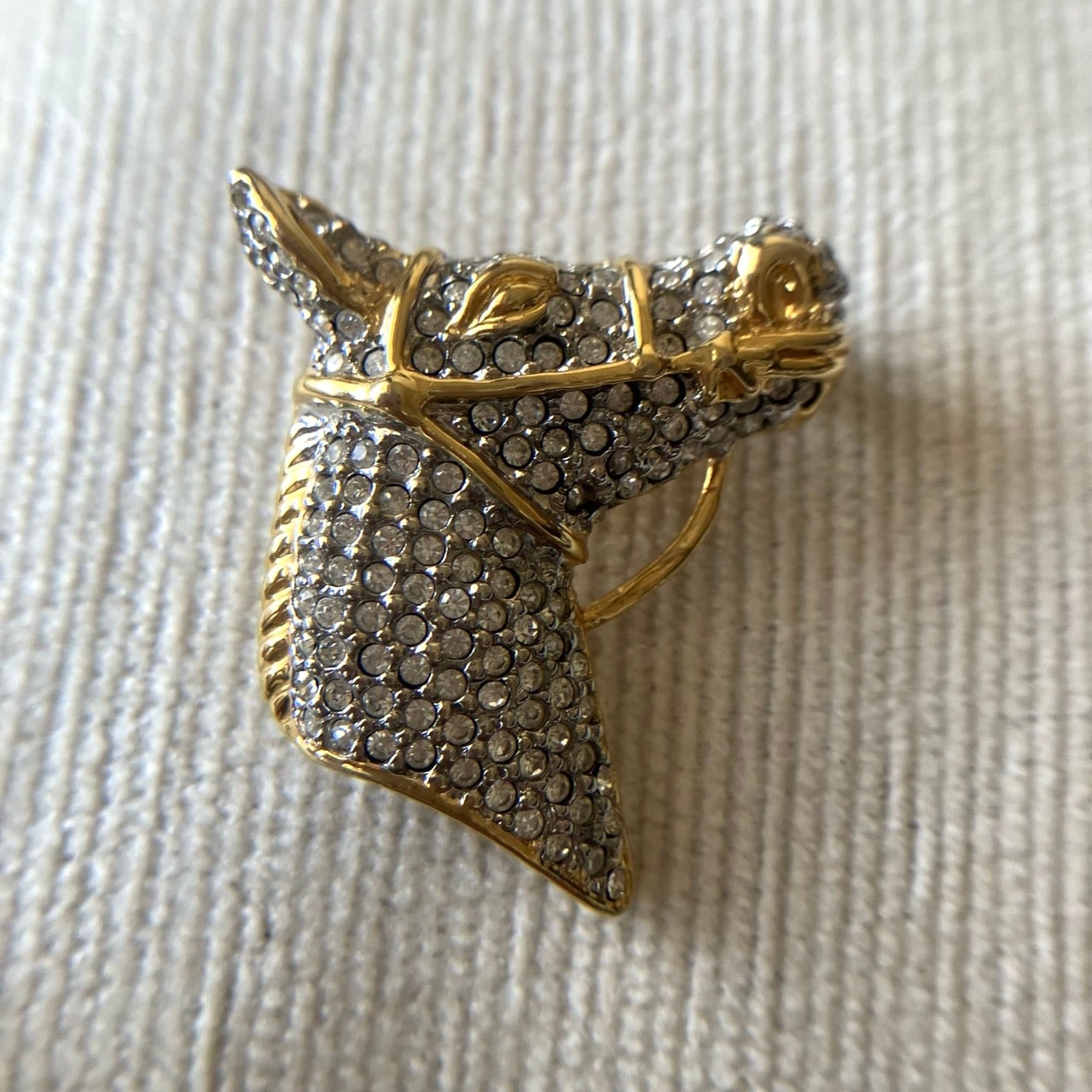 ゴールドメタルに小粒のクリアラインストーンが華やかな、立体感のある美しい馬のデザインが、とても素敵なヴィンテージブローチです。