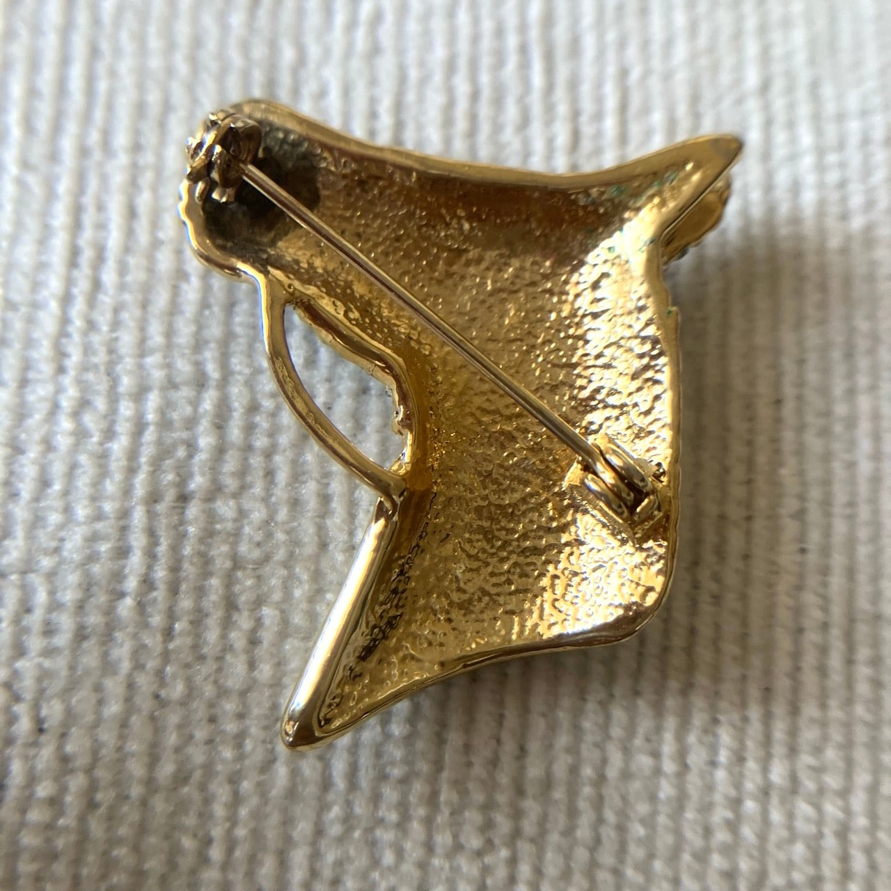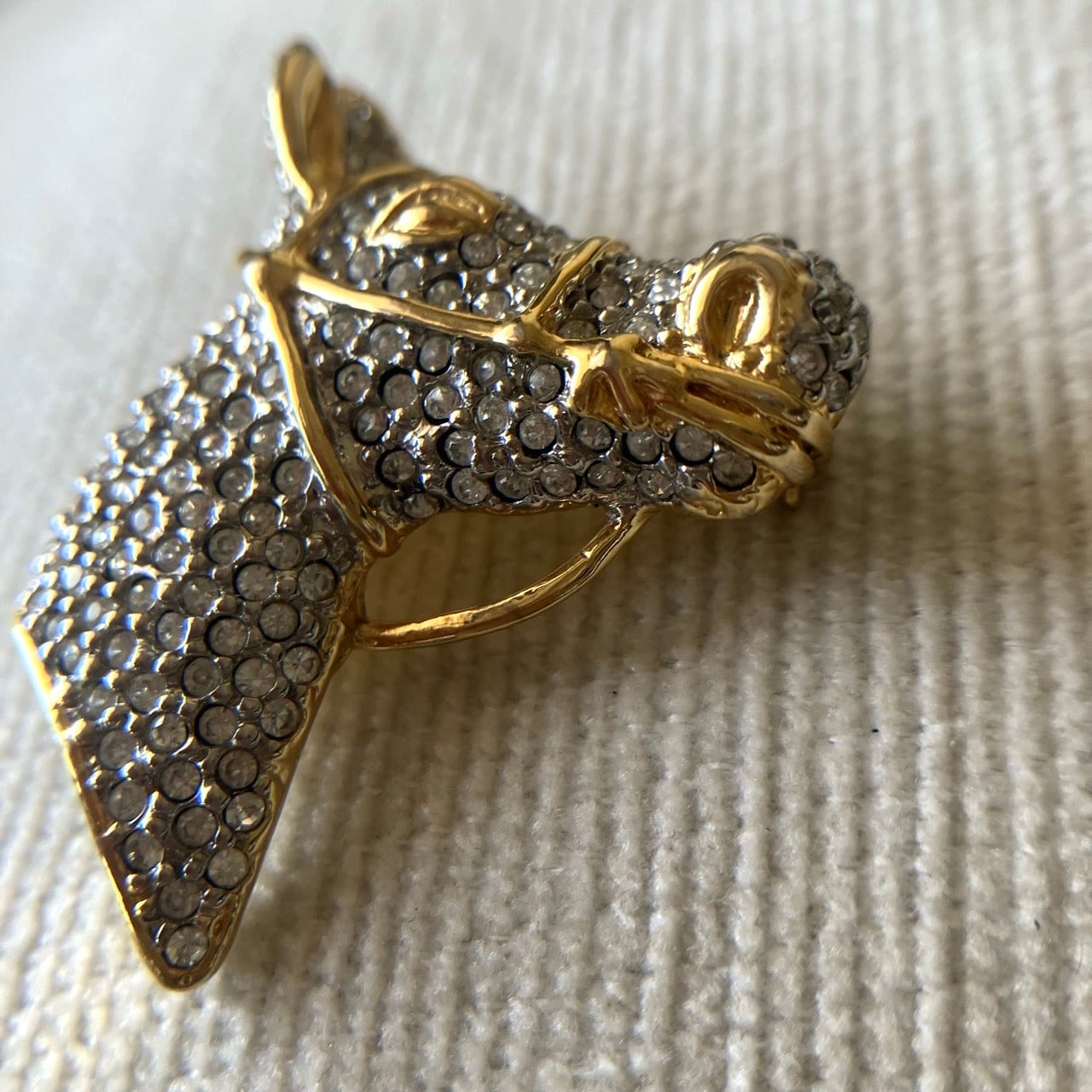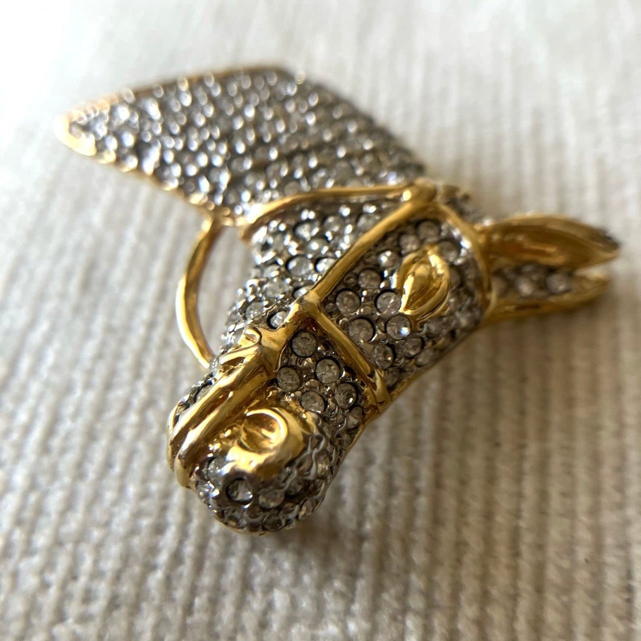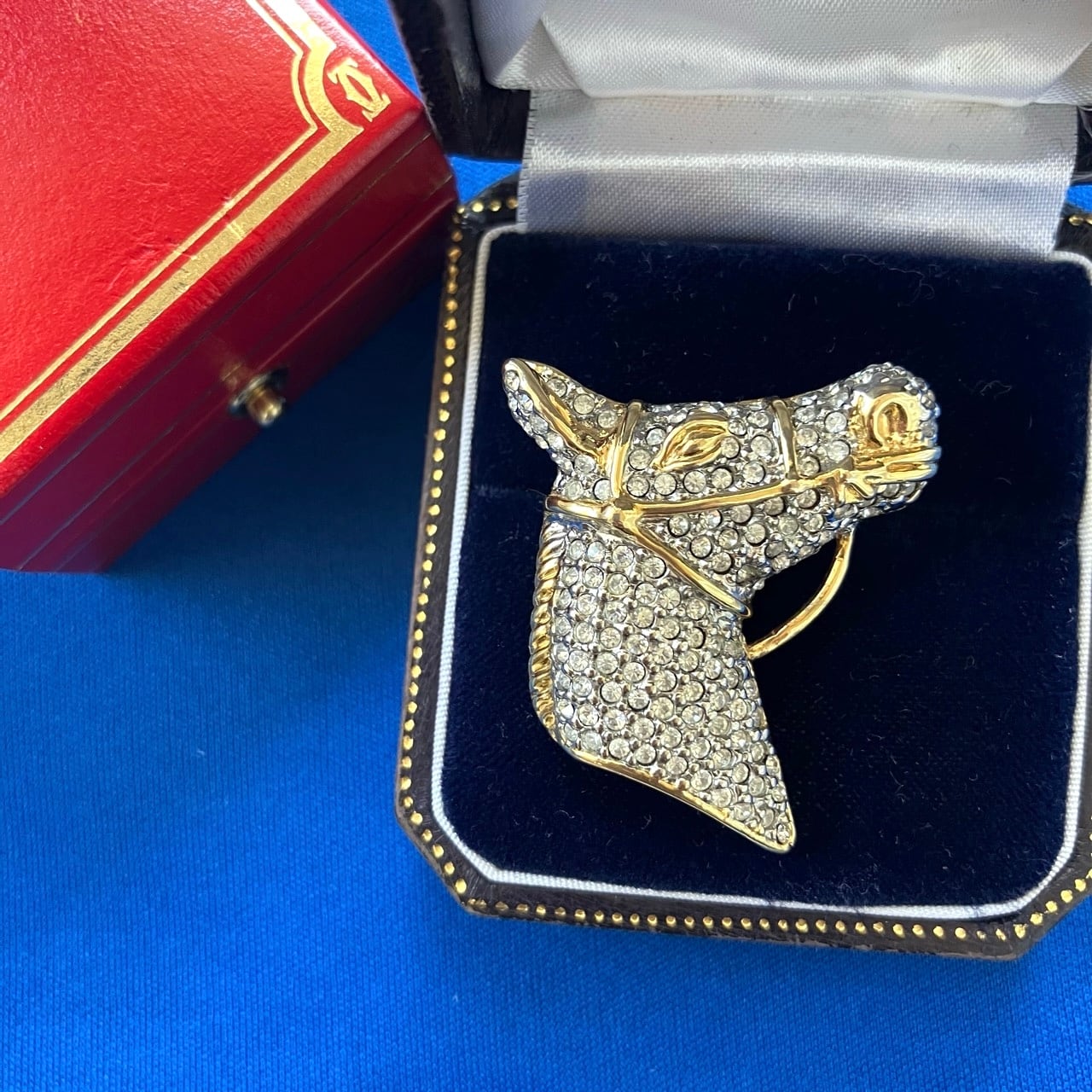 ゴールドメタルに小粒のクリアラインストーンが華やかな、立体感のある美しい馬のデザインが、とても素敵なヴィンテージブローチです。