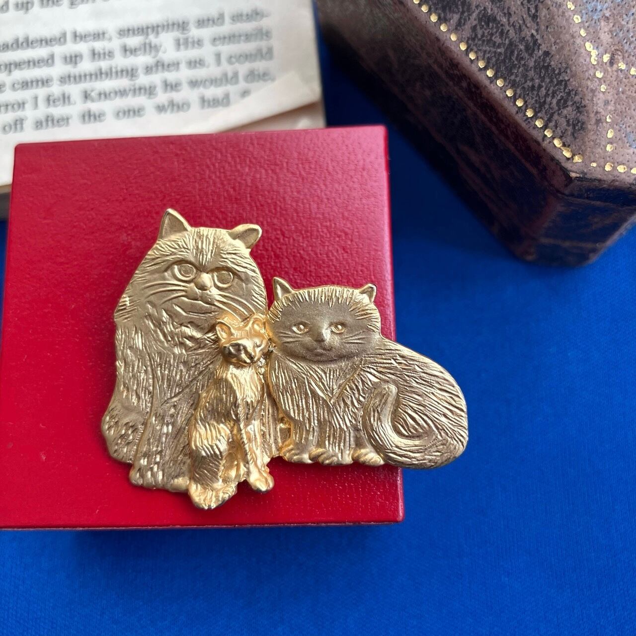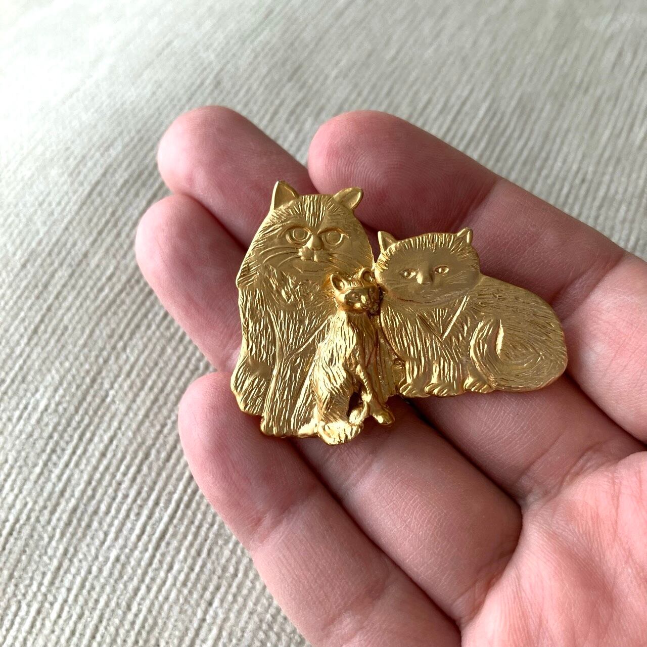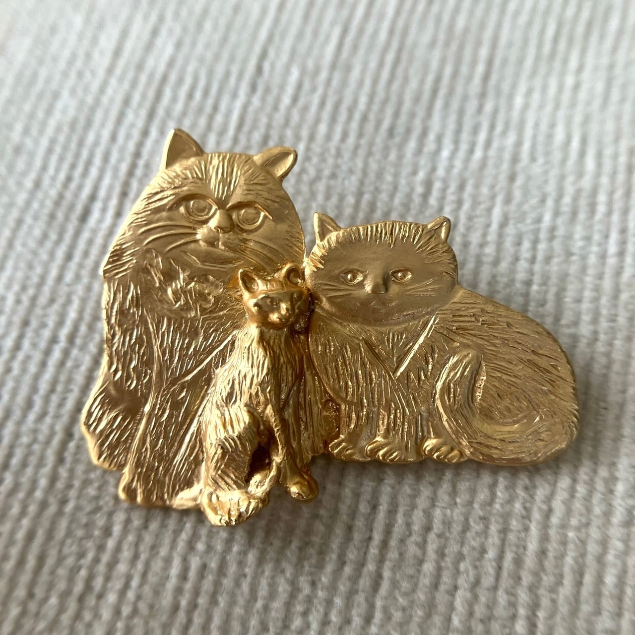 マットな明るいゴールドメタルの3匹の愛らしくユニークな猫たちのデザインが、とても素敵なヴィンテージブローチです。